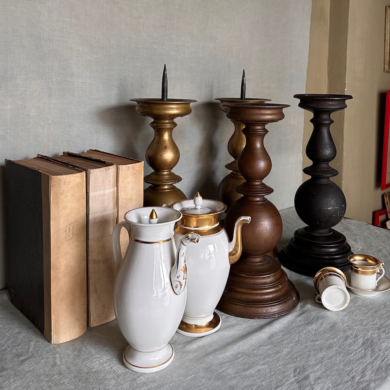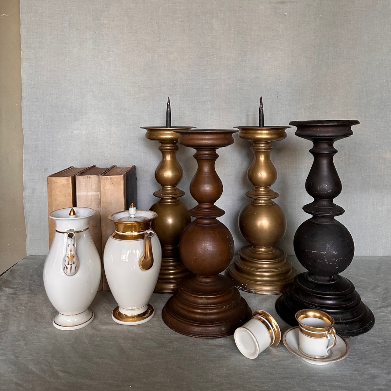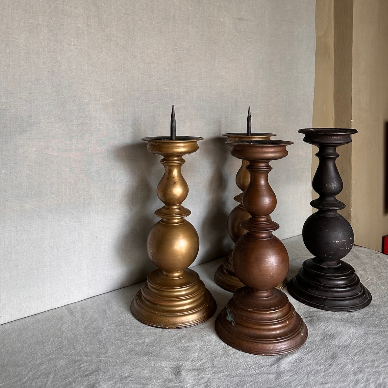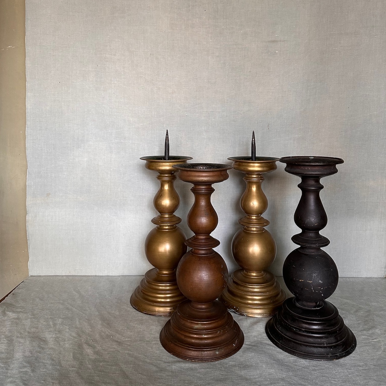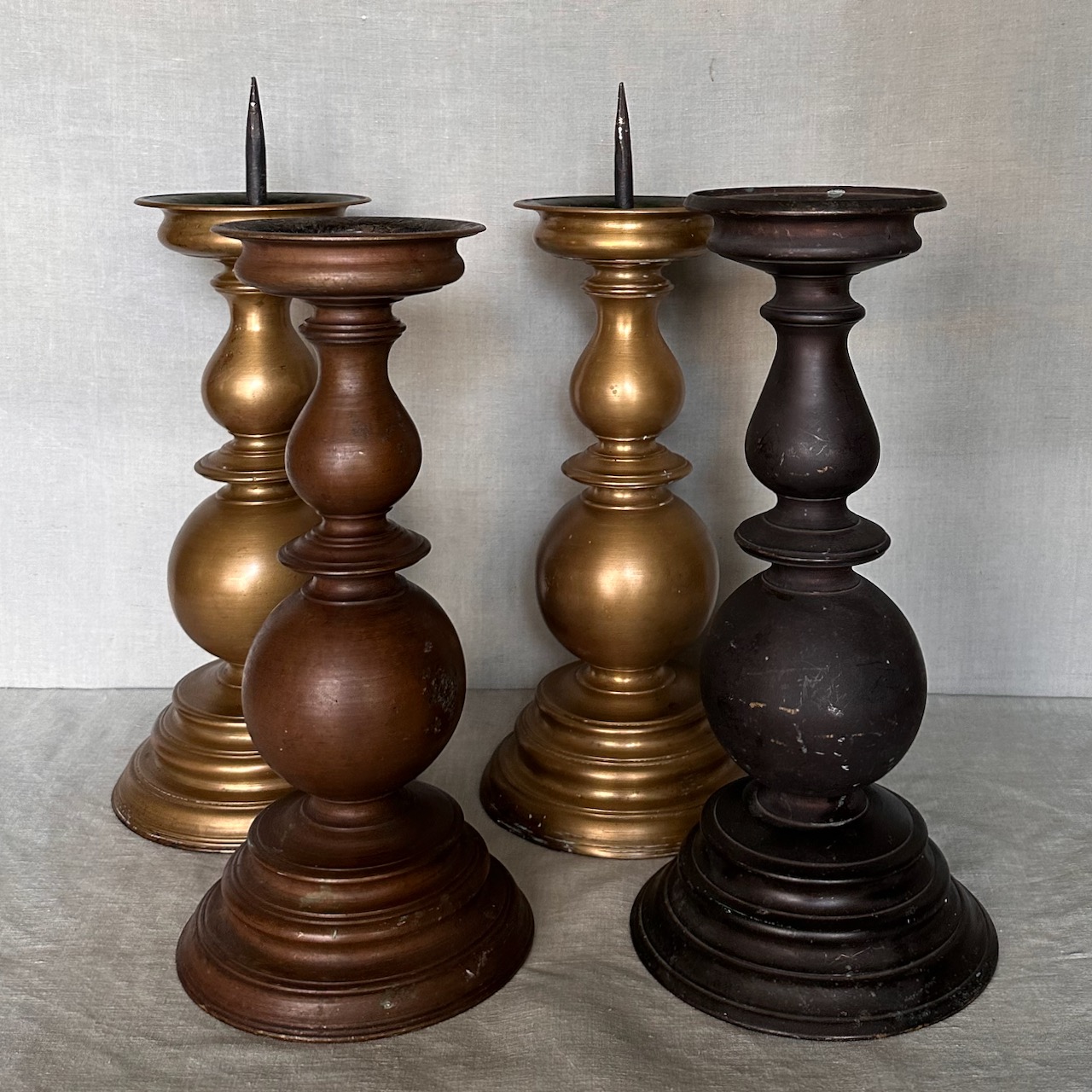 Collezione quattro grandi torcere a balaustro bronzo, bronzo dorato e bronzo patinato nero. Italia, sec. XIX