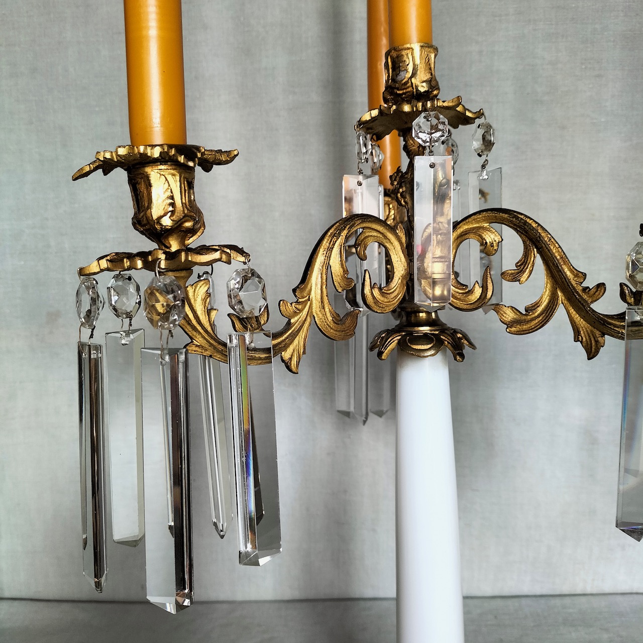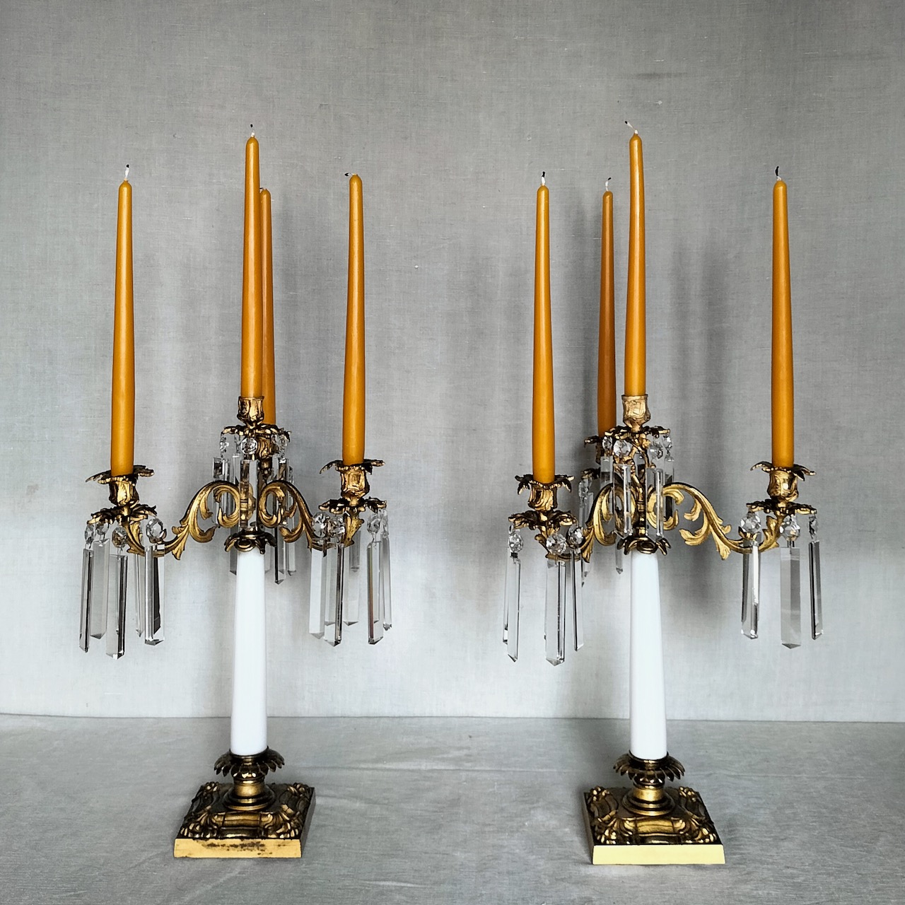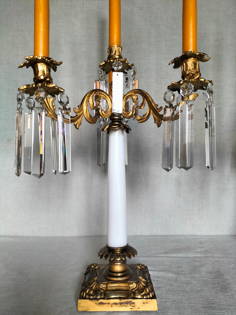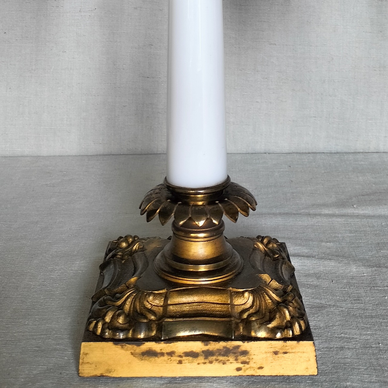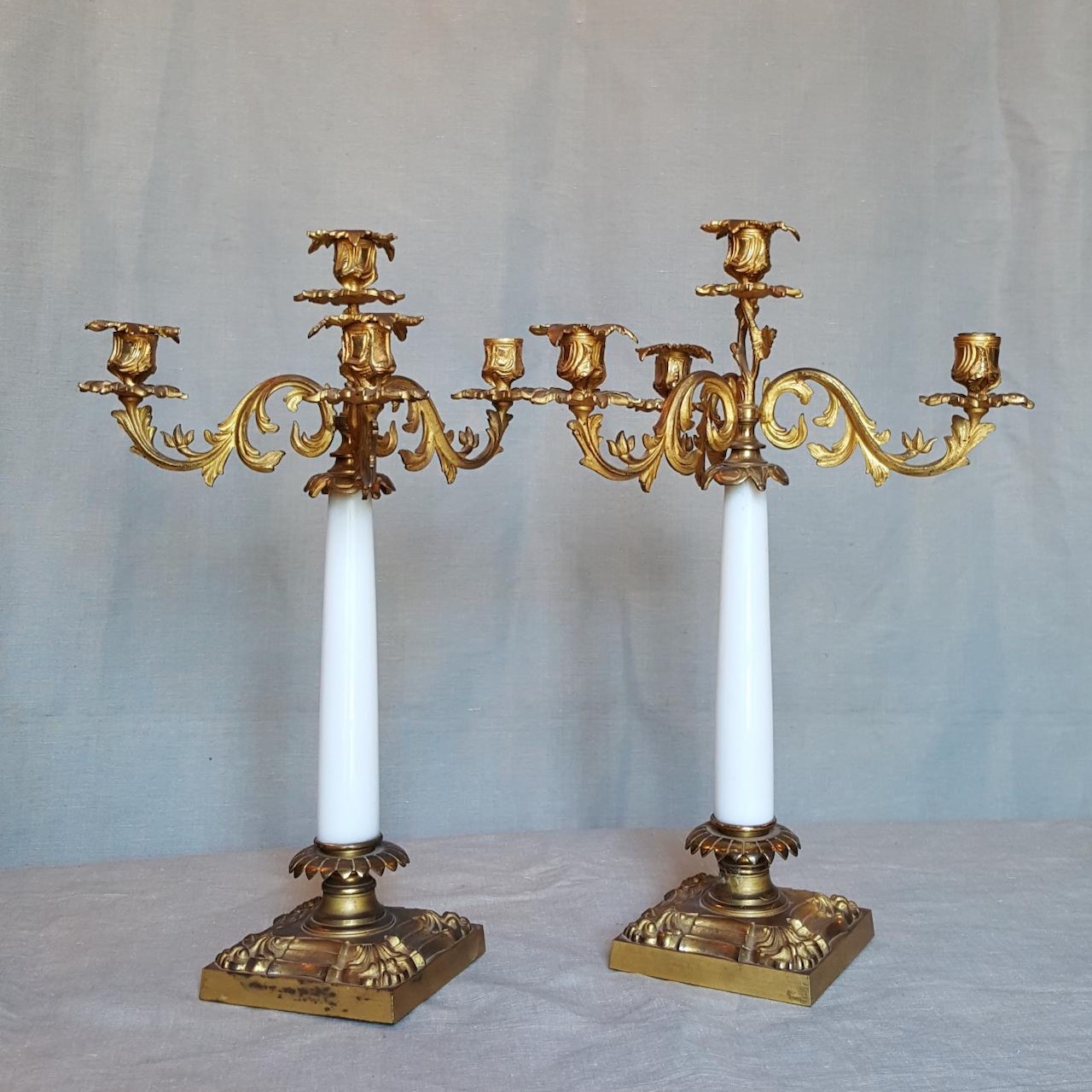 Coppia di grandi candelabri a base quadrata, bronzo dorato, fusto rastremato in opalina, tre bracci sagomati a volute vegetali, per complessive quattro luci. Toscana, metà sec. XIX