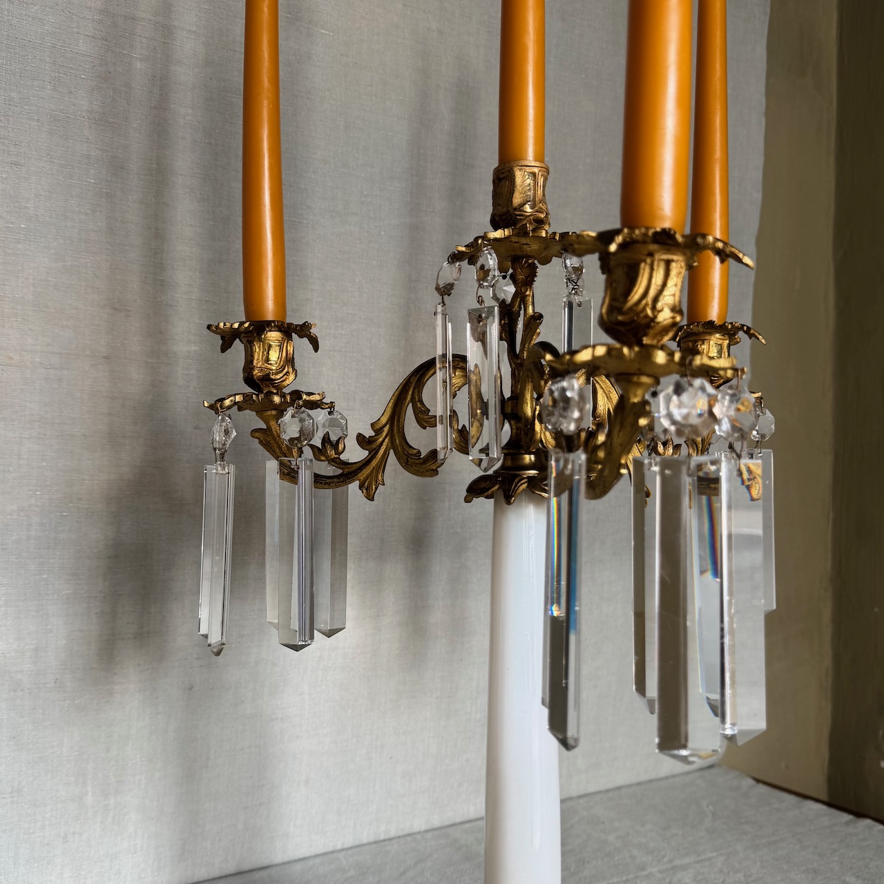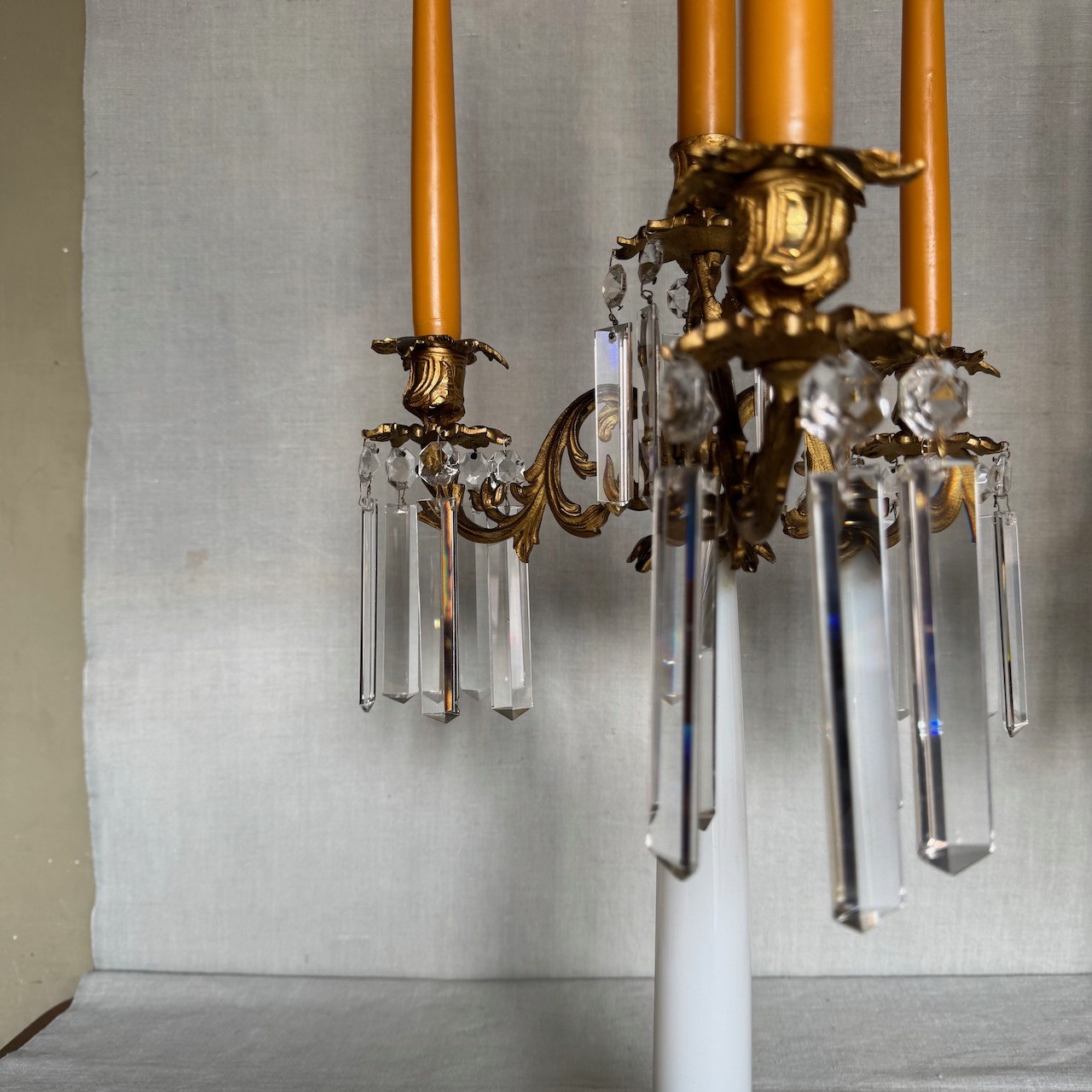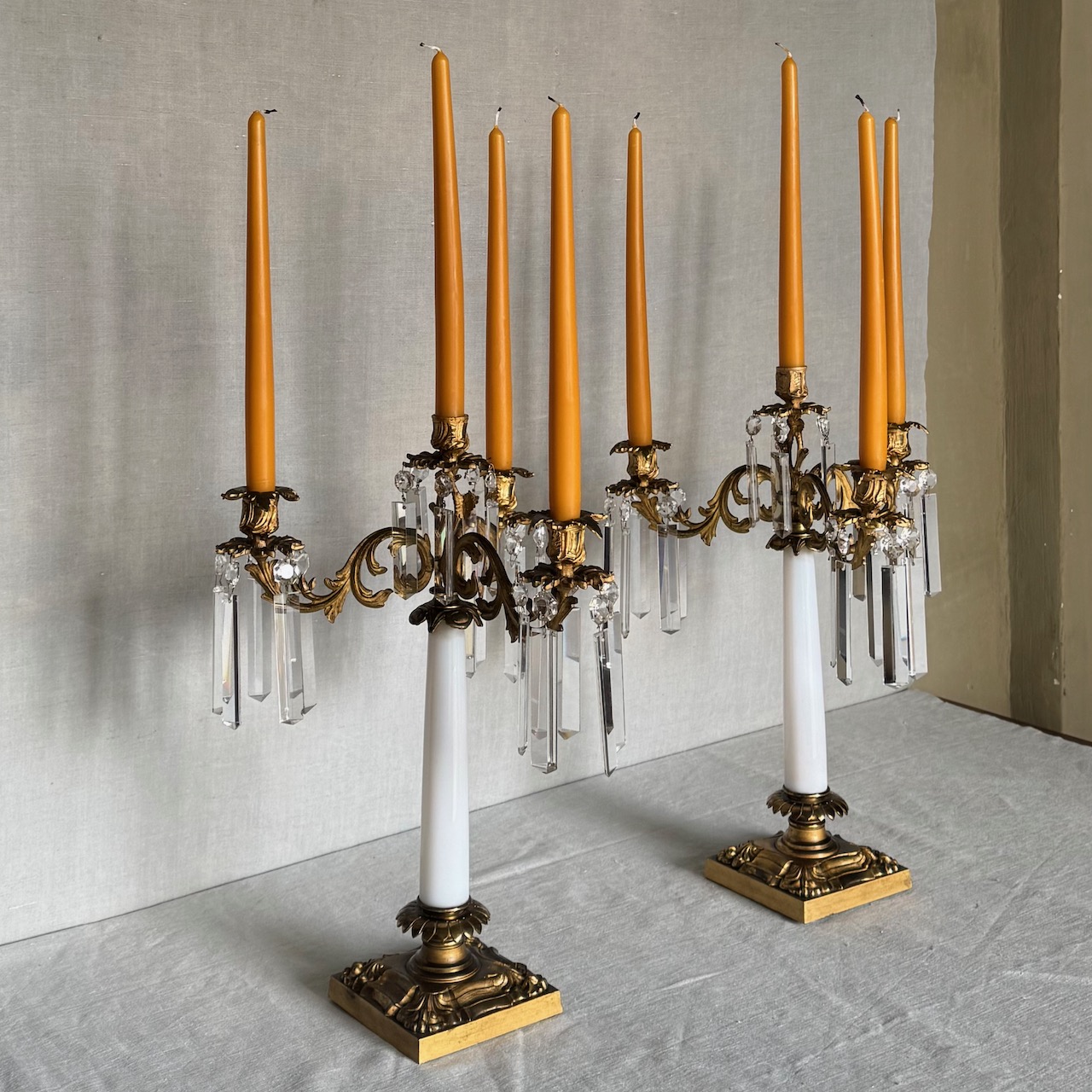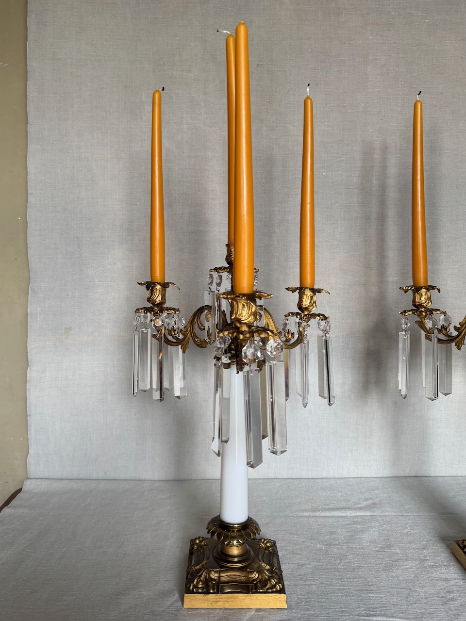 Coppia di grandi candelabri a base quadrata, bronzo dorato, fusto rastremato in opalina, tre bracci sagomati a volute vegetali, per complessive quattro luci, pendenti di cristallo. Toscana, metà sec. XIX