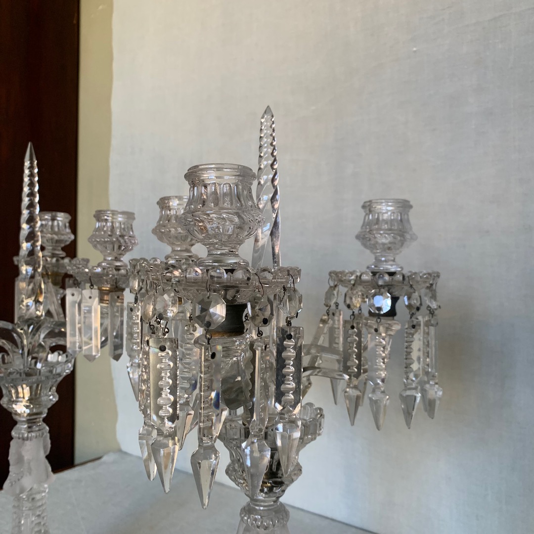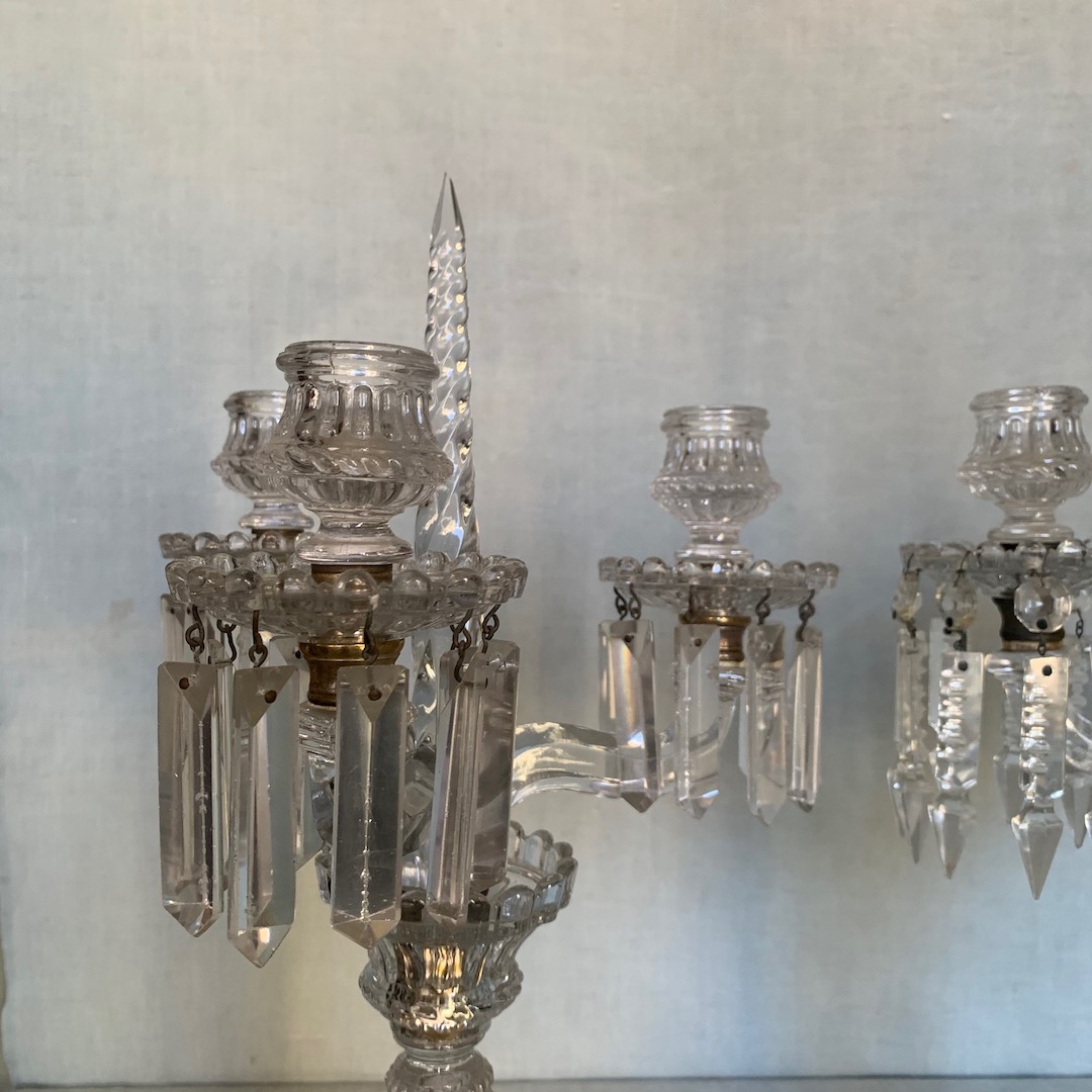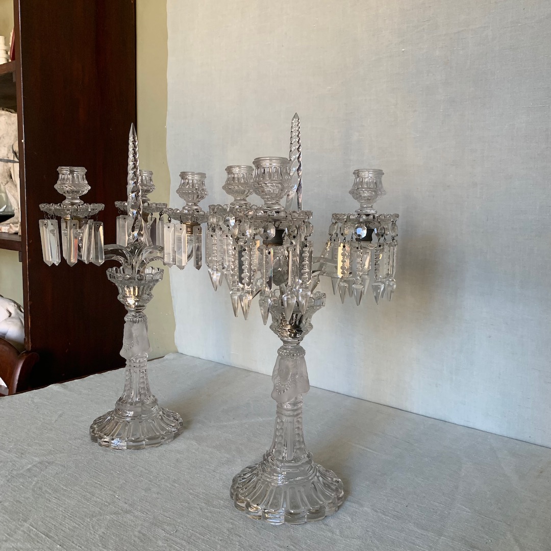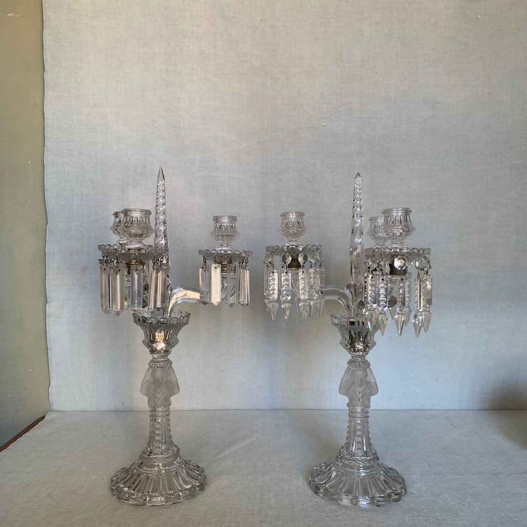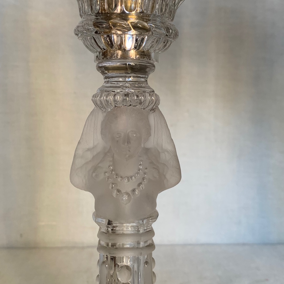 Coppia di Candelabri a tre luci in cristallo Baccarat, busto femminile al centro. Francia fine sec. XIX