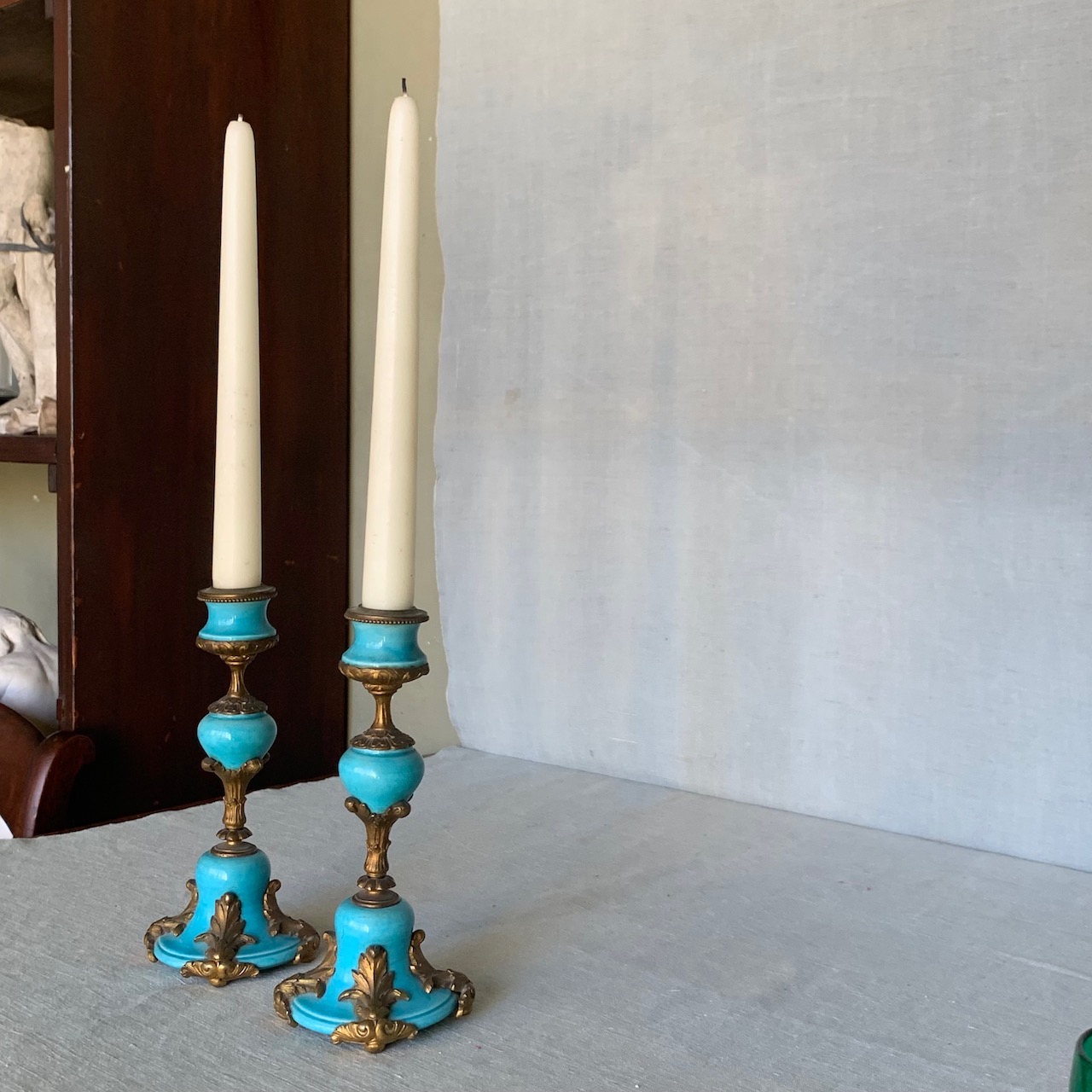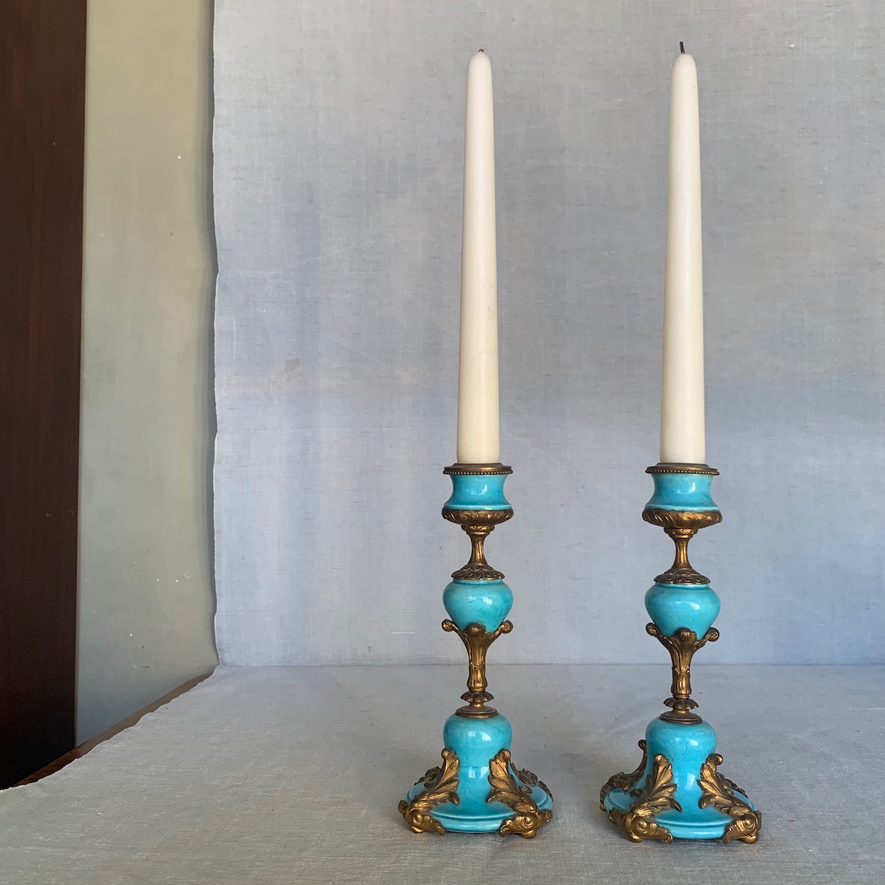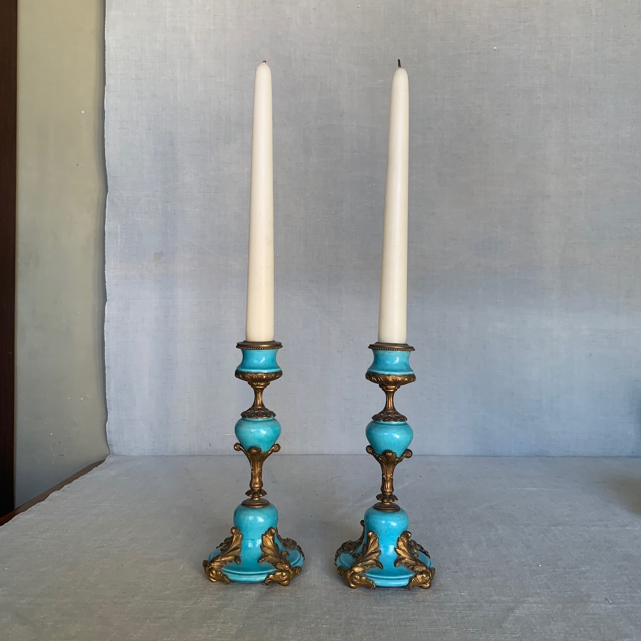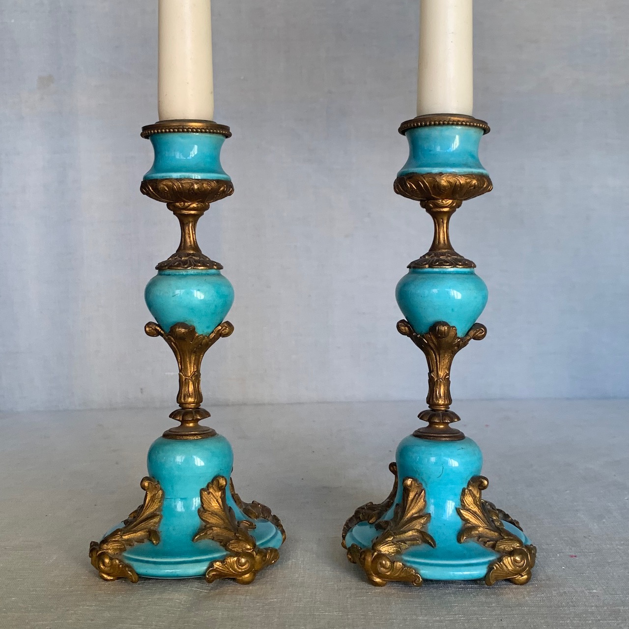 Coppia di candelieri in bronzo e porcellana cartazucchero. Francia, sec. XIX
