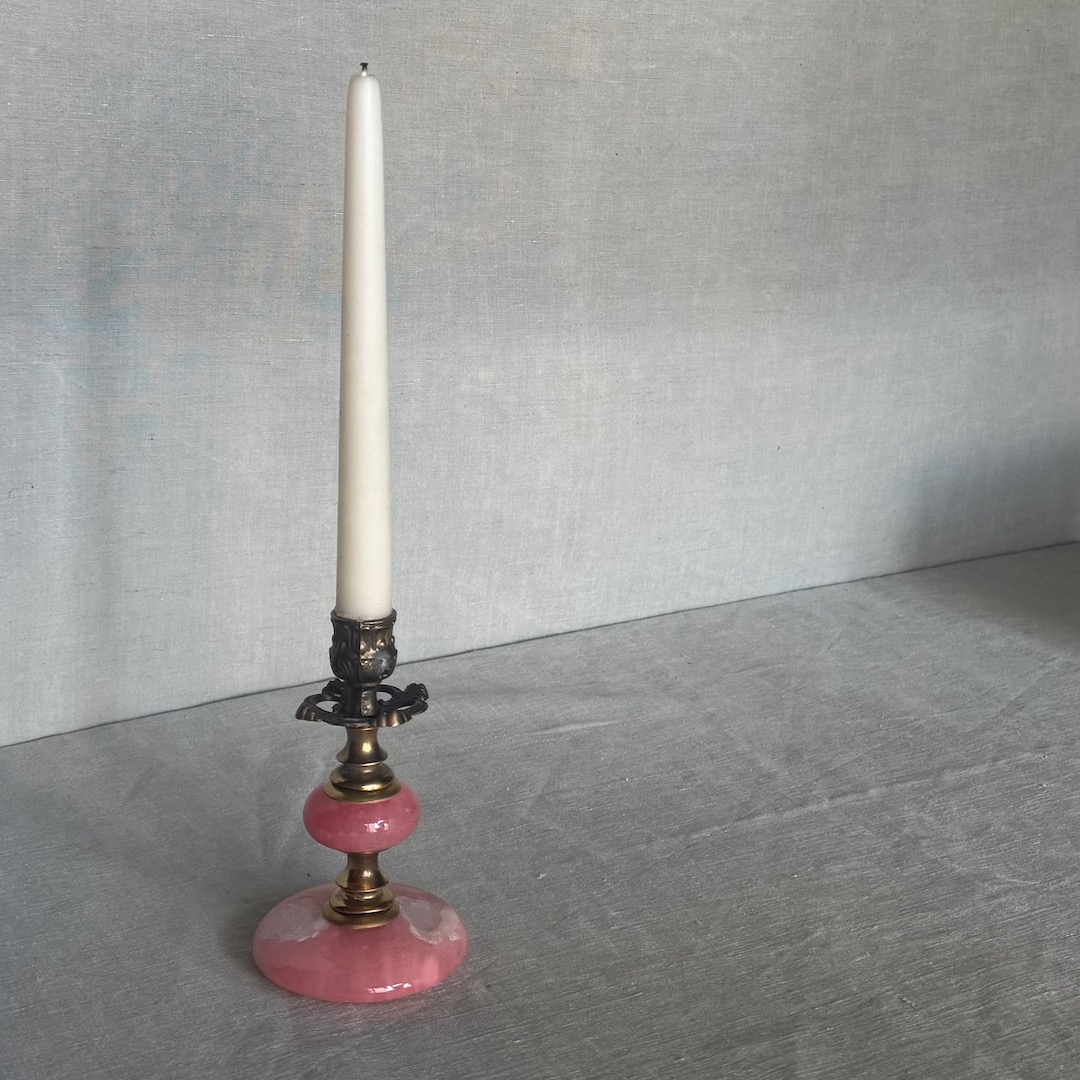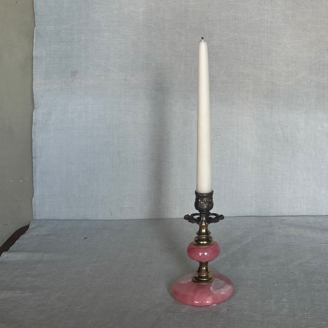 Piccolo candeliere in alabastro rosa e bronzo dorato. Italia, sec. XX