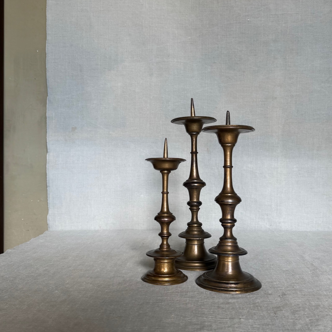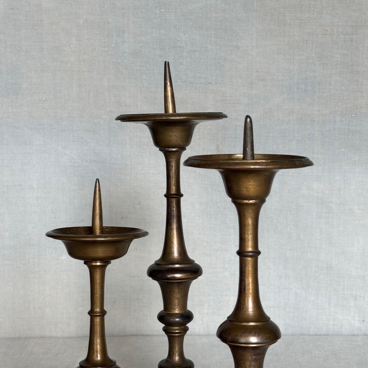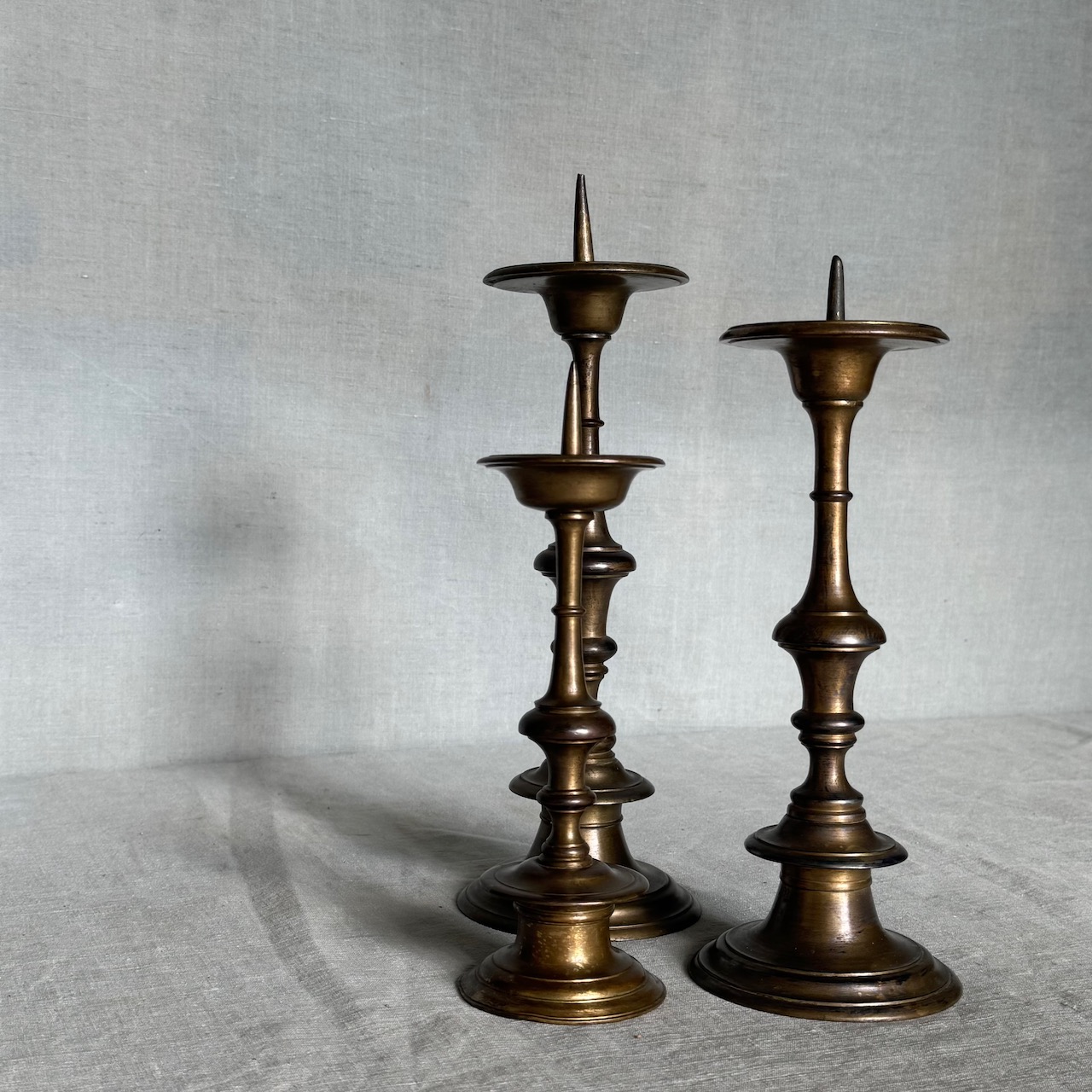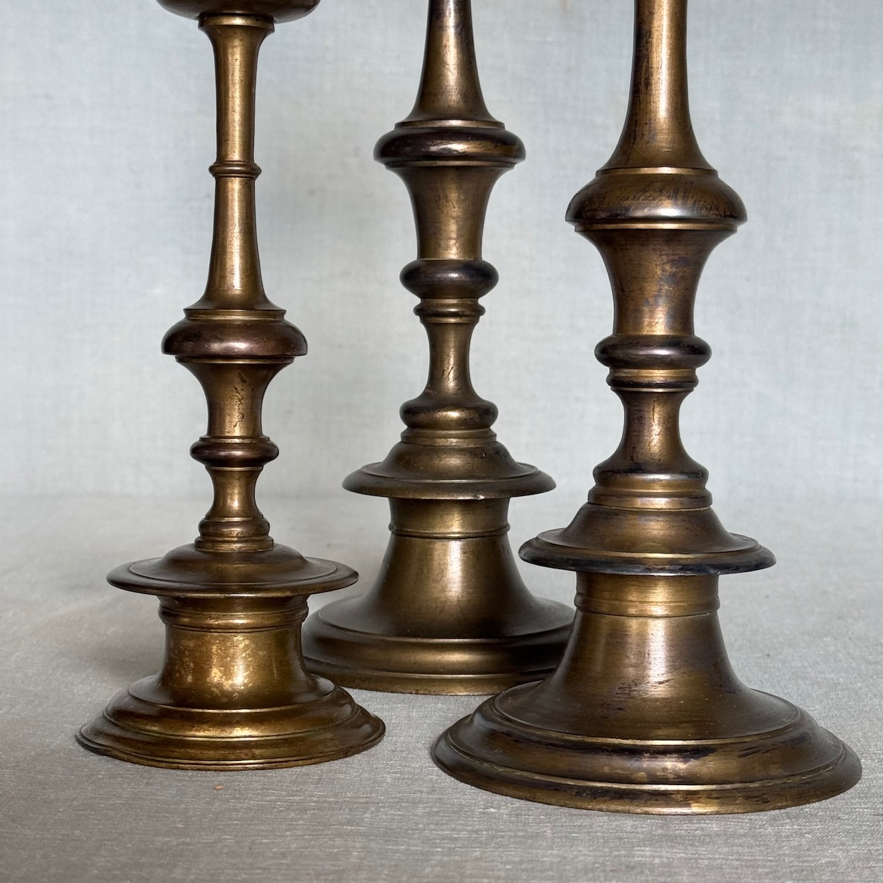 Tre candelieri in bronzo, fusto tornito. Italia, sec. XVIII