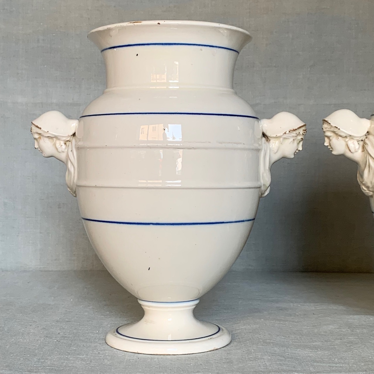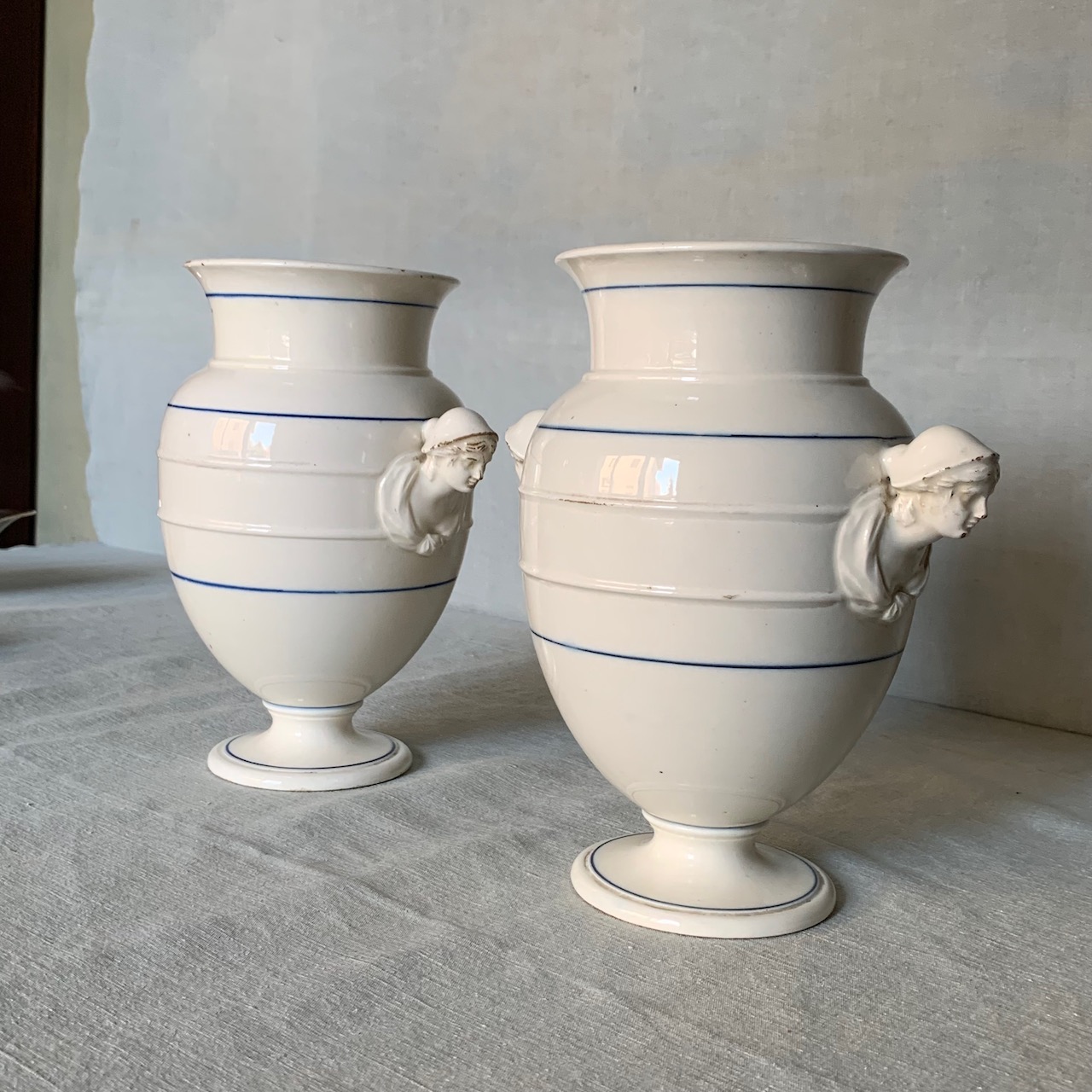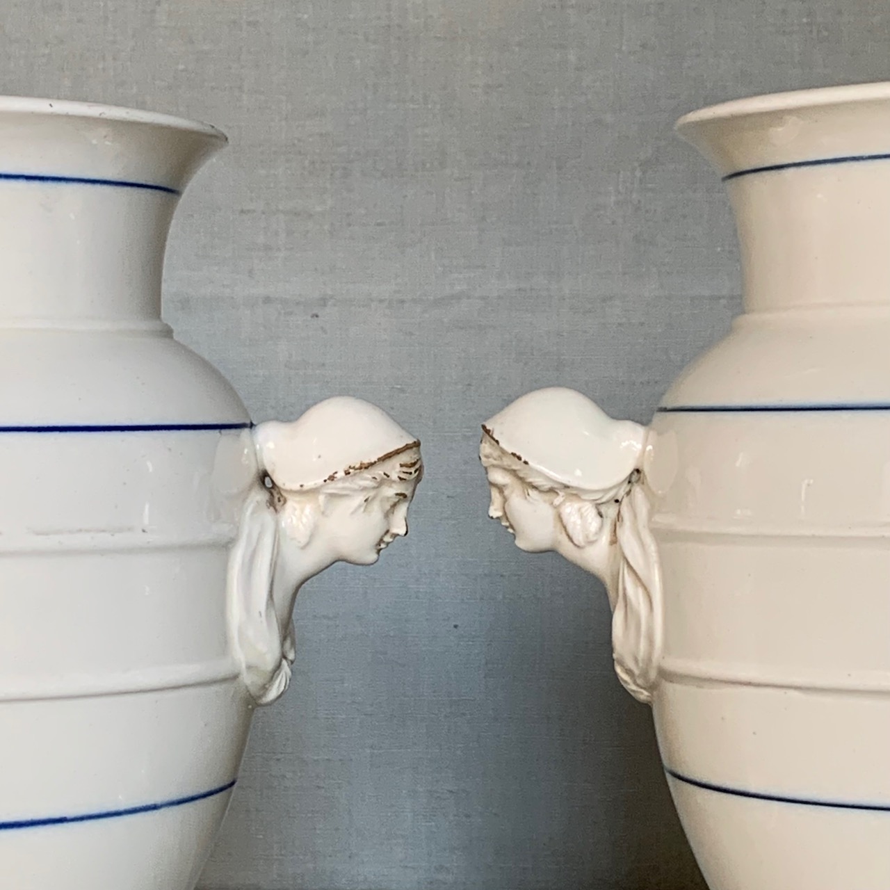 Coppia vasi in ceramica bianca, anse modellate a figure di popolane, Manifattura di Pesaro. Italia, sec. XIX