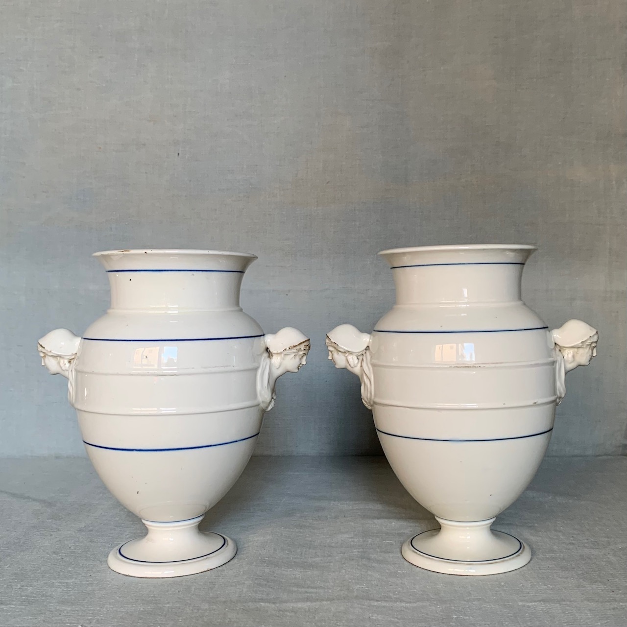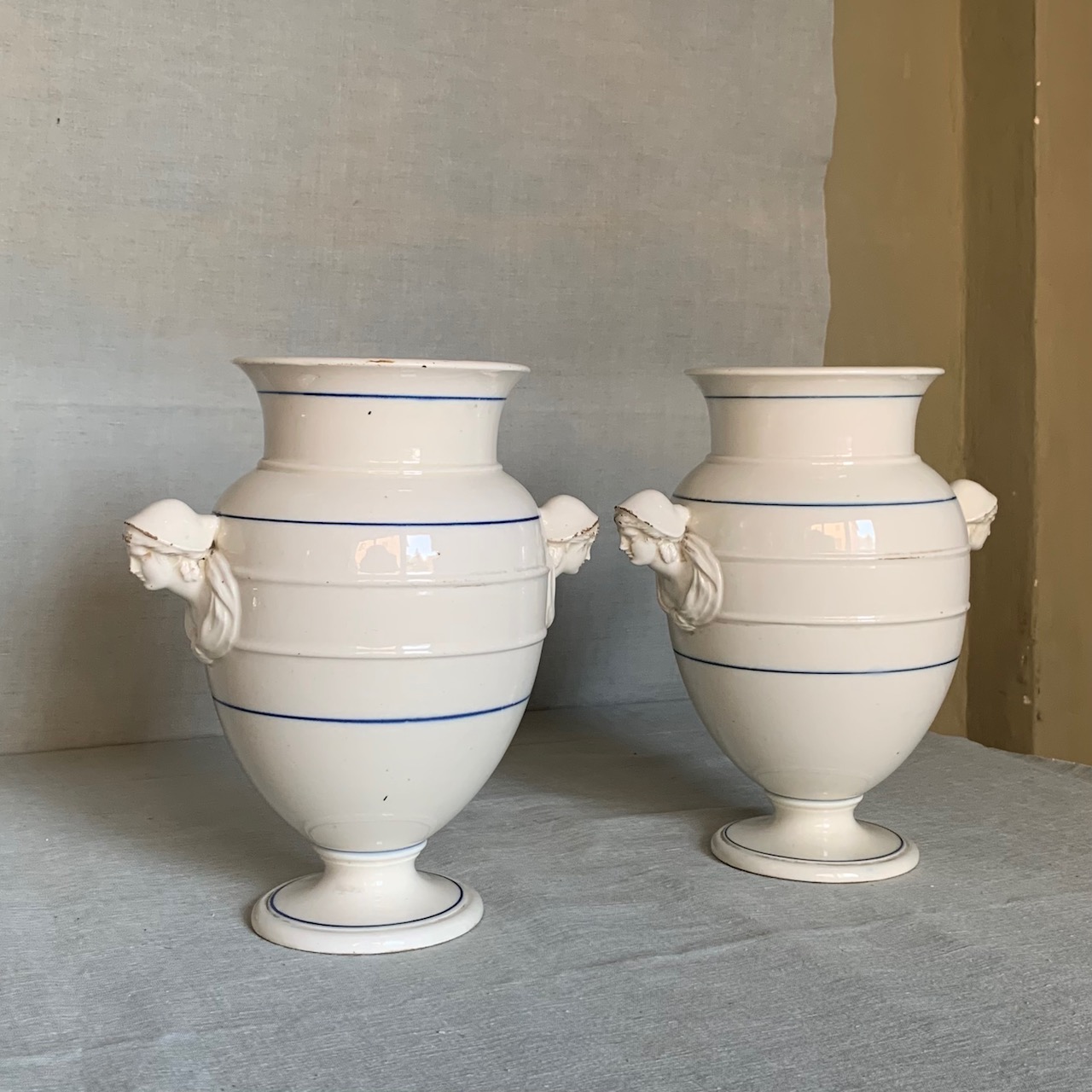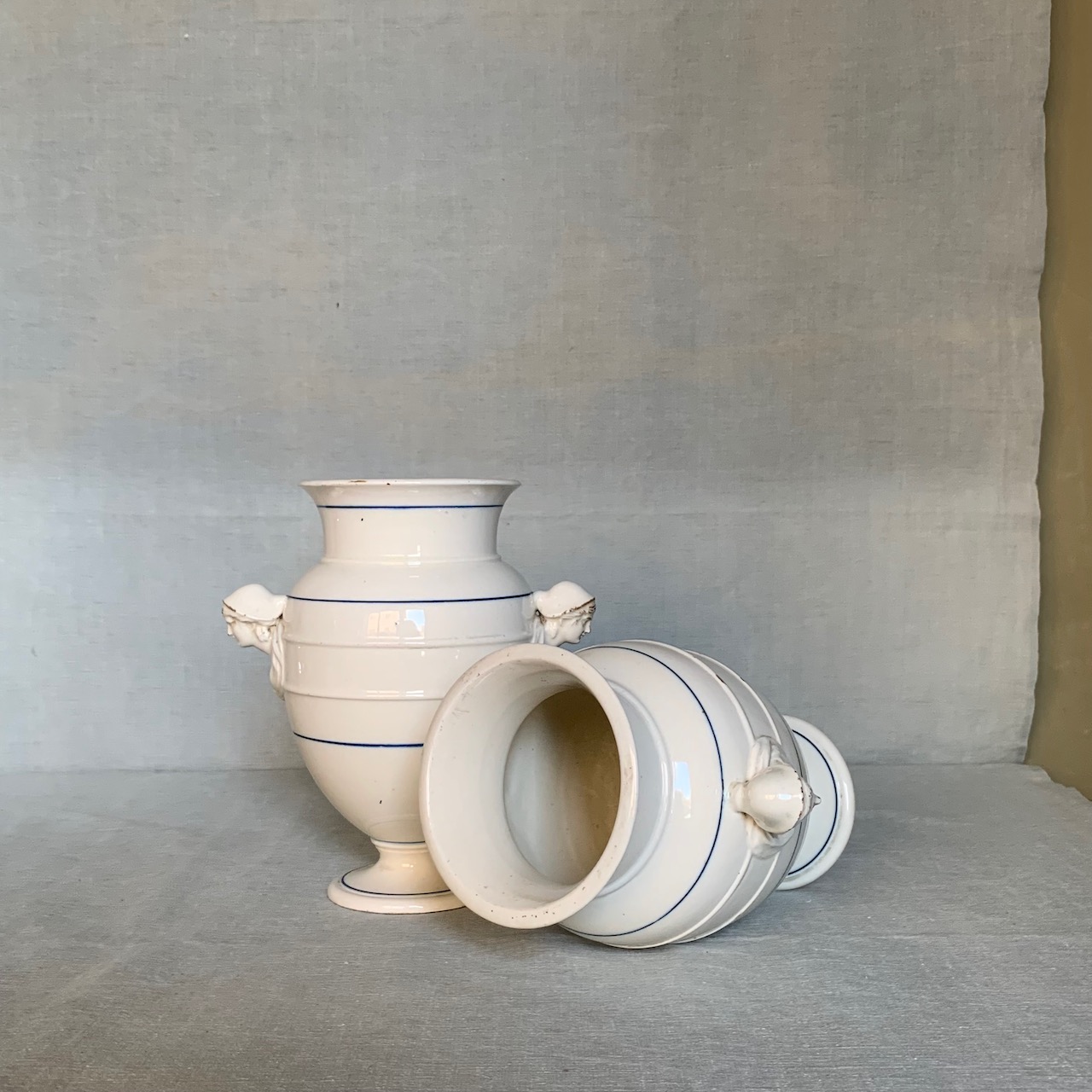 Coppia vasi in ceramica bianca, anse modellate a figure di popolane, Manifattura di Pesaro. Italia, sec. XIX