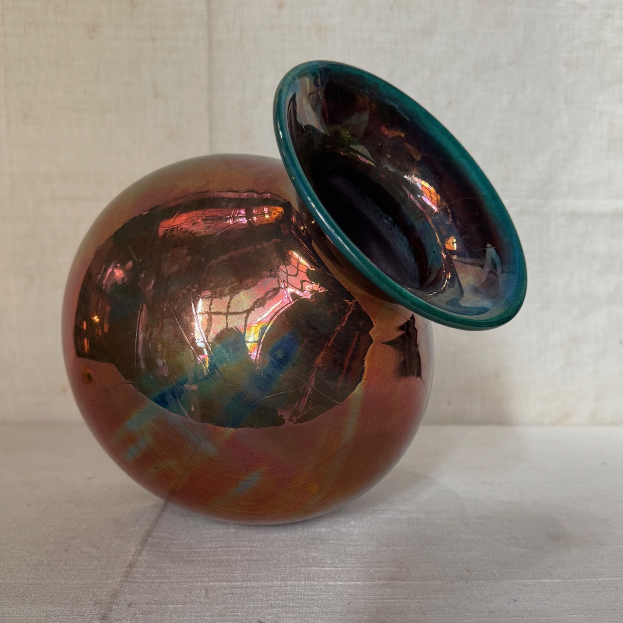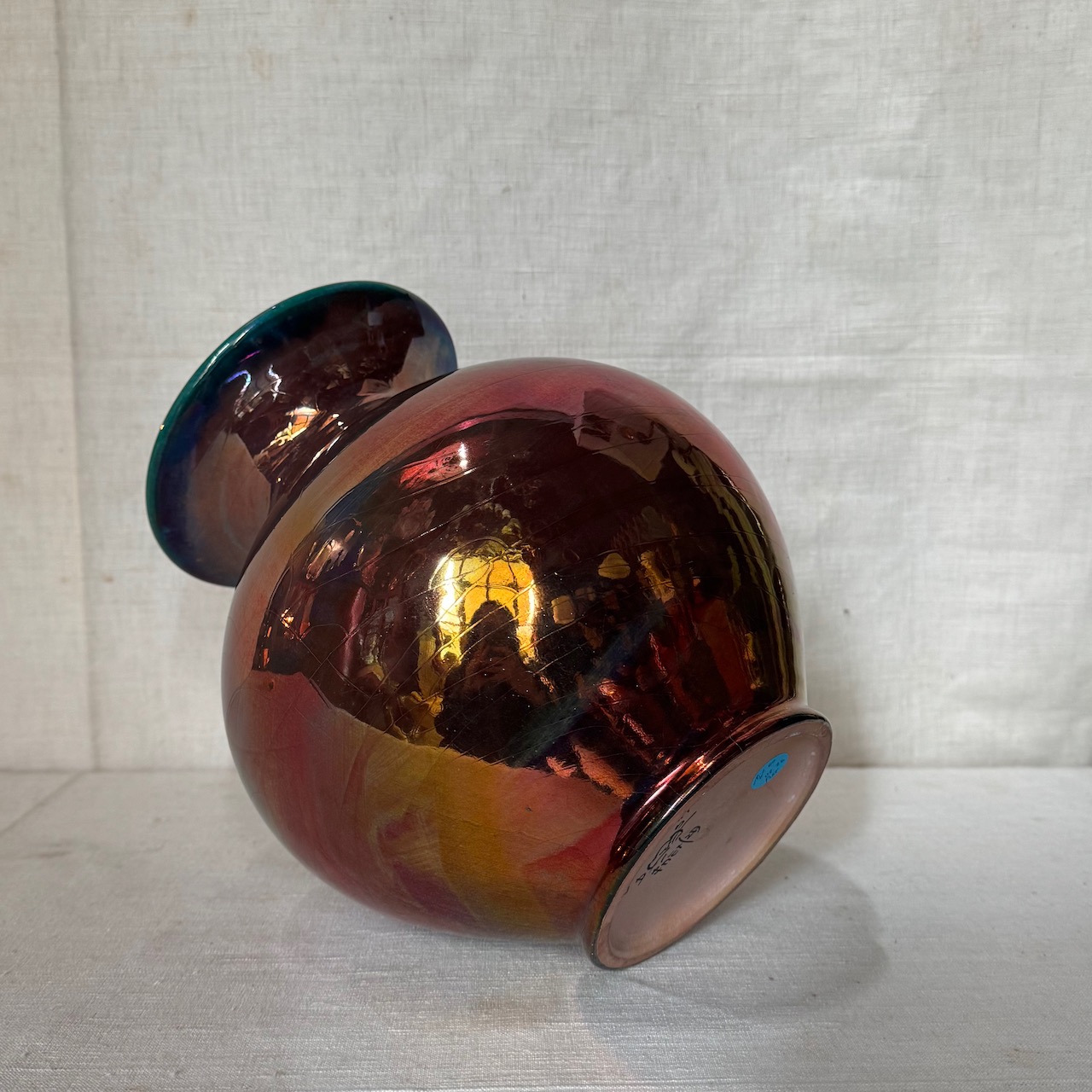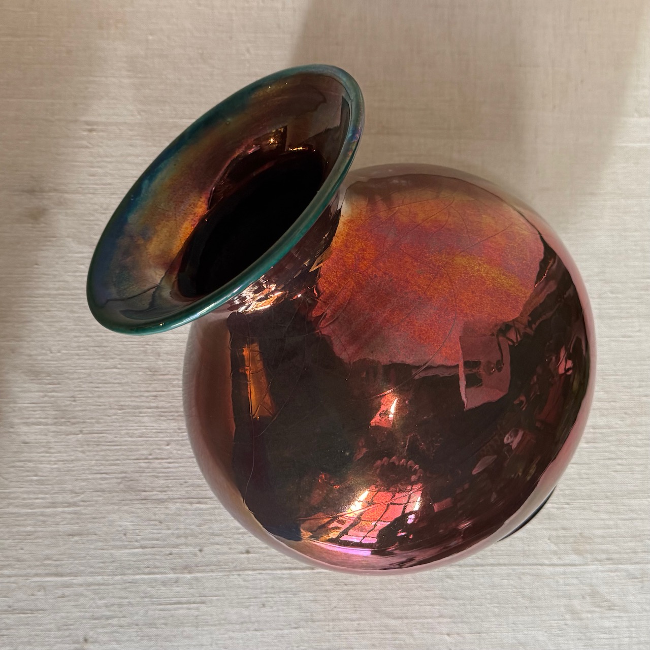 Vaso a globo in ceramica della Bottega Gatti, a finitura iridescente, nei toni ramati dal verde al viola-arancio. Faenza, 1960 ca