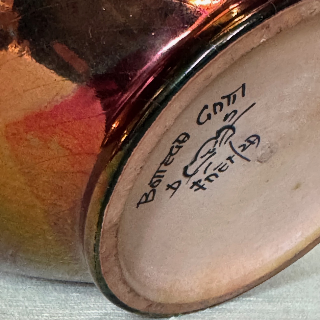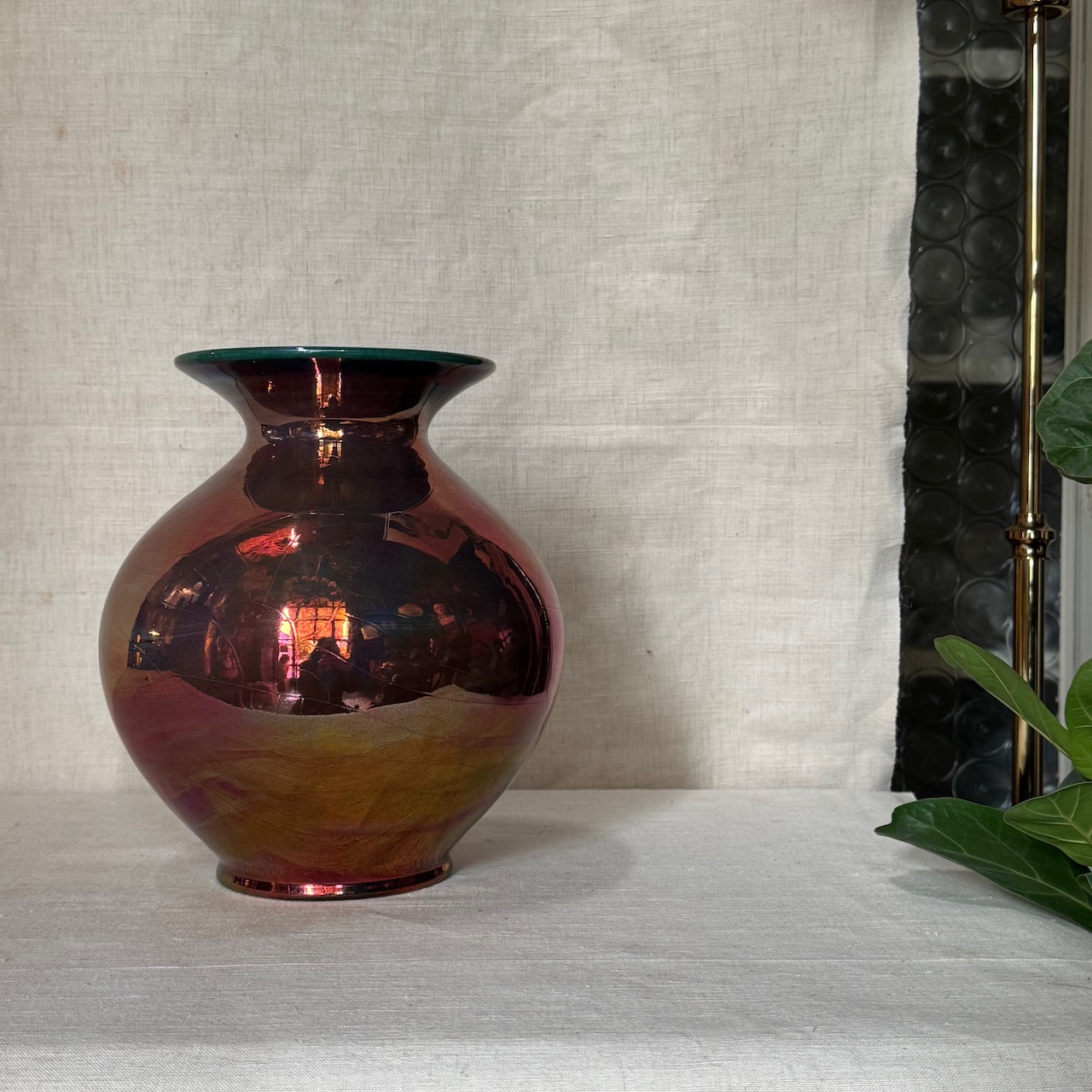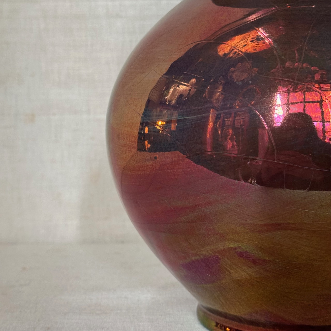 Vaso a globo in ceramica della Bottega Gatti, a finitura iridescente, nei toni ramati dal verde al viola-arancio. Faenza, 1960 ca