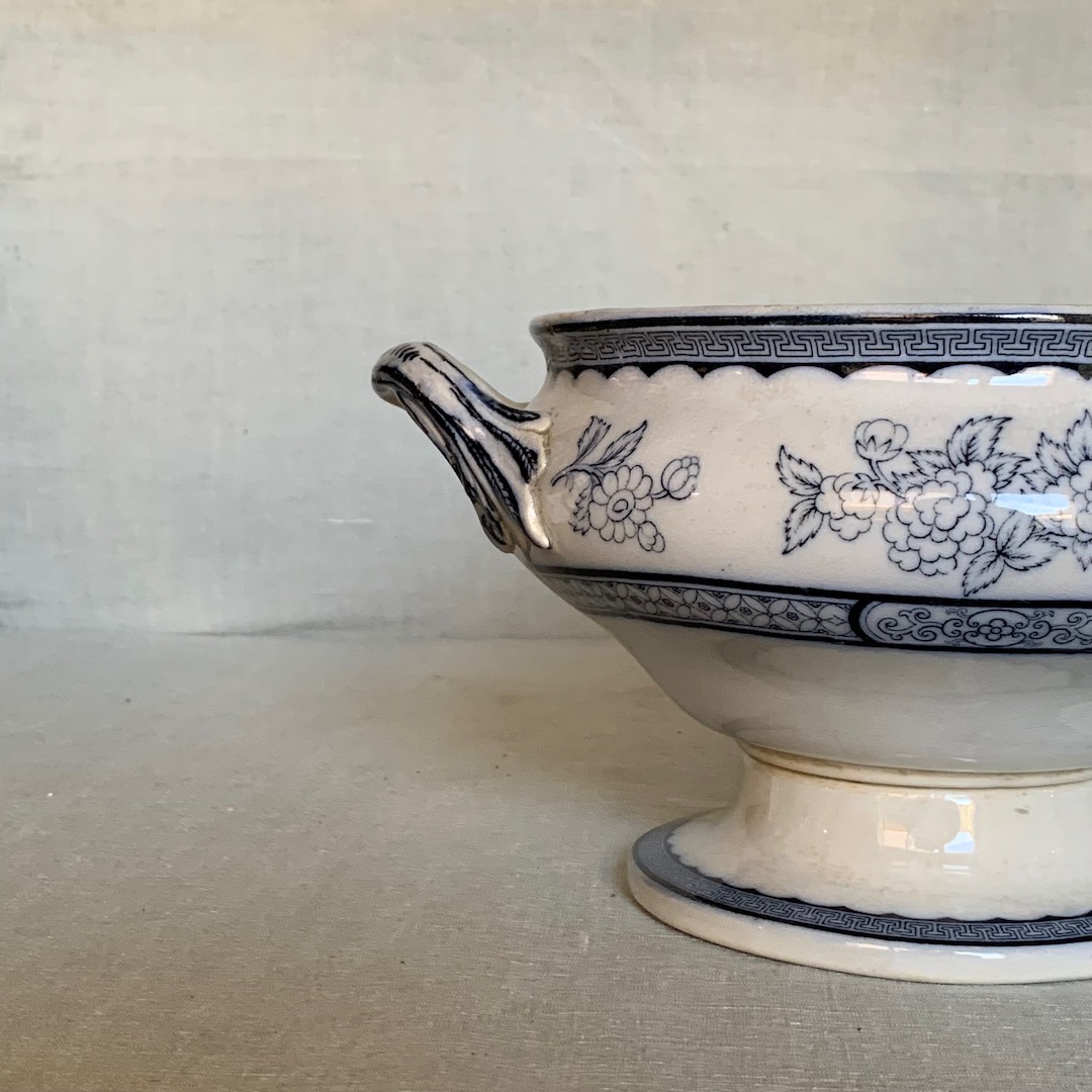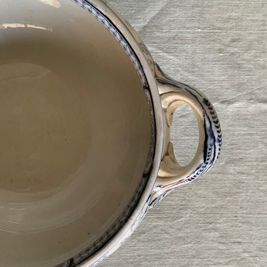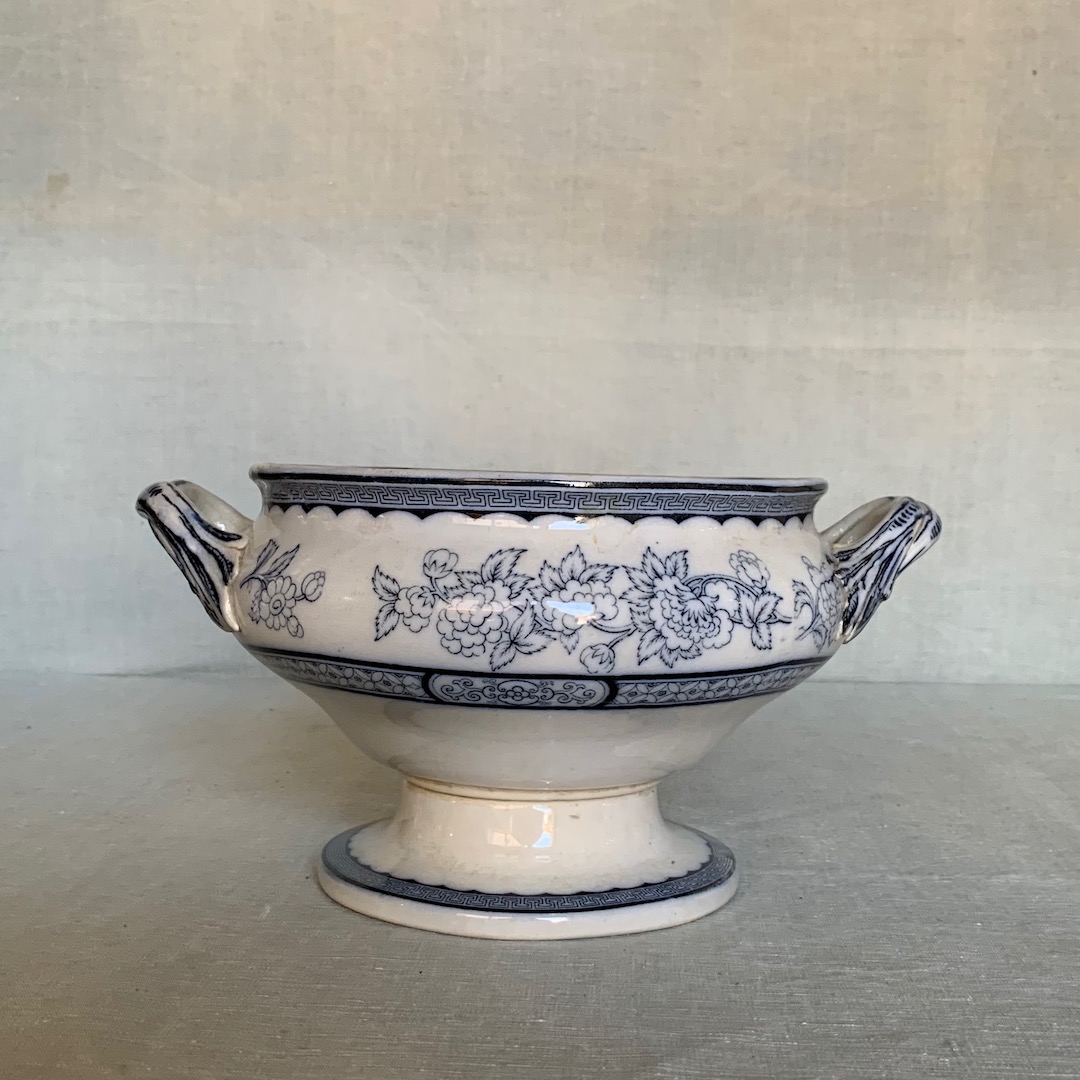 Cachepot biansato in ceramica Inglese, fondo bianco, decoro blu a motivi floreali. Inghilterra, sec. XIX