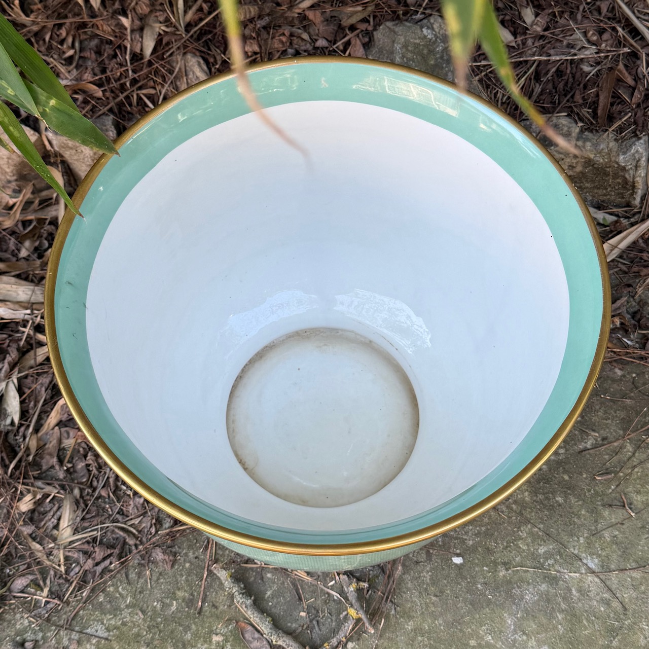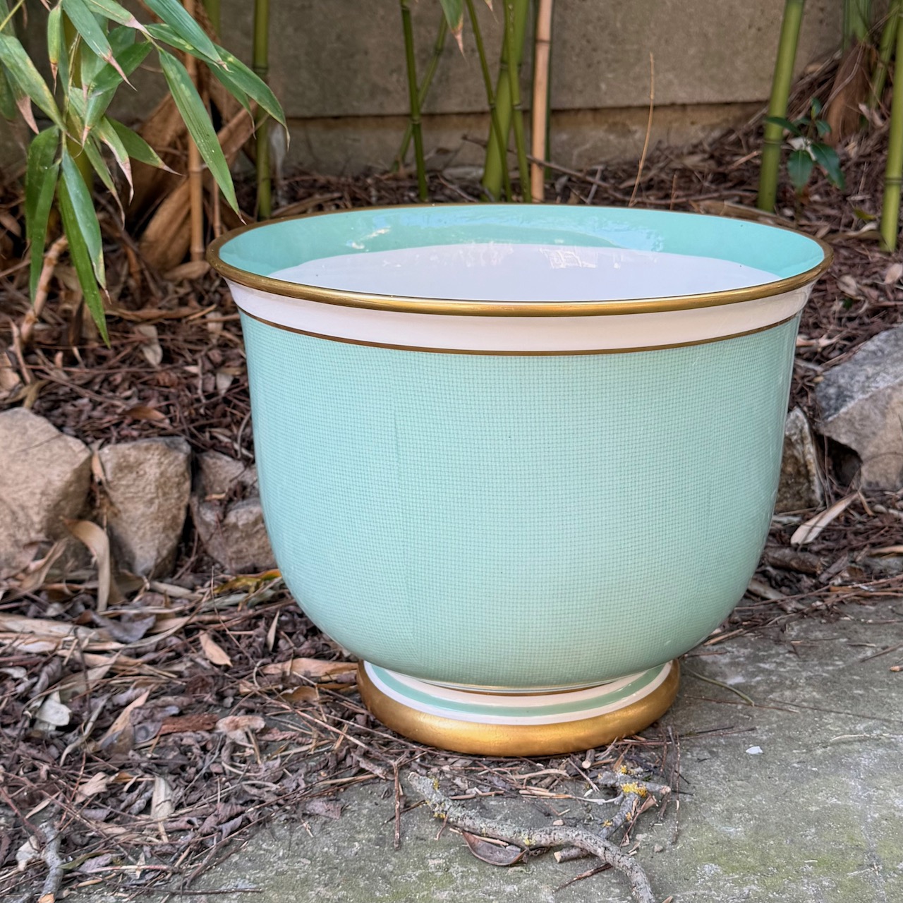 Cachepot in porcellana smaltata turchese, rigo oro. Italia, sec. XX