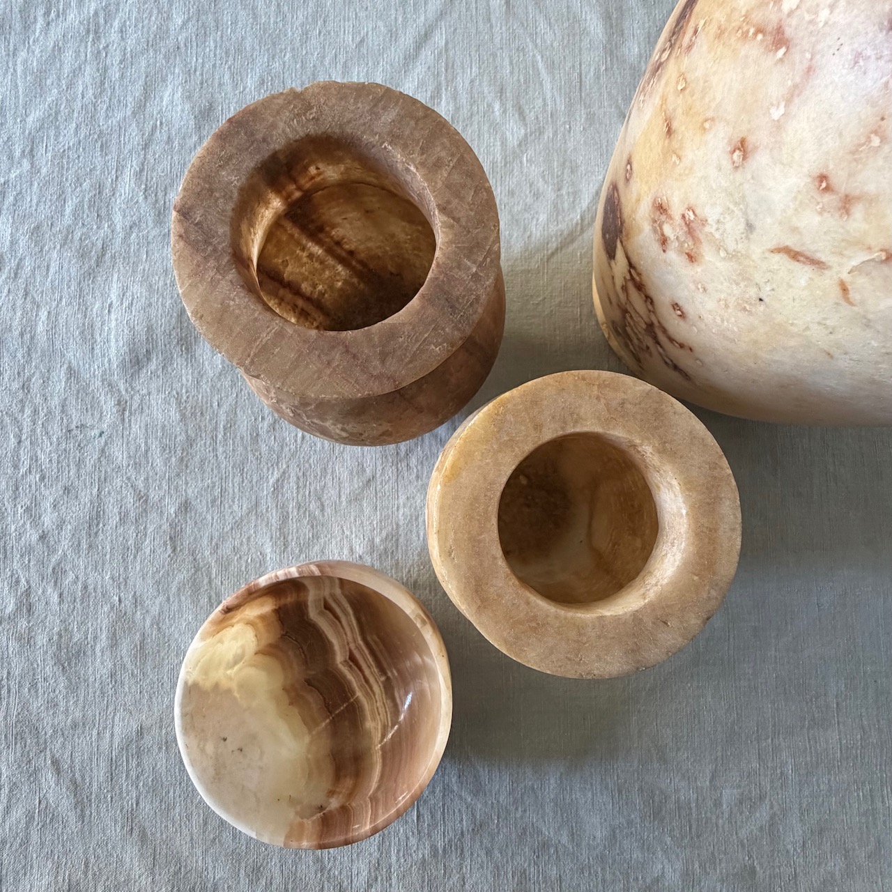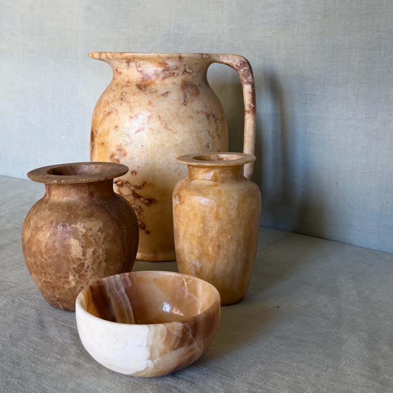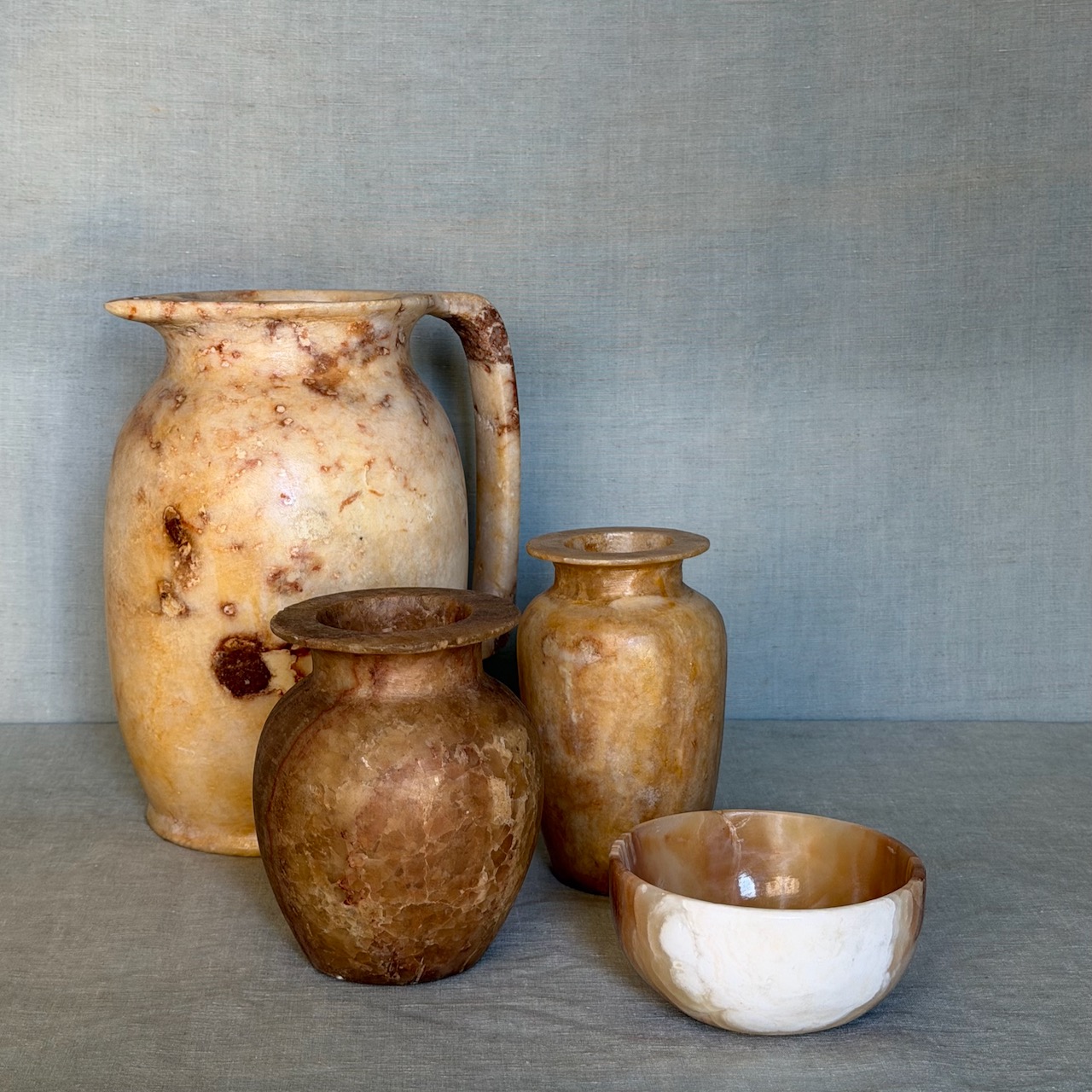 Collezione vasi alabastro miele, un versato, due vasi ad anfora, una ciotola. Egitto, sec. XX
