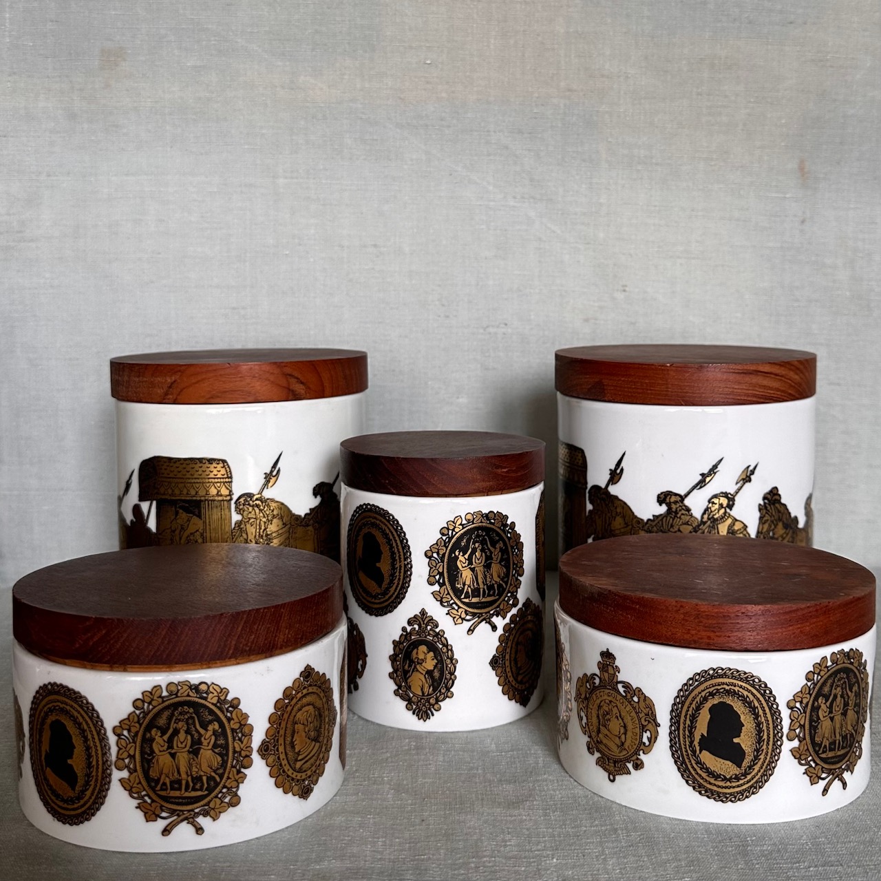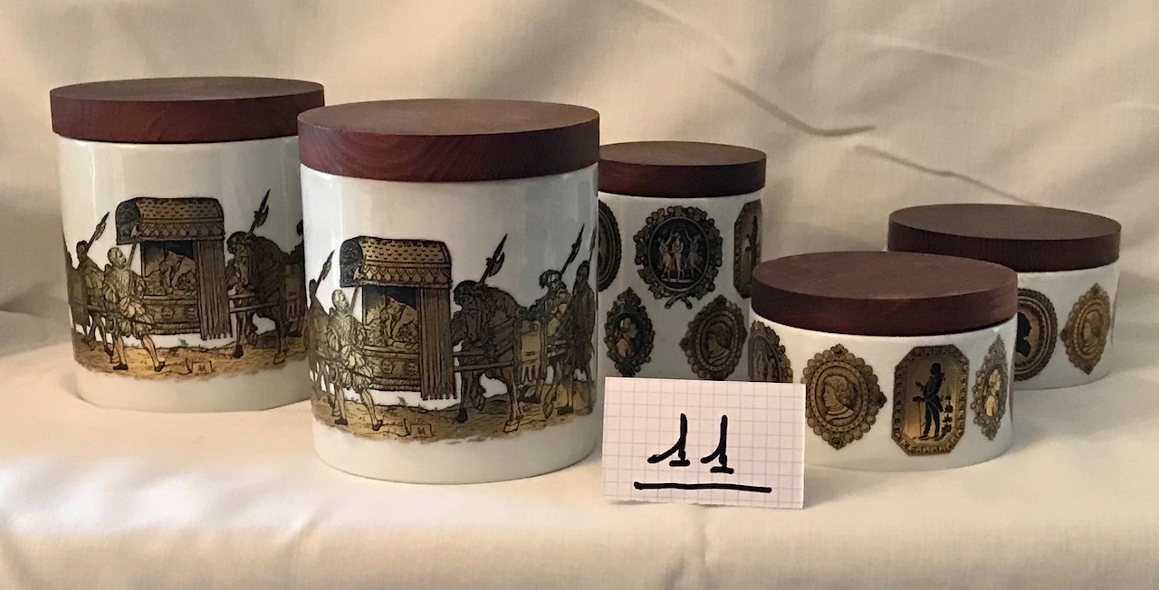 Collezione di barattoli cachepots in porcellana bianca, con coperchio in legno. Italia, sec. XIX