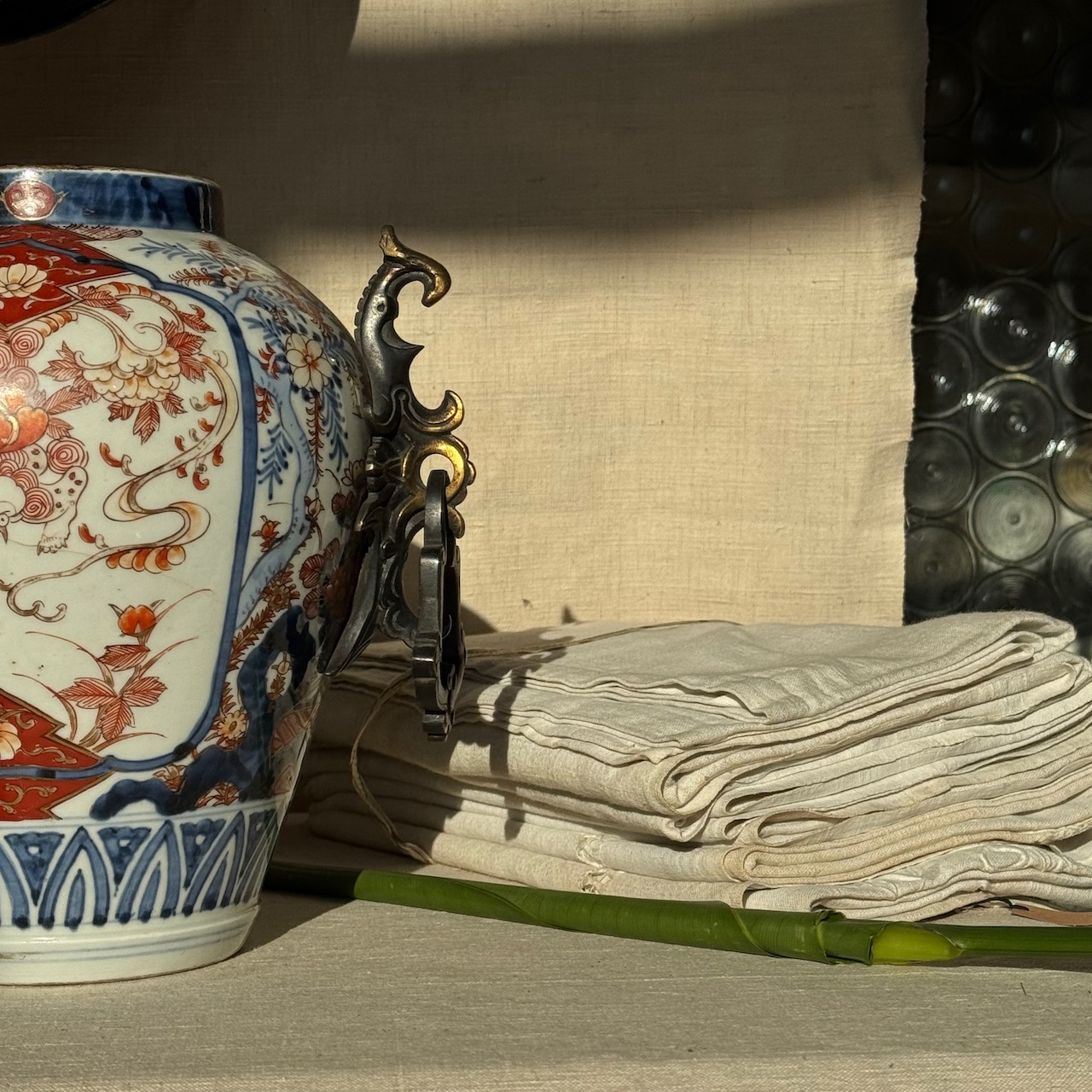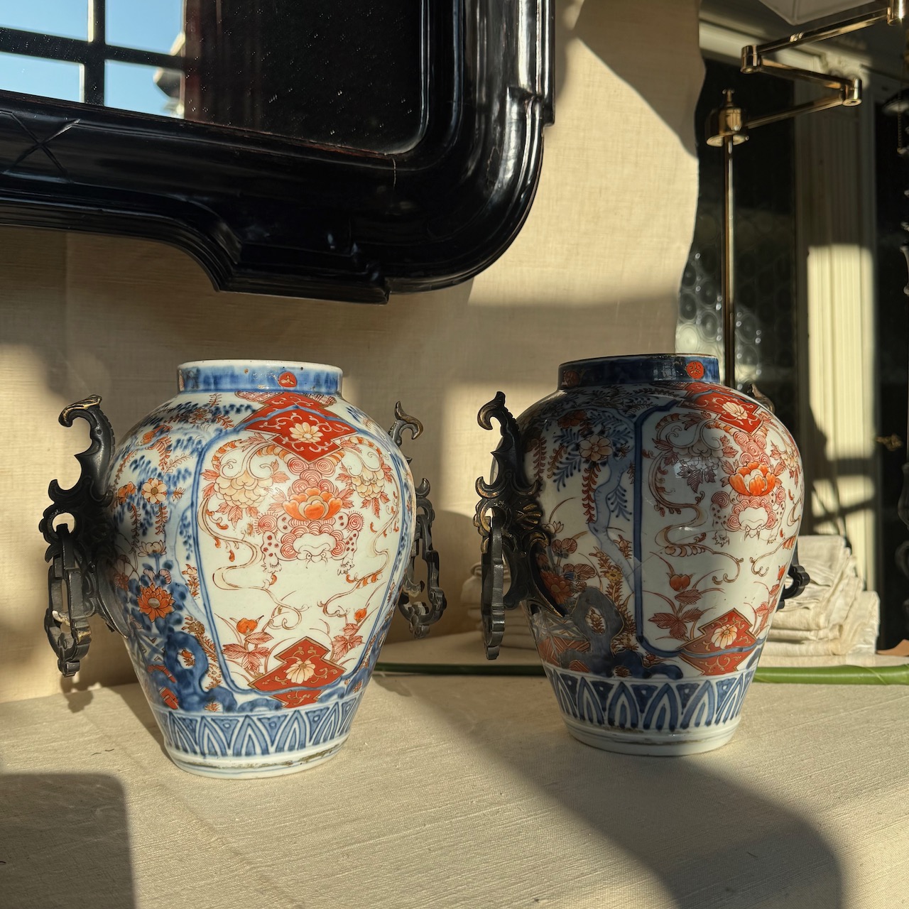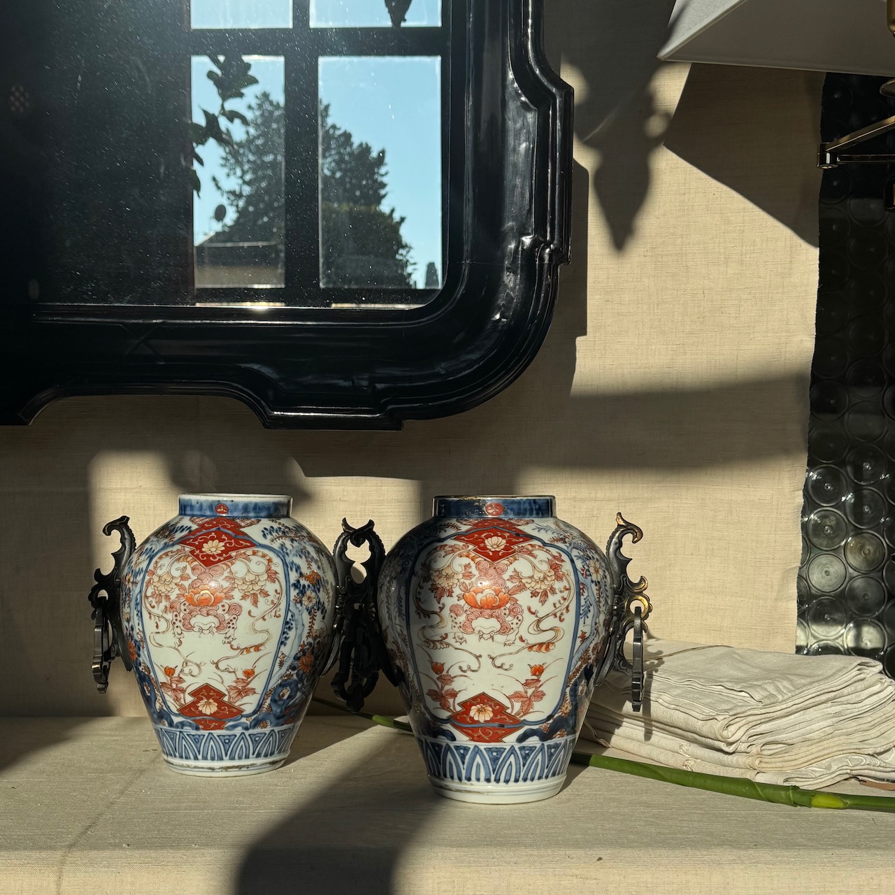 Coppia vasi cachepots Imari, prese laterali in bronzo. Giappone, sec. XIX