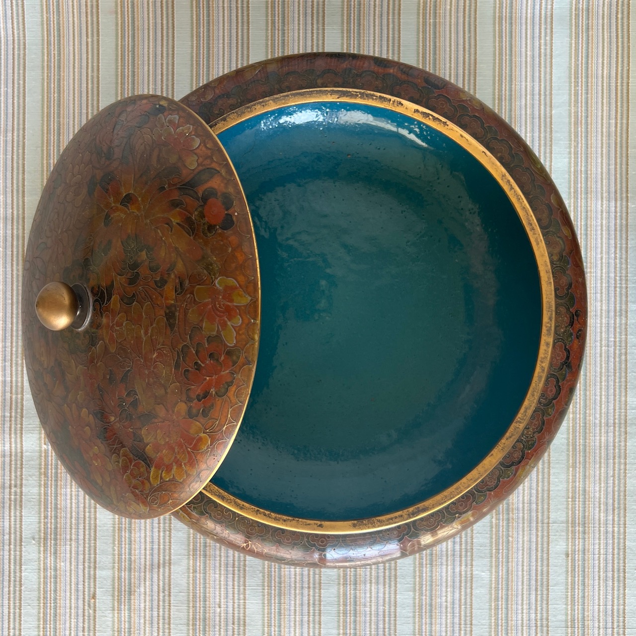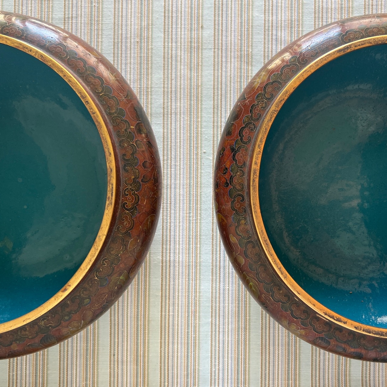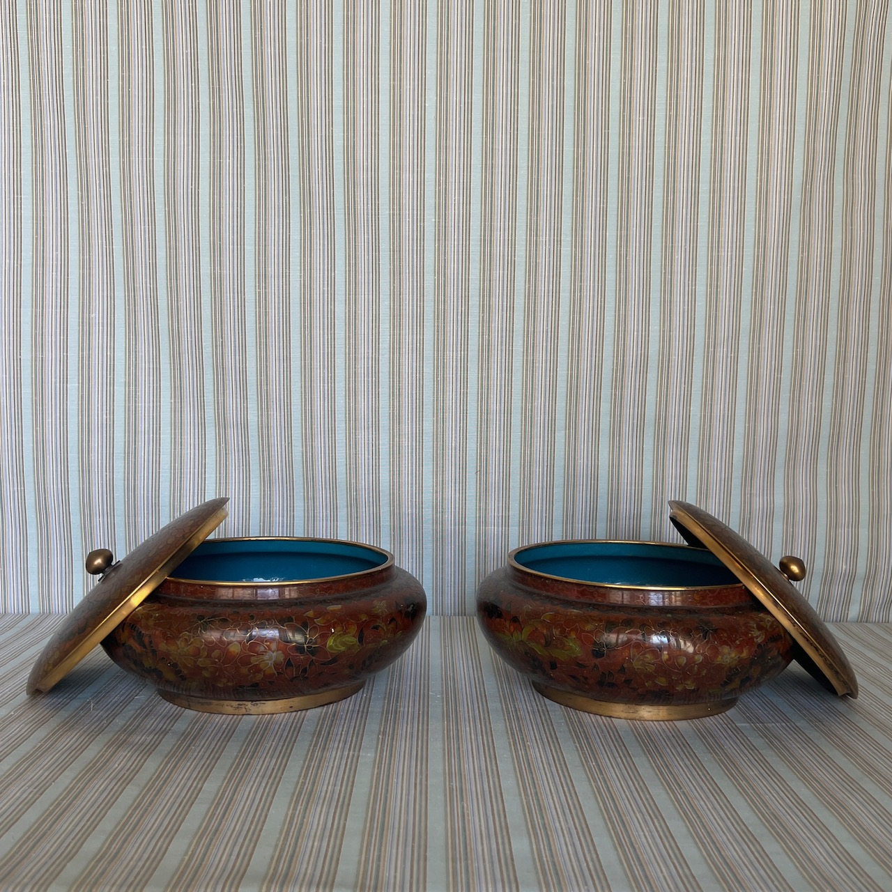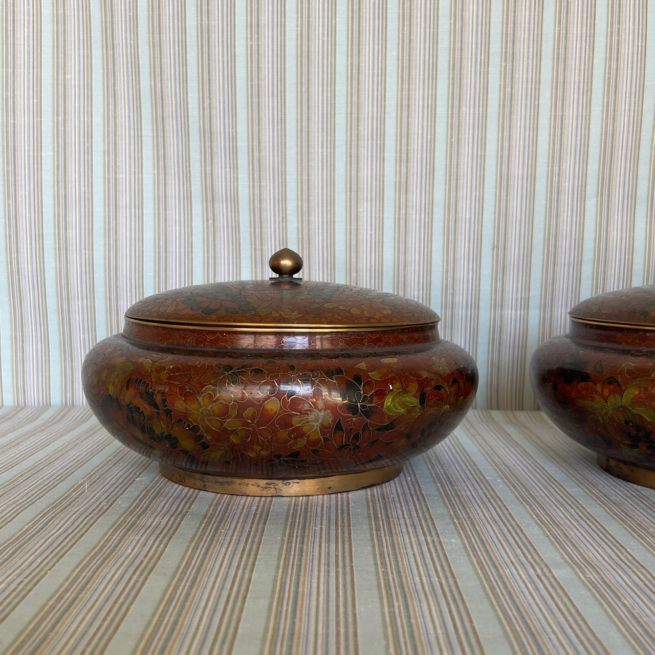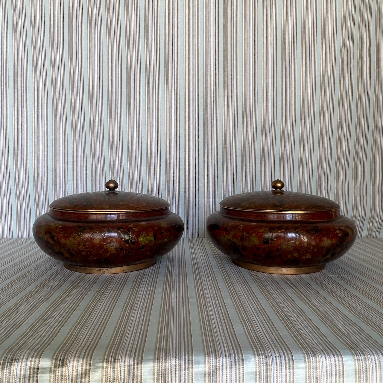 Coppia di grandi potiche cloisonnè, nei toni del cachi e del verde, su basi in legno ebanizzato coeve. Cina, inizio sec. XX