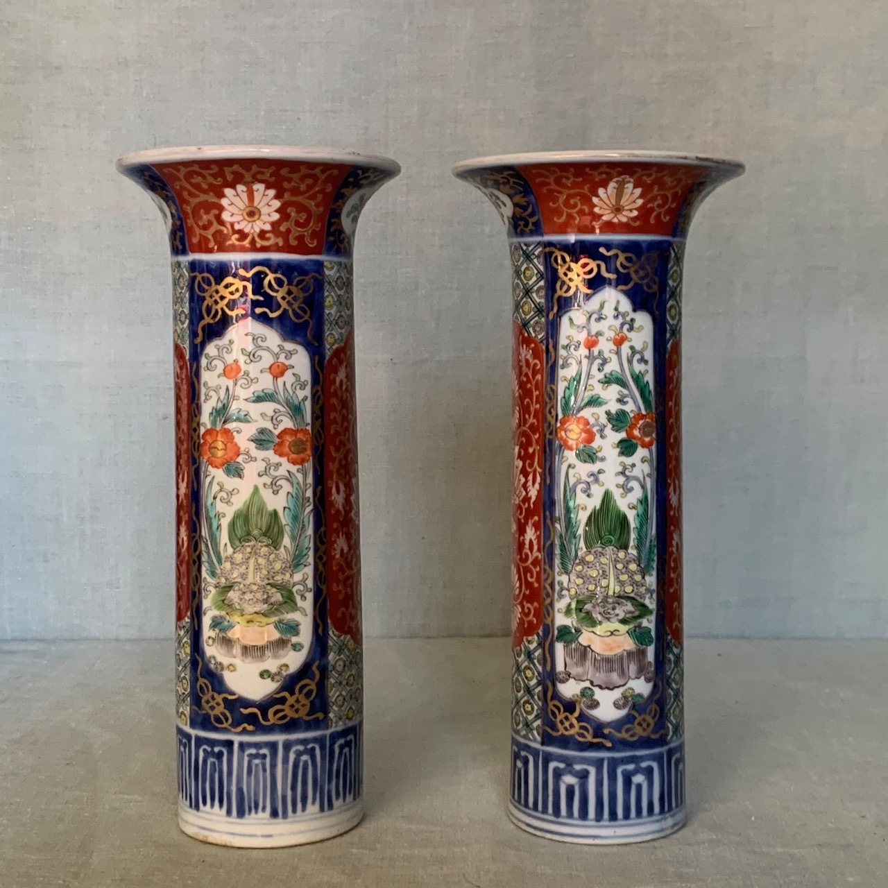 Coppia di vasi in porcellana imari dipinti a chinoserie e motivi floreali con lumeggiature dorate. Giappone, sec. XX