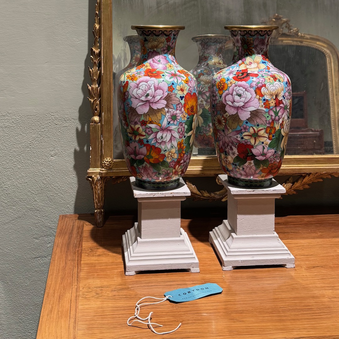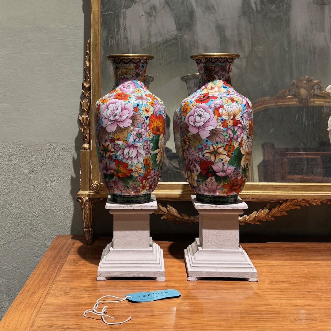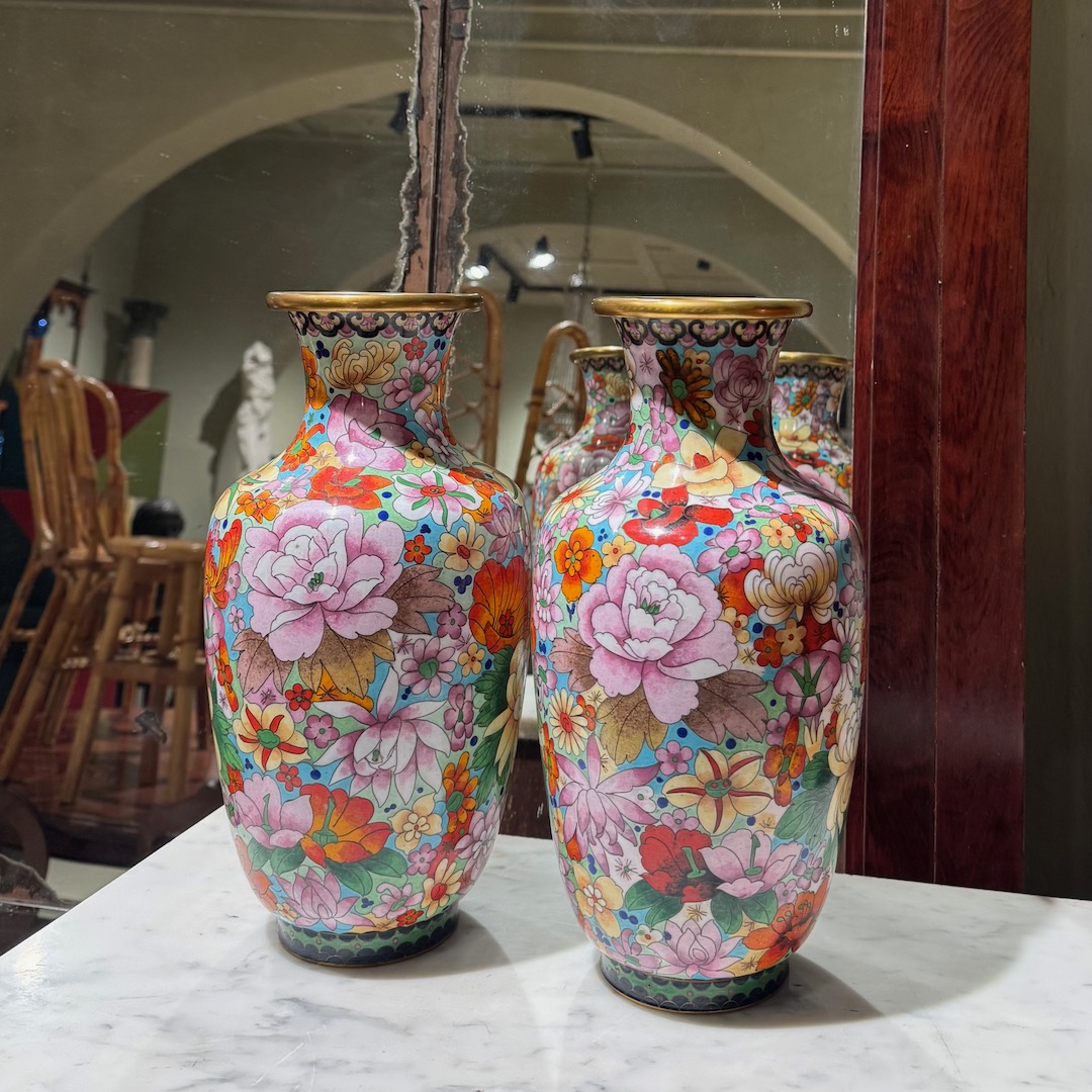 Coppia di vasi in smalto cloisonnè floreali a balaustro. Cina, sec. XX