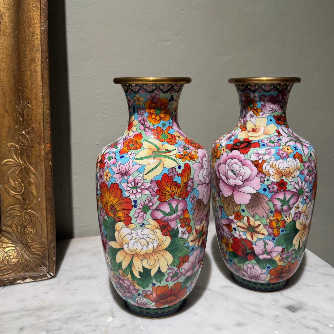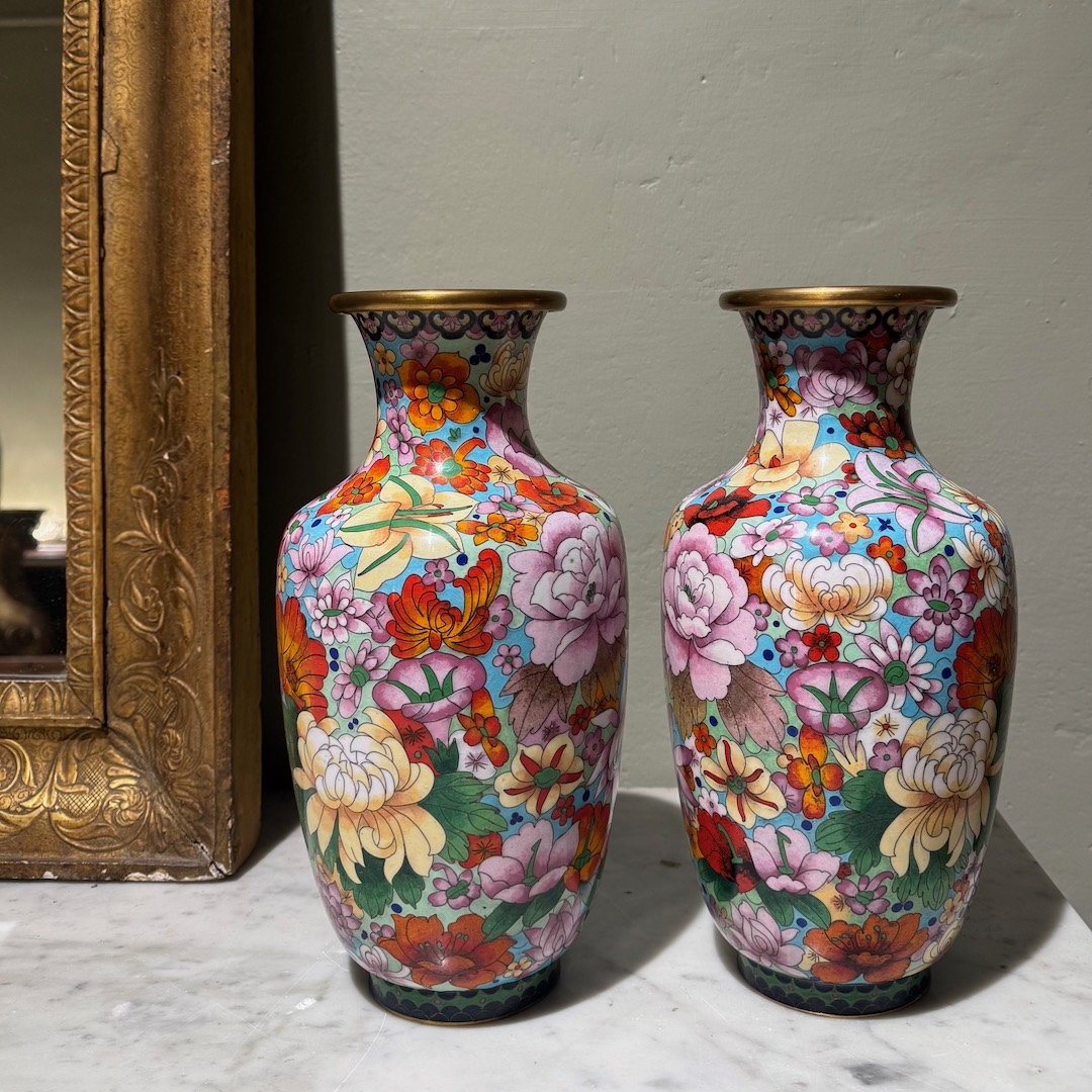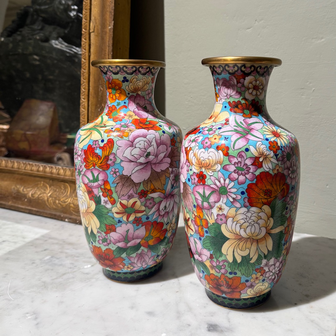 Coppia di vasi in smalto cloisonnè floreali a balaustro. Cina, sec. XX