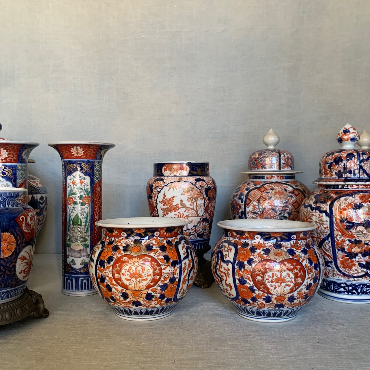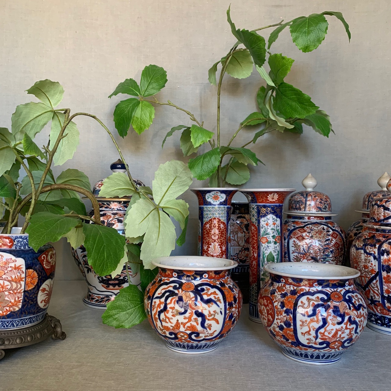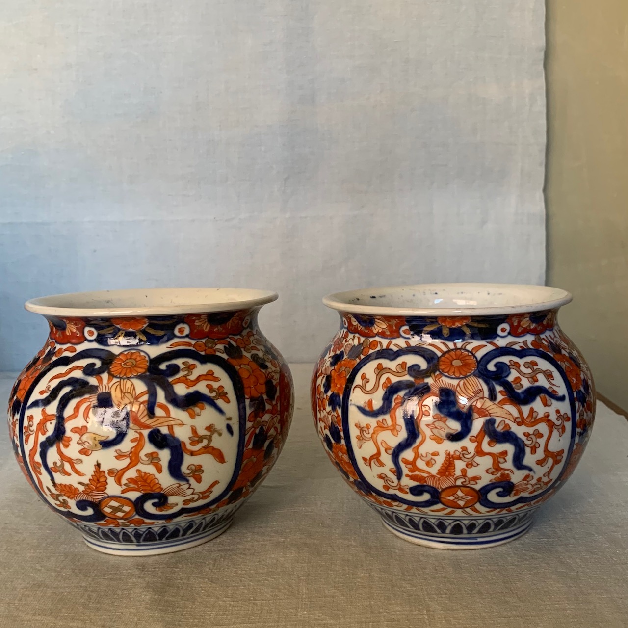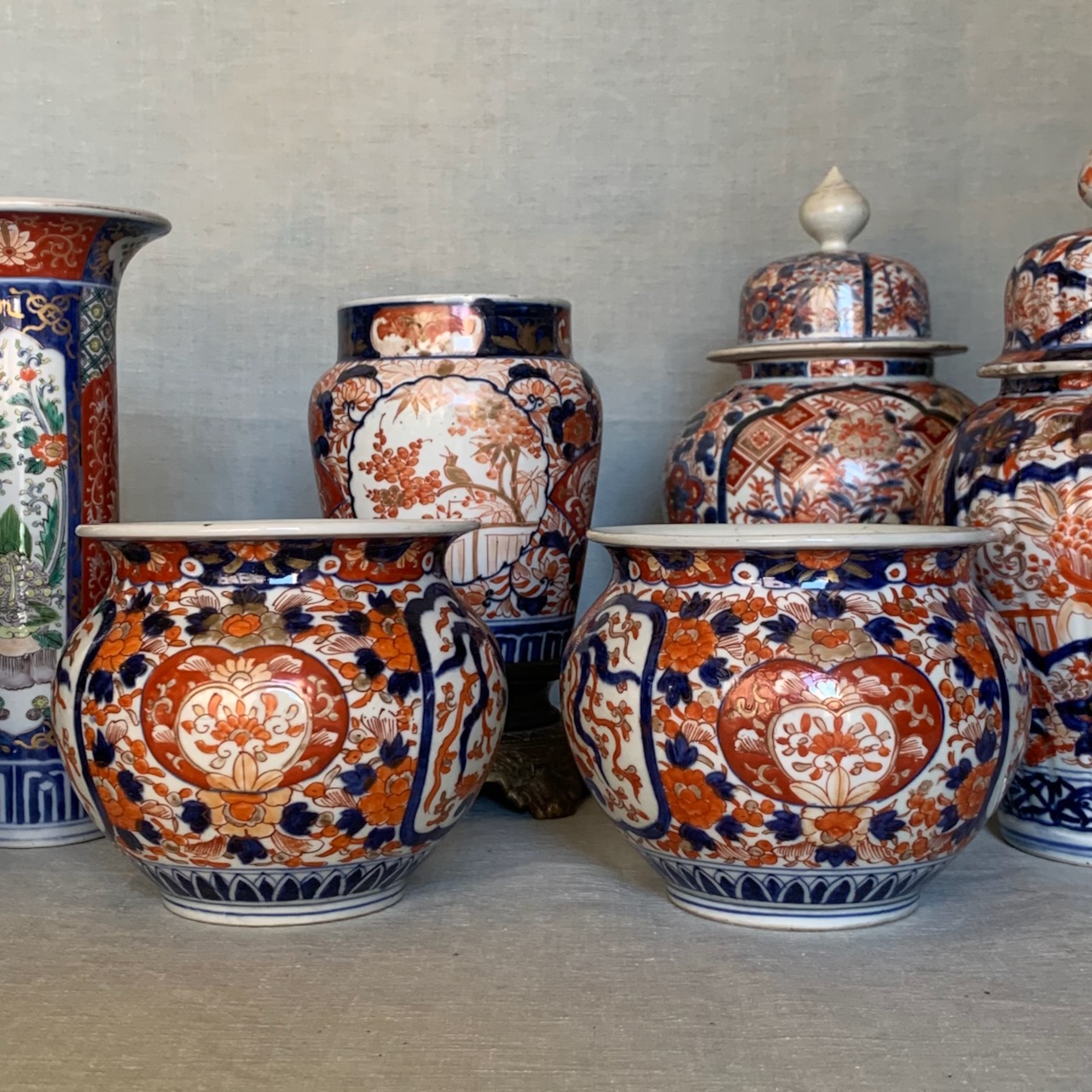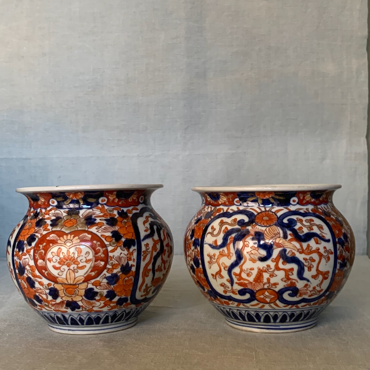 Coppia di vasi cachepot imari in porcellana a motivi floreali nei toni del rosso e del blu, lumeggiature dorate. Giappone, sec. XIX