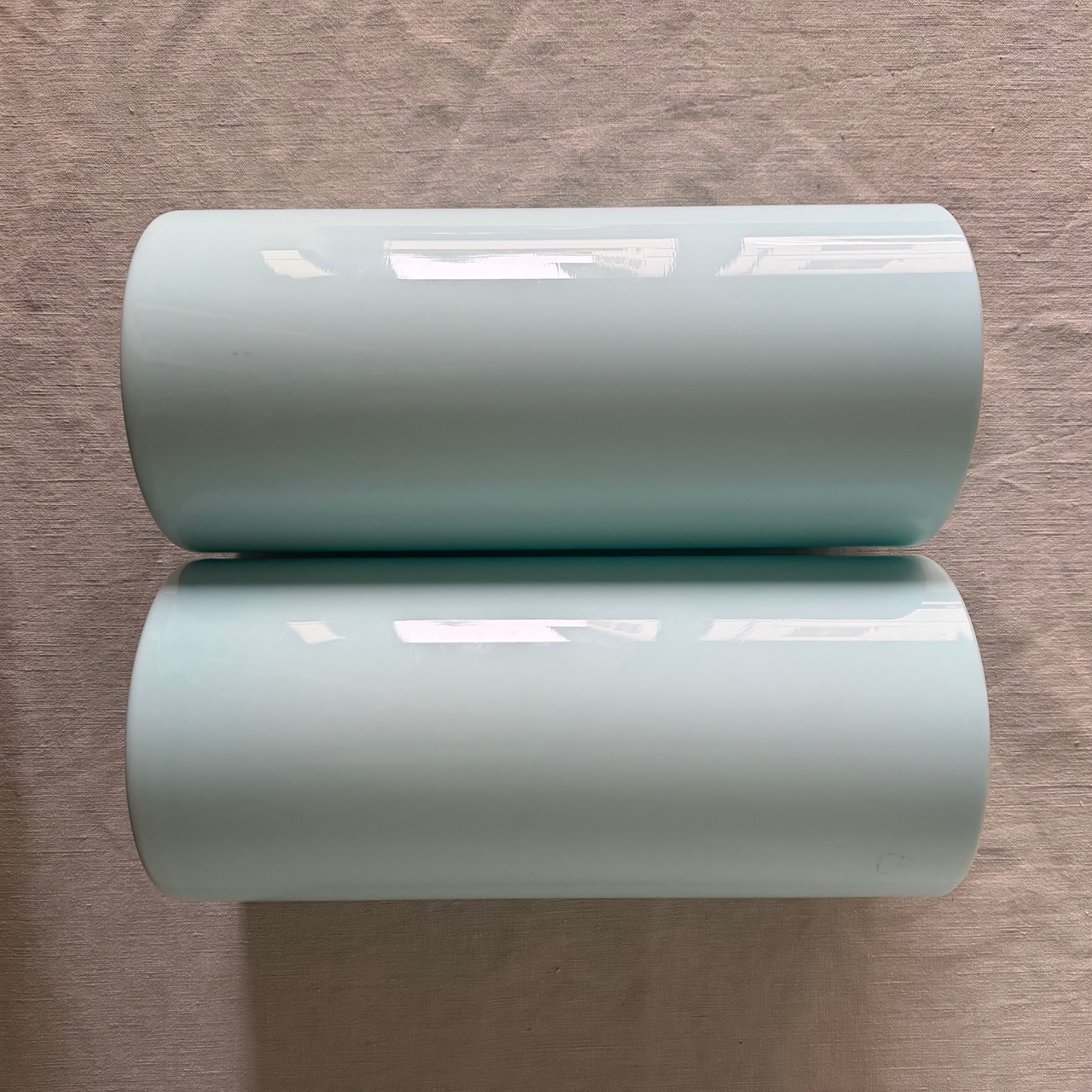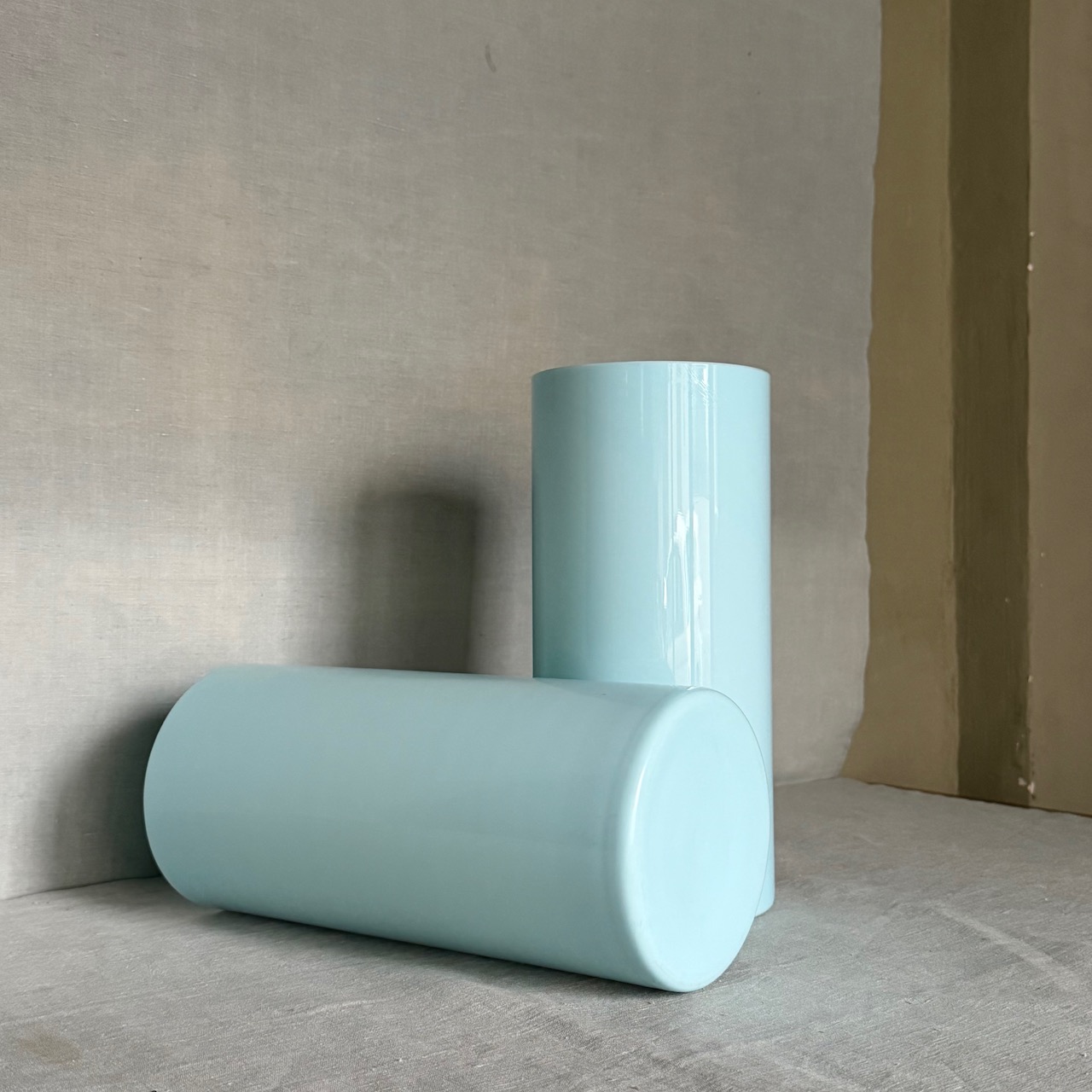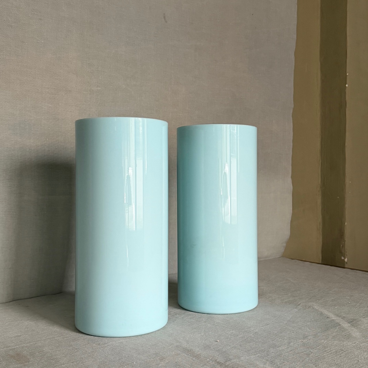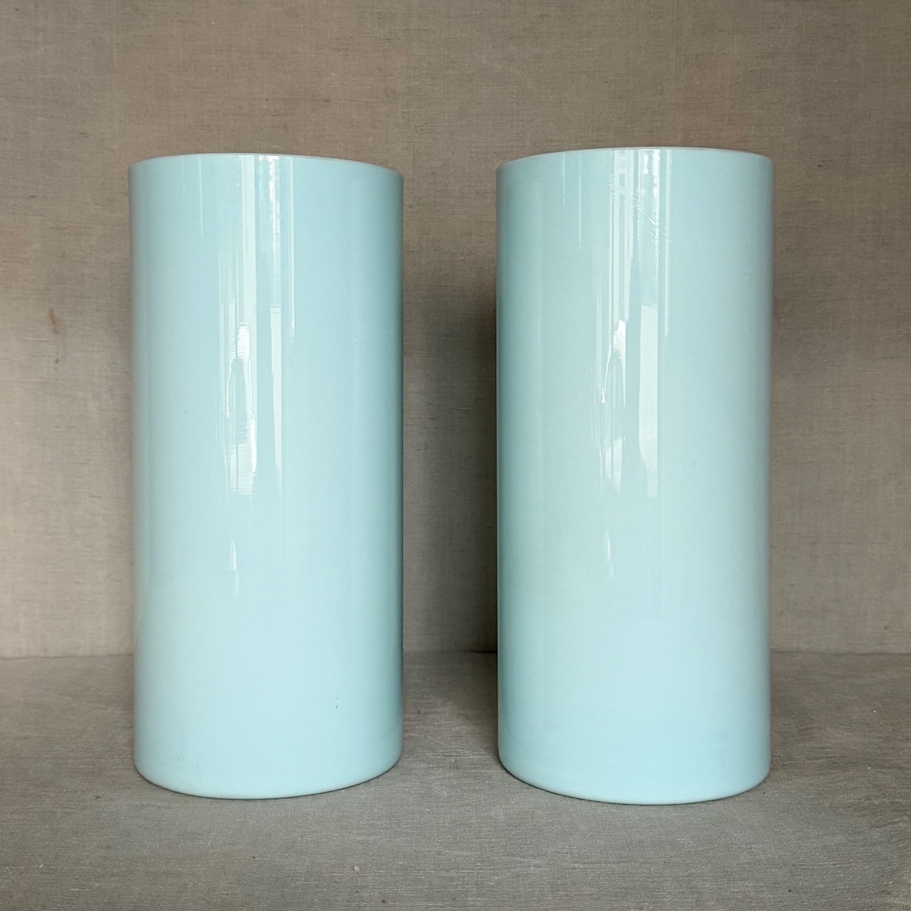 Coppia vasi a cilindro in opalino cielo. Italia, sec. XX
