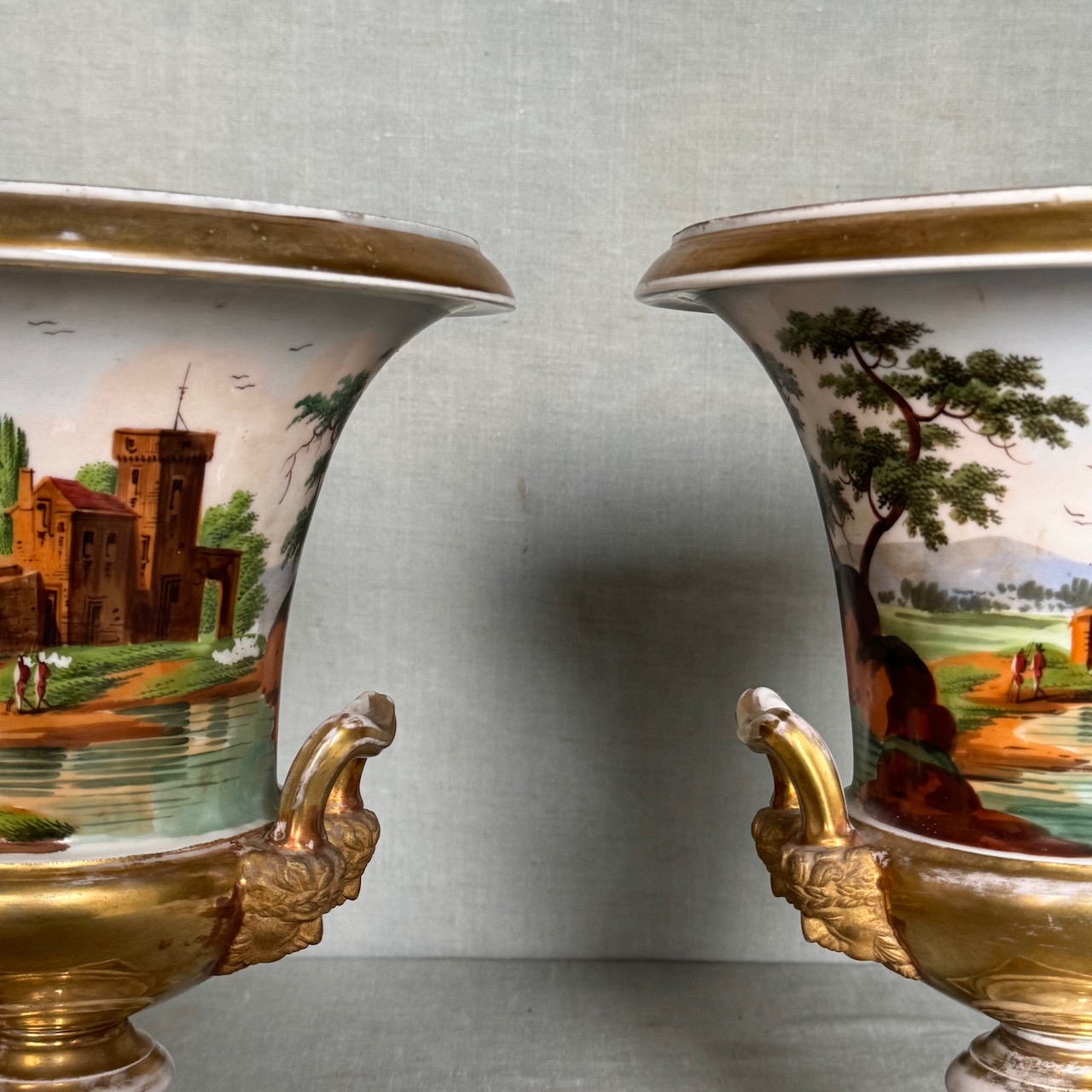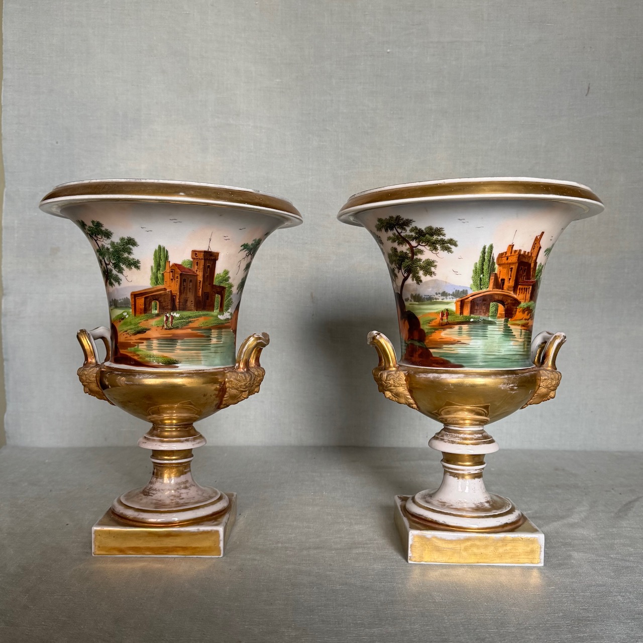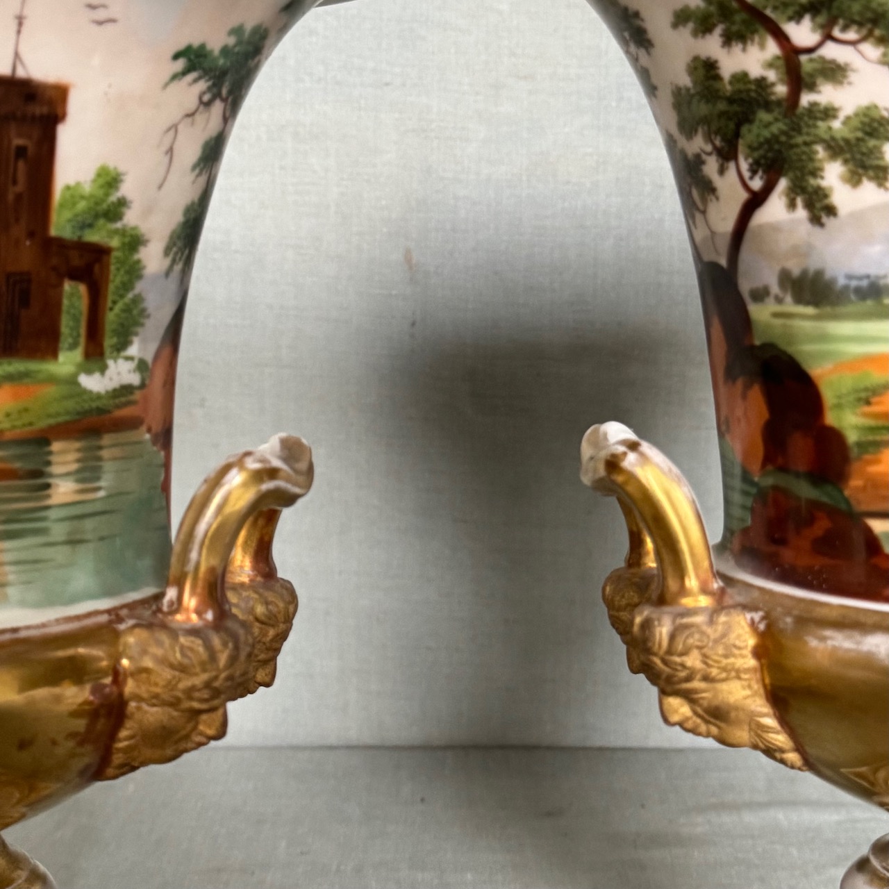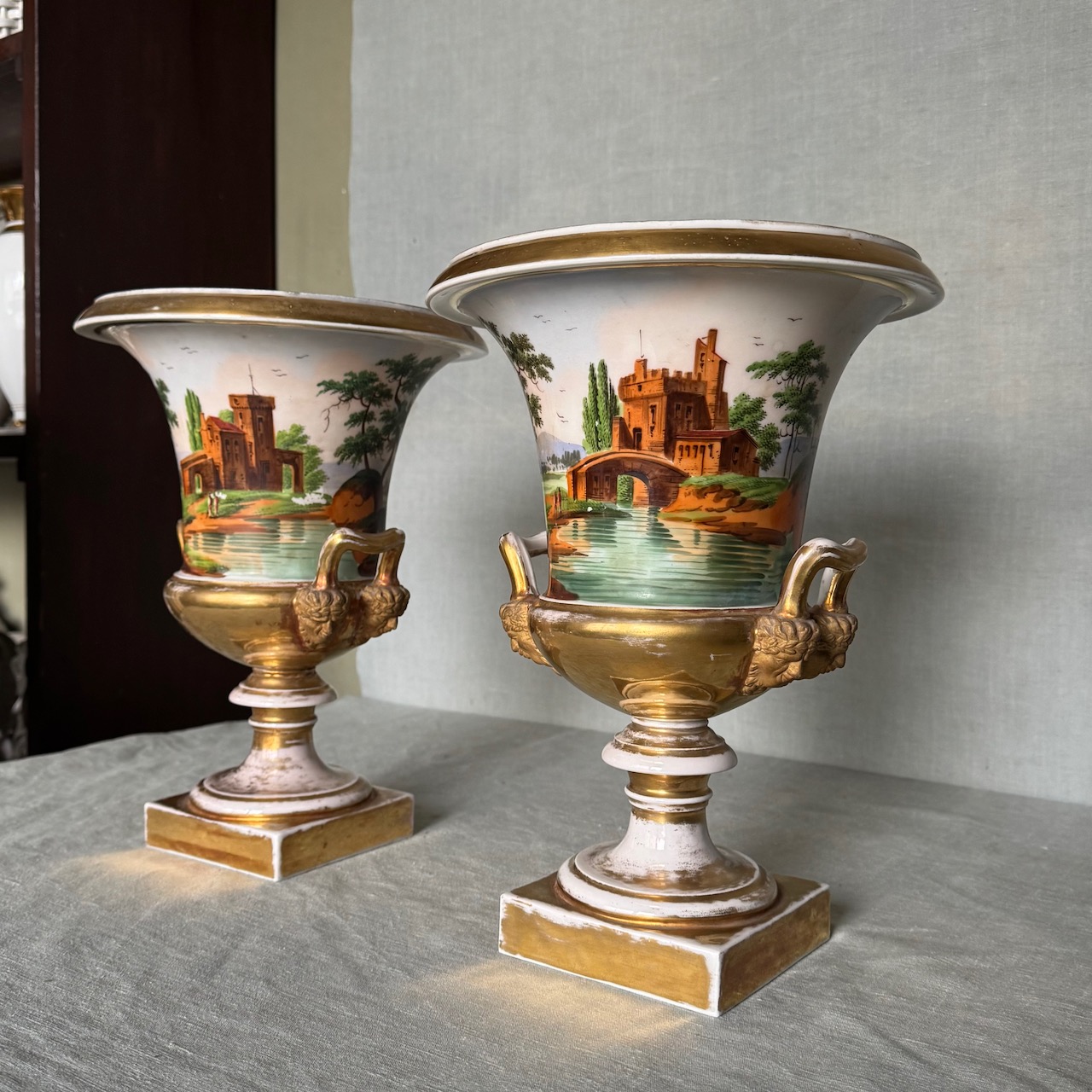 Coppia vasi Medici in porcellana policroma, vedute di paesaggio fluviale, lumeggiare oro, prese a mascheroni. Italia, sec. XIX