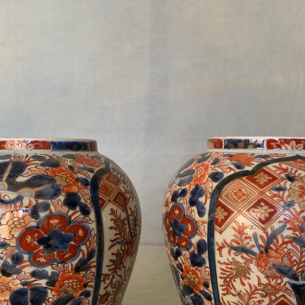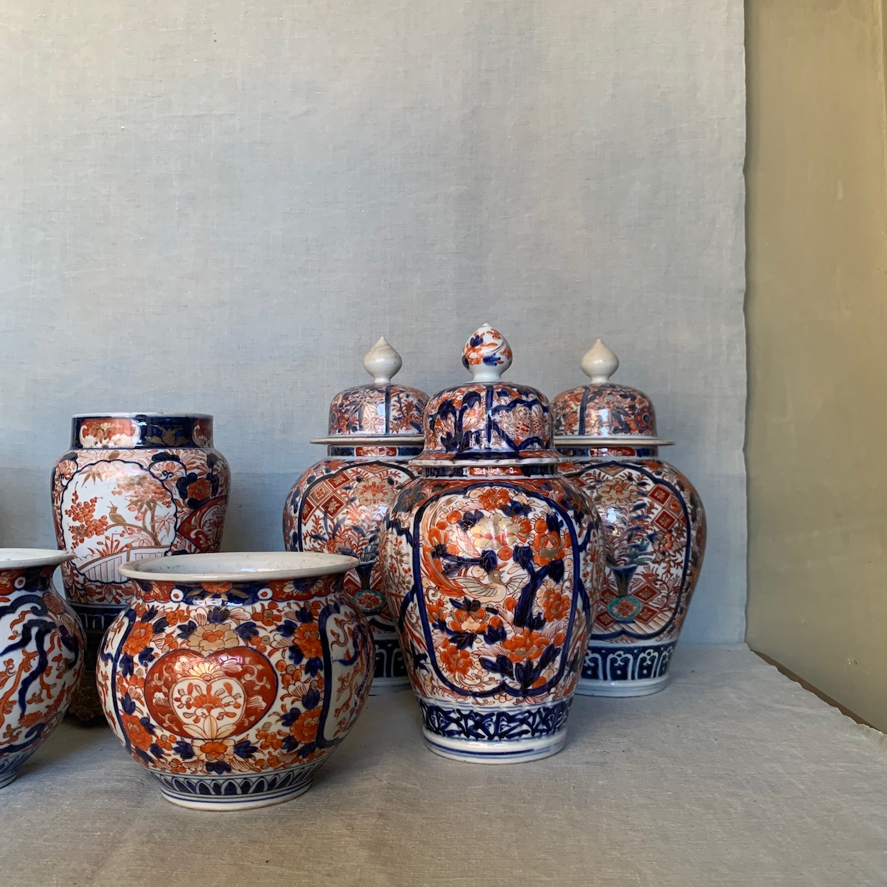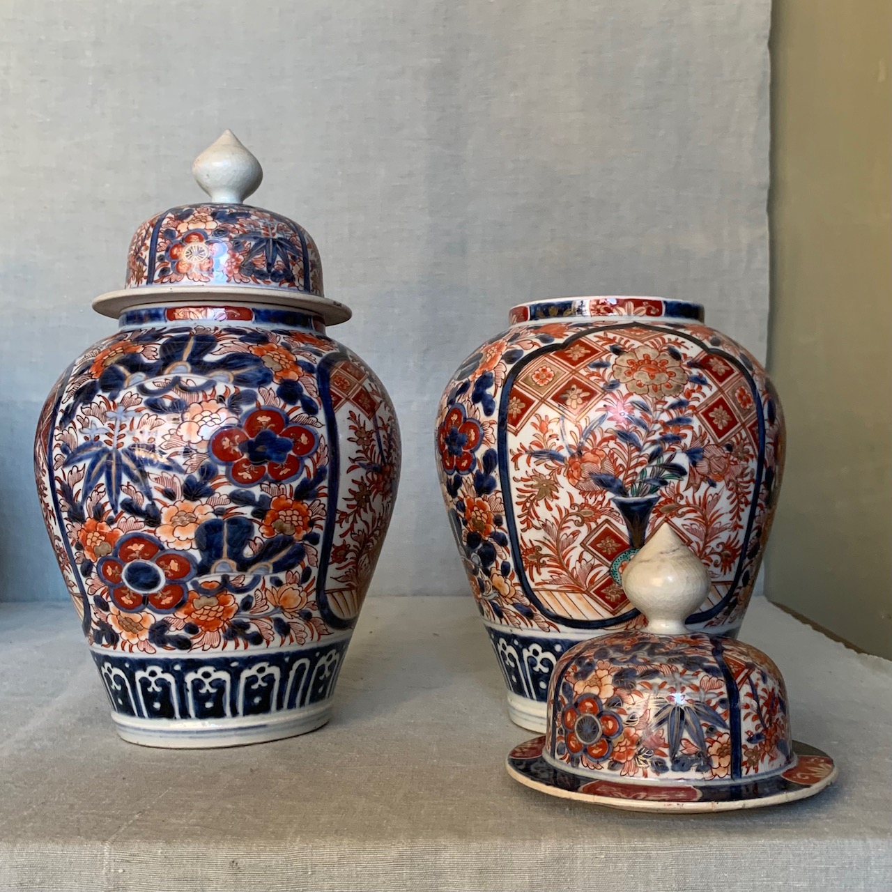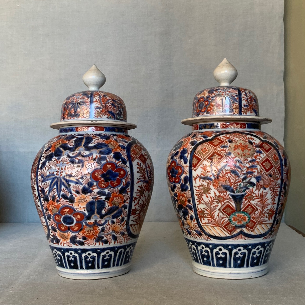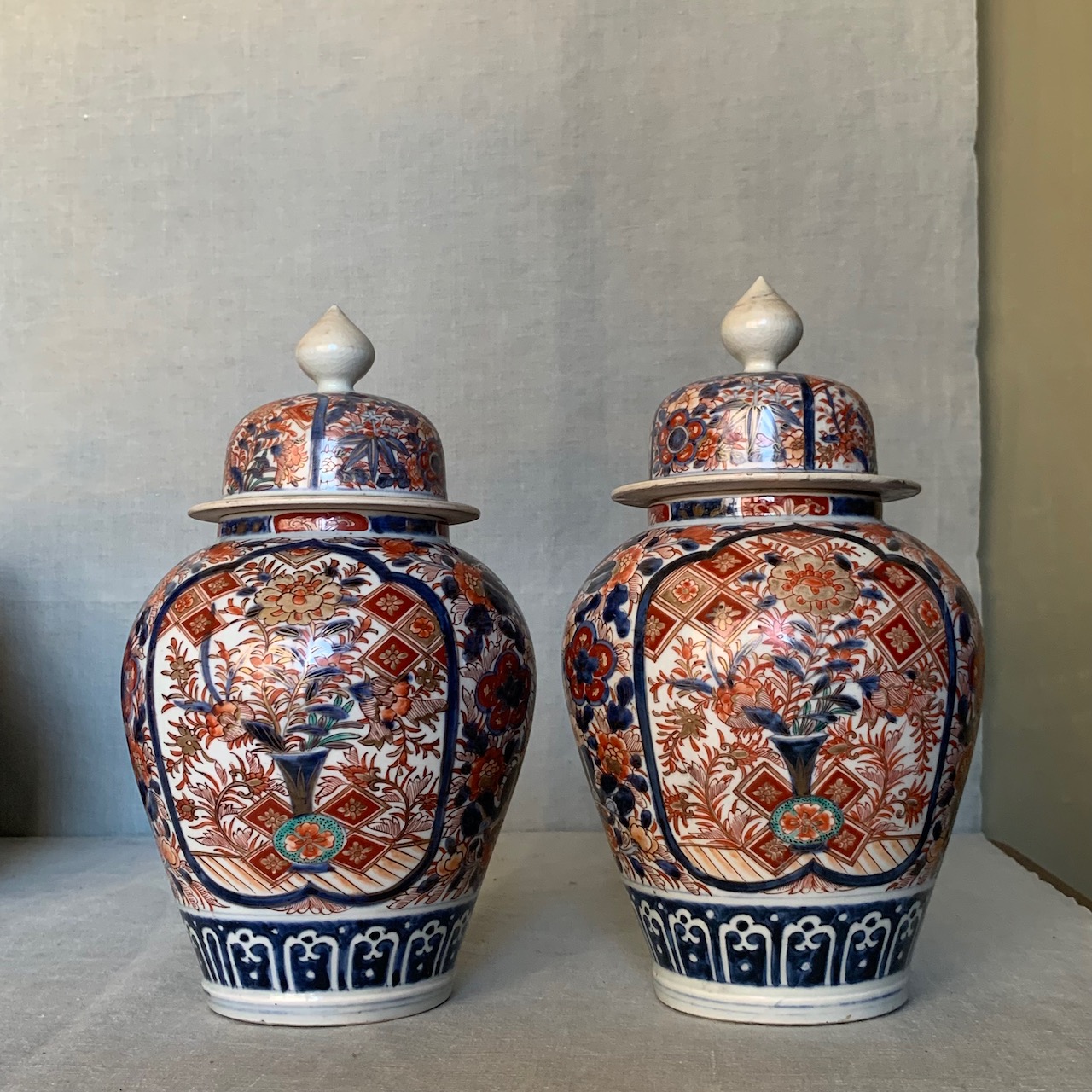 Coppia di vasi in porcellana policroma imari con coperchi del tardo periodo Edo. Giappone, metà sec. XIX
