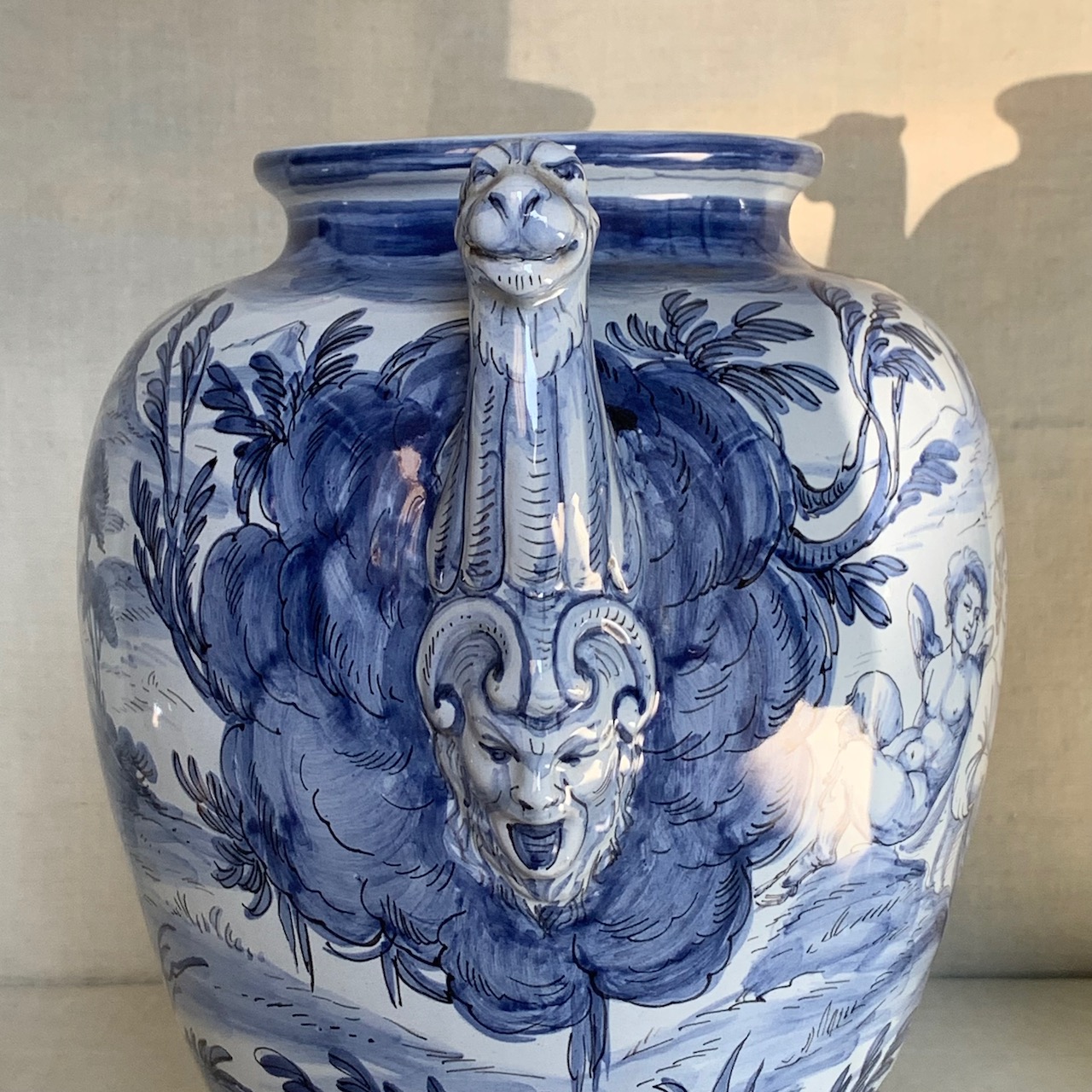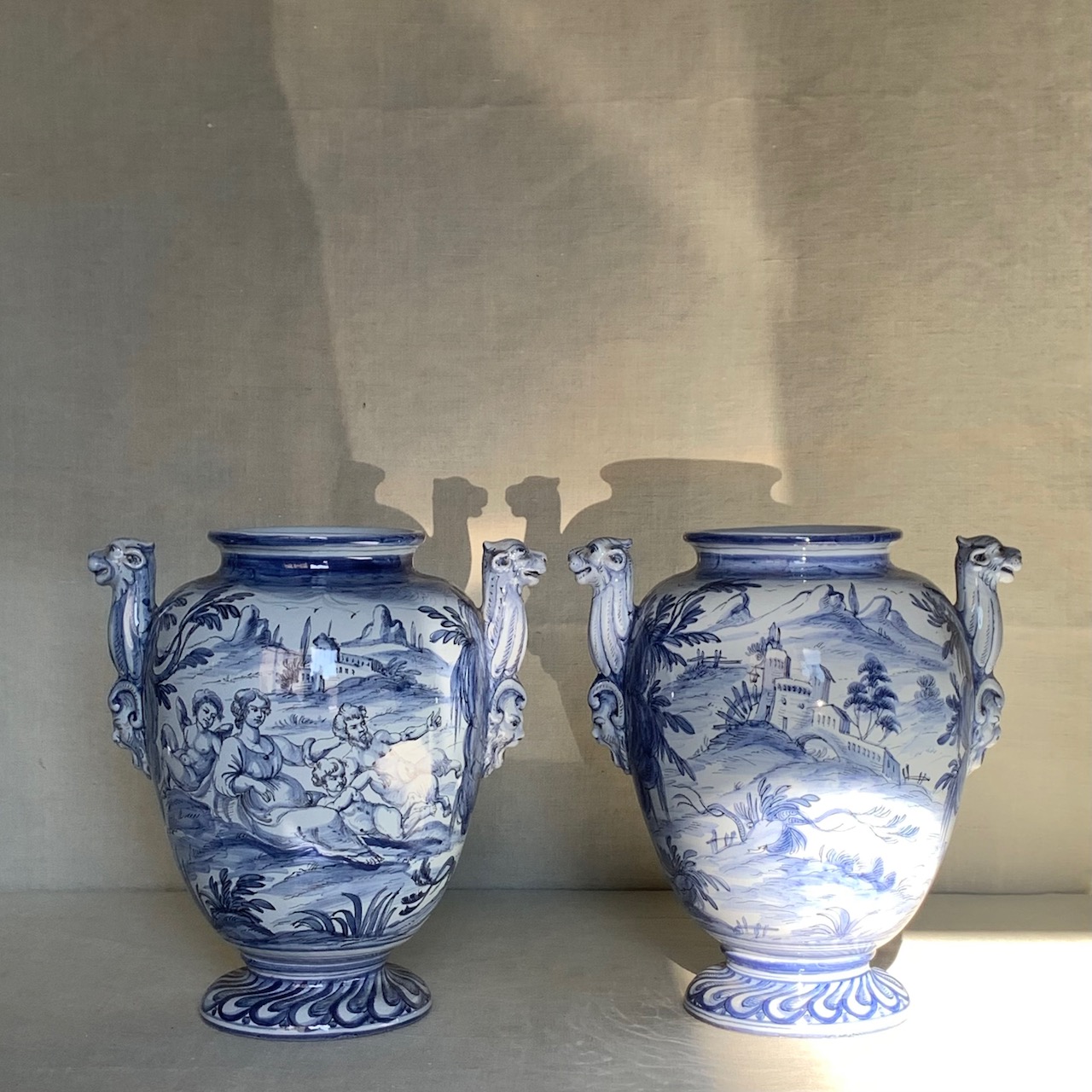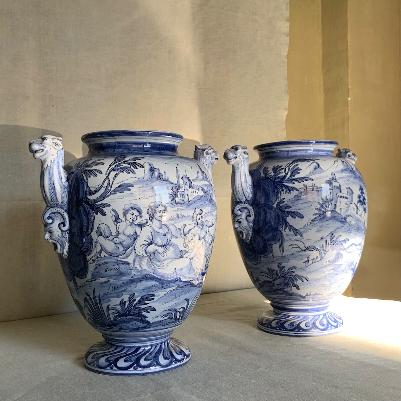 Coppia vasi in terracotta smaltata, decorata in monocromia blu, scena allegorica e amorini sulla parte frontale, prese zoomorfe con attacco a mascherone. Italia, sec. XX