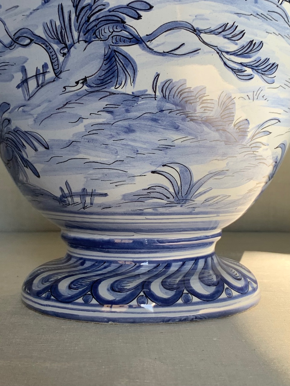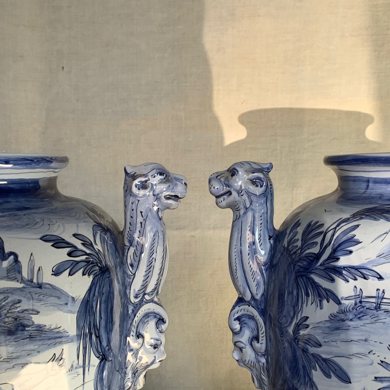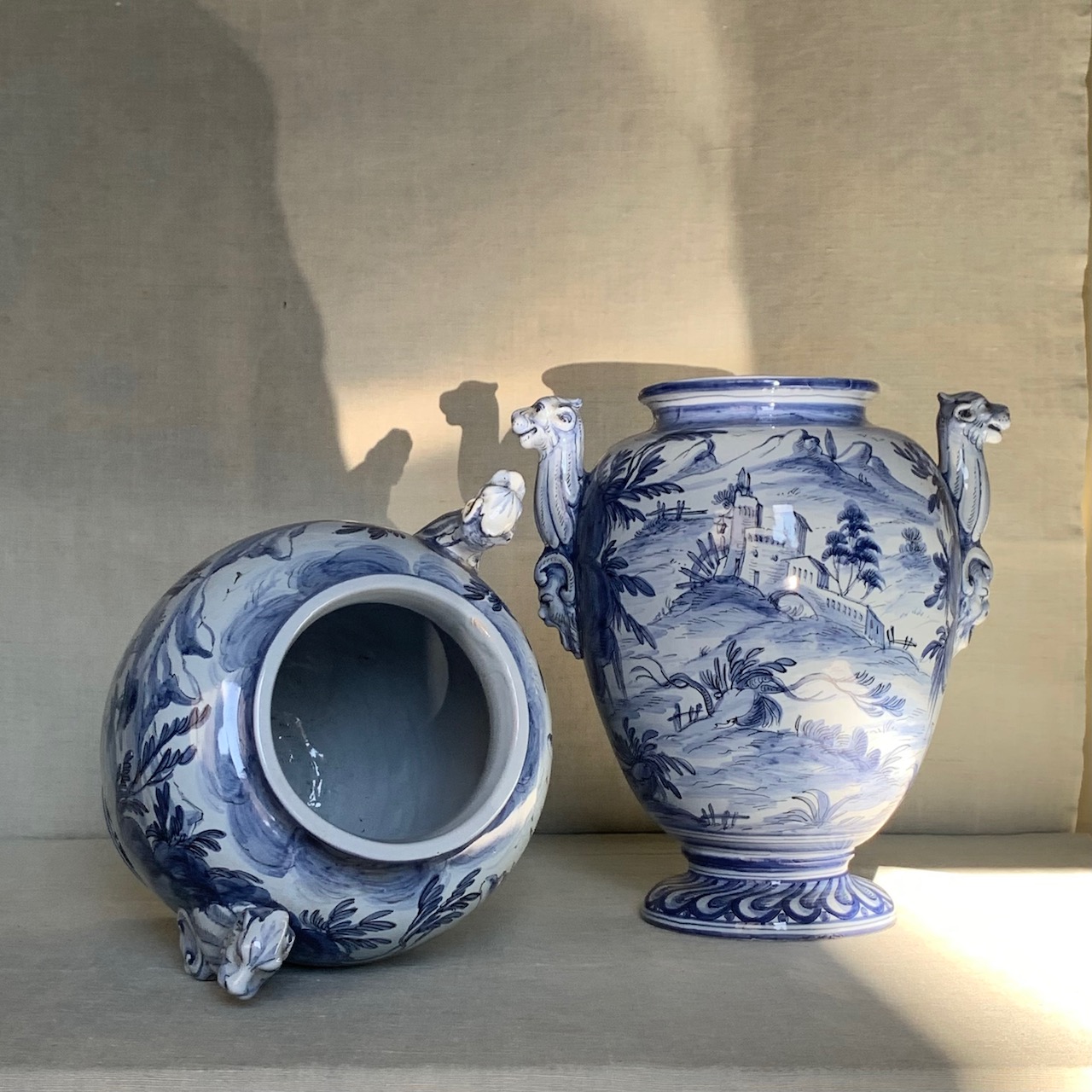 Coppia vasi in terracotta smaltata, decorata in monocromia blu, scena allegorica e amorini sulla parte frontale, prese zoomorfe con attacco a mascherone. Italia, sec. XX