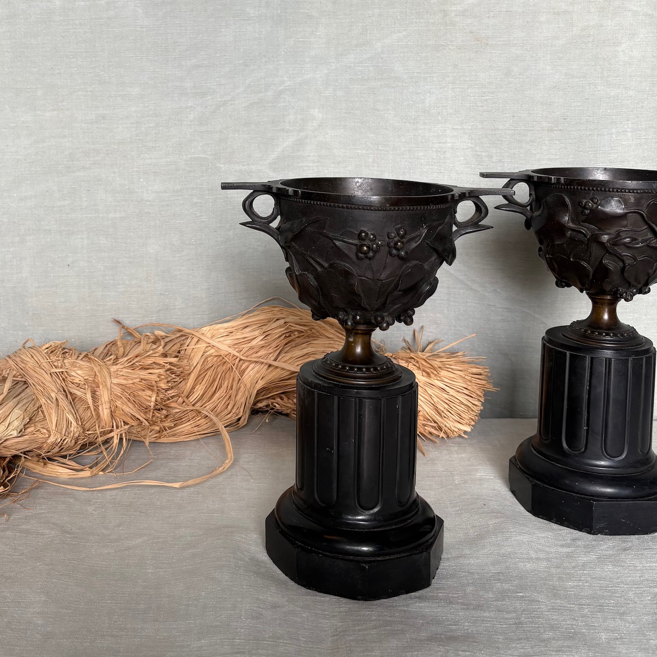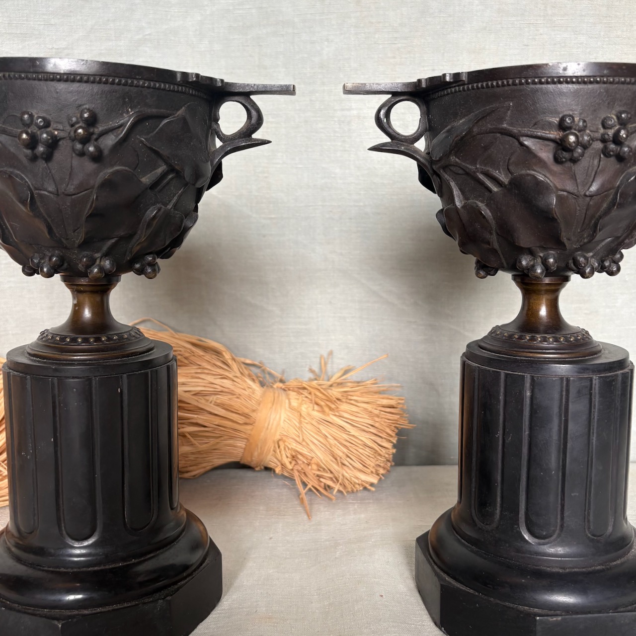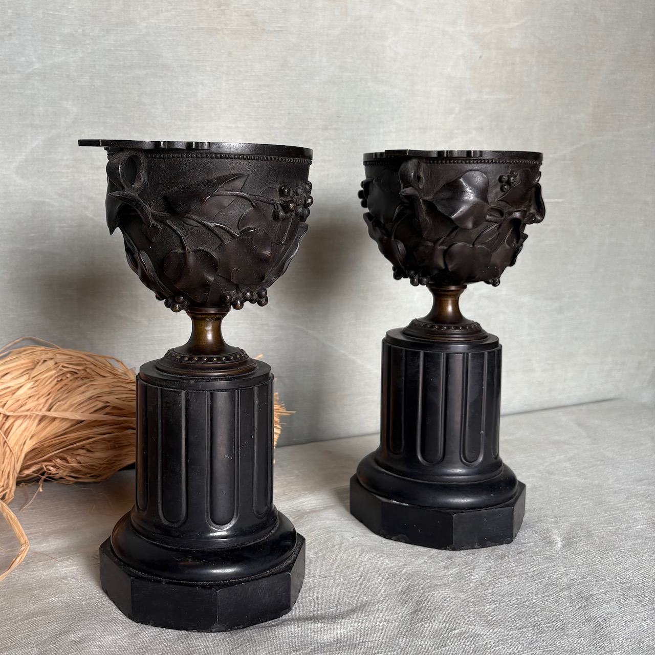 Coppie di urne in bronzo a patina bruna su basi a colonna ottagonale in marmo nero. Francia, sec. XIX