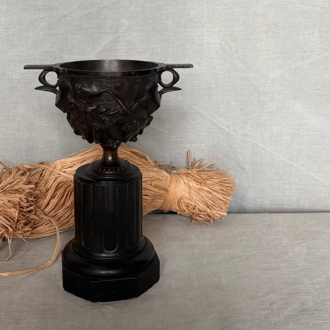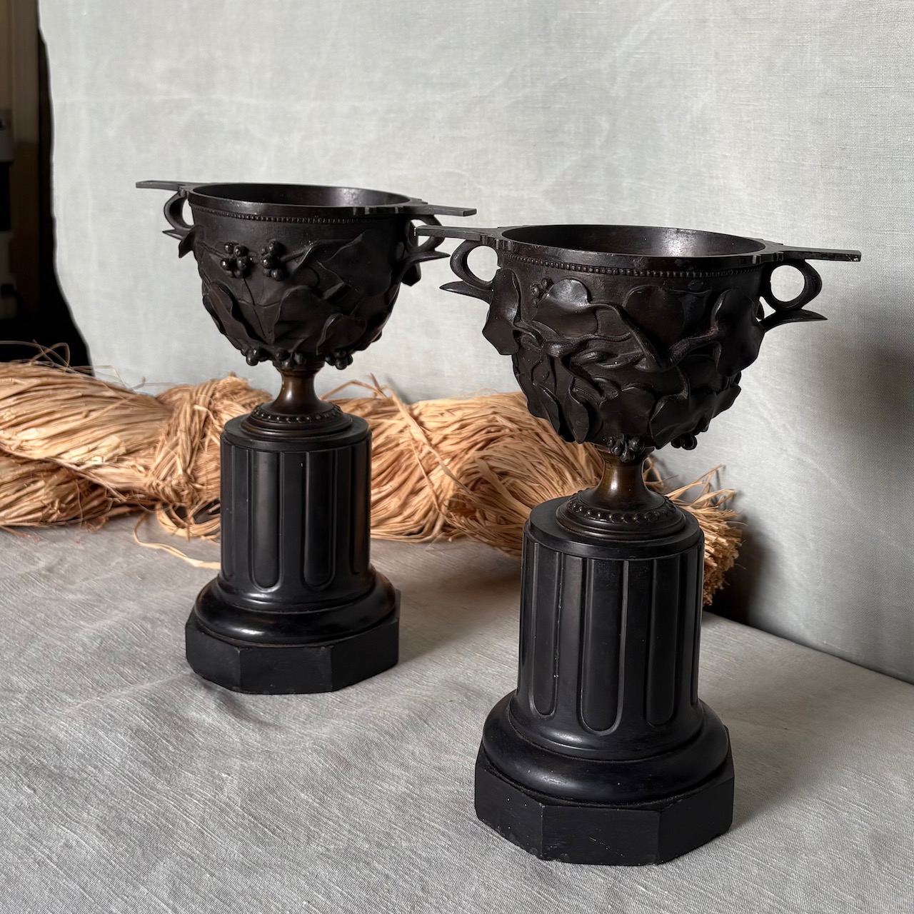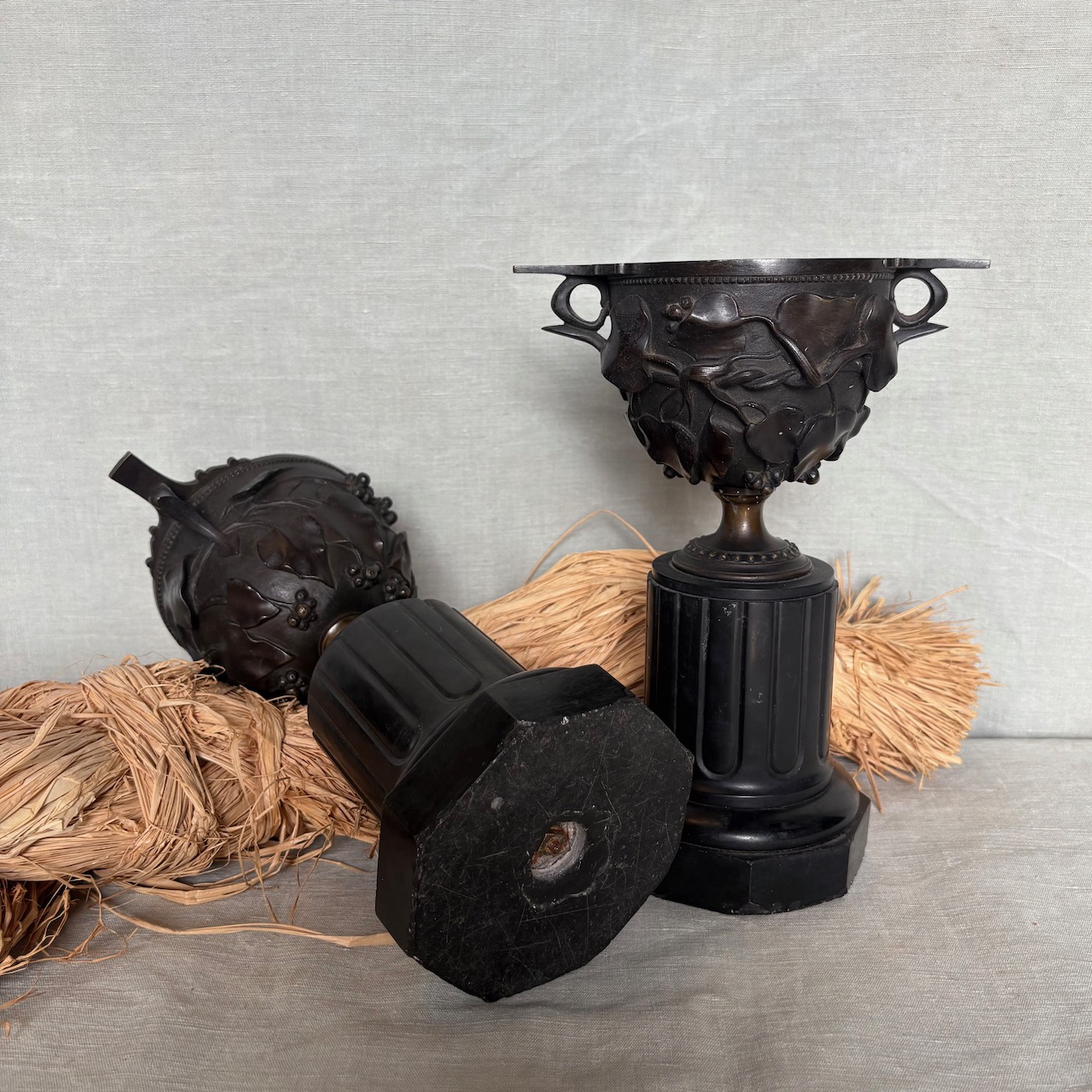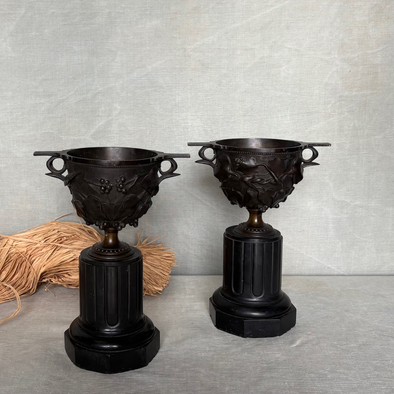 Coppie di urne in bronzo a patina bruna su basi a colonna ottagonale in marmo nero. Francia, sec. XIX