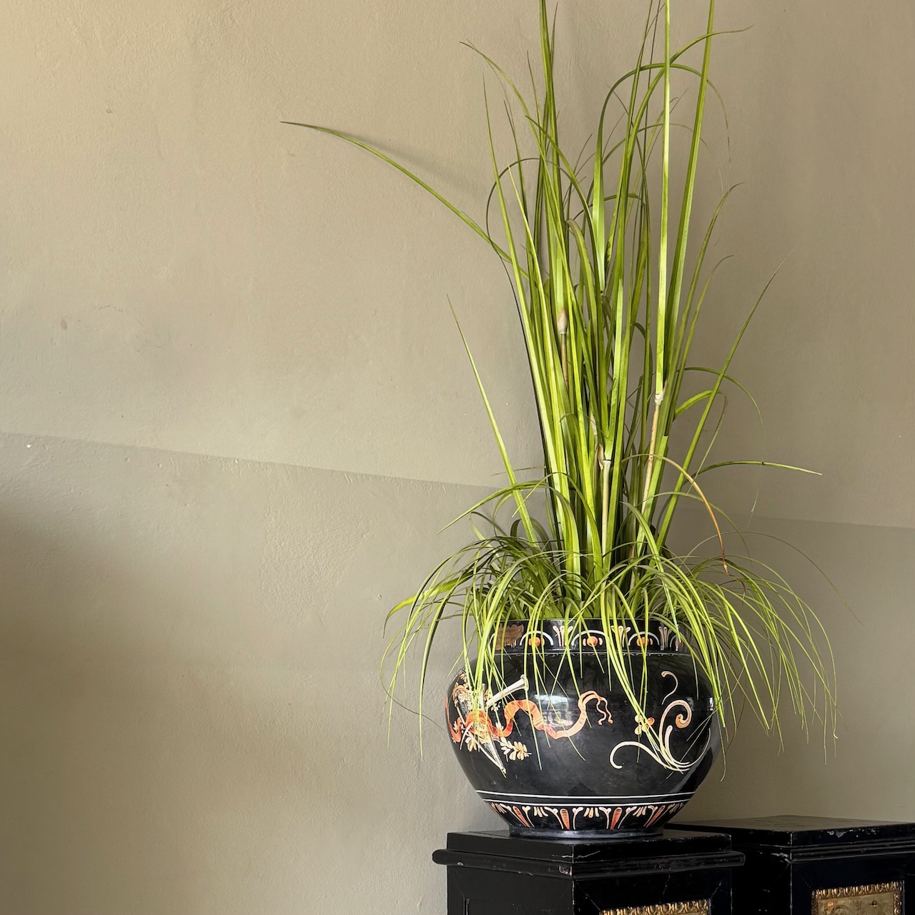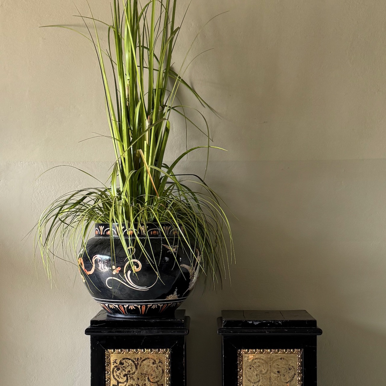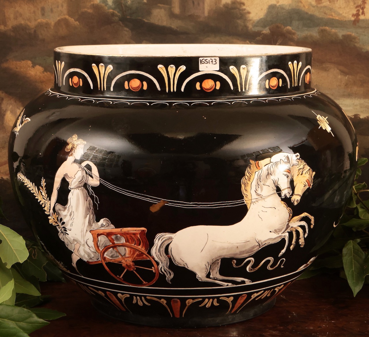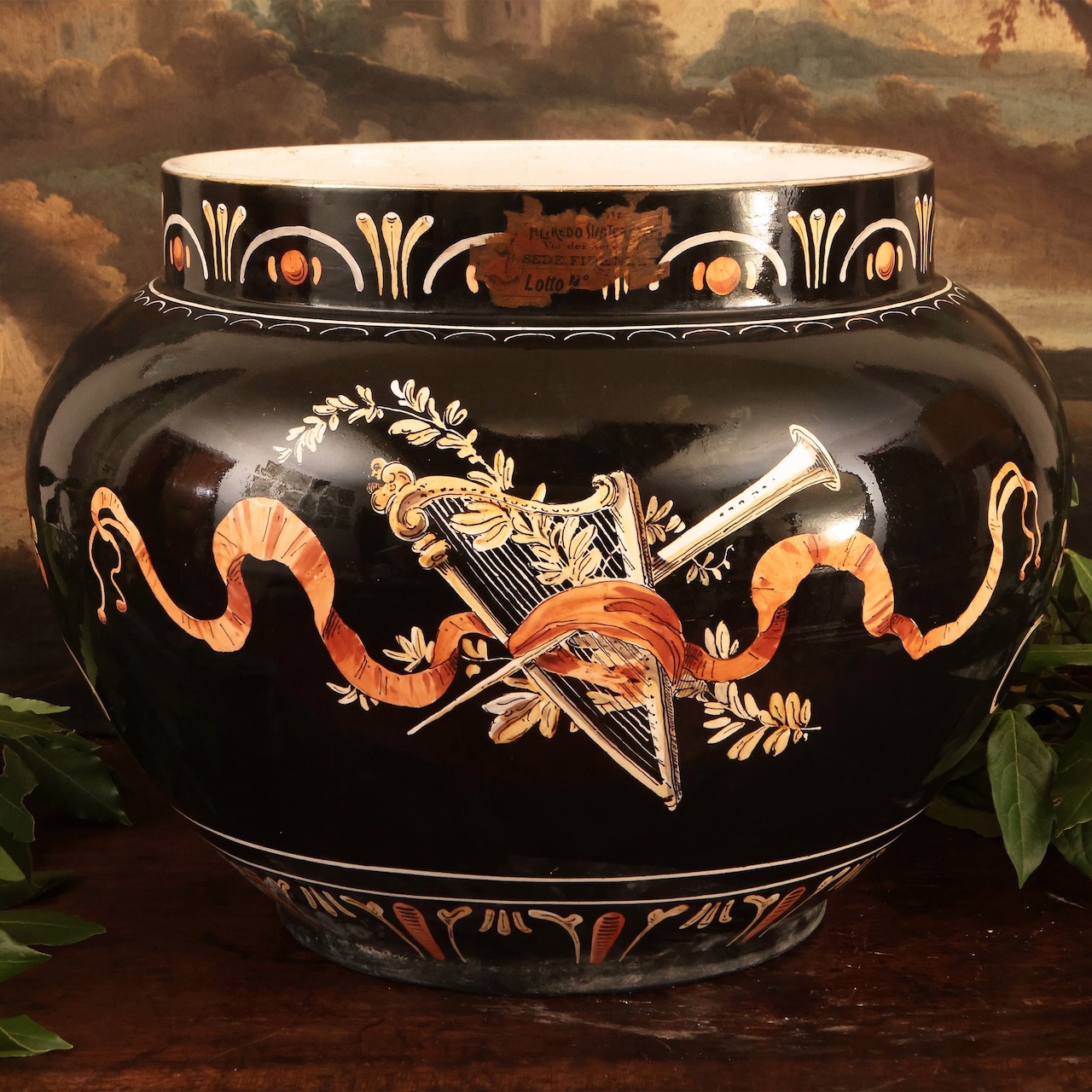 Portavasi in ceramica dipinto con motivo archeologico su fondo nero. Manifattura Laveno. Italia, inizio sec. XX