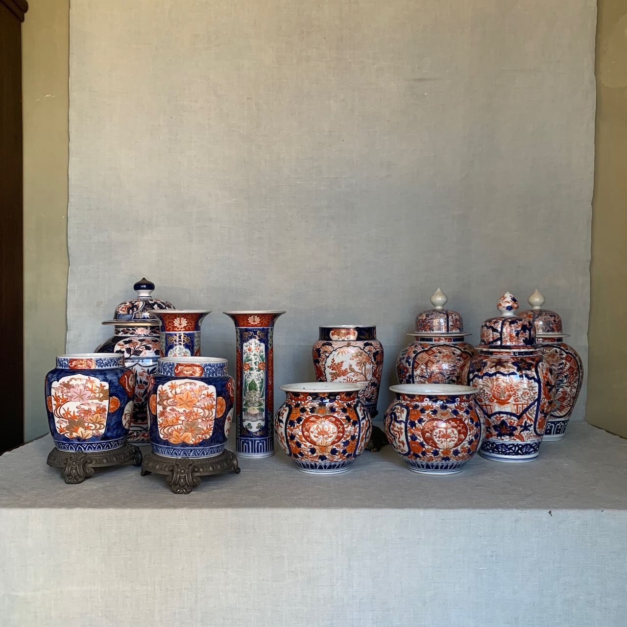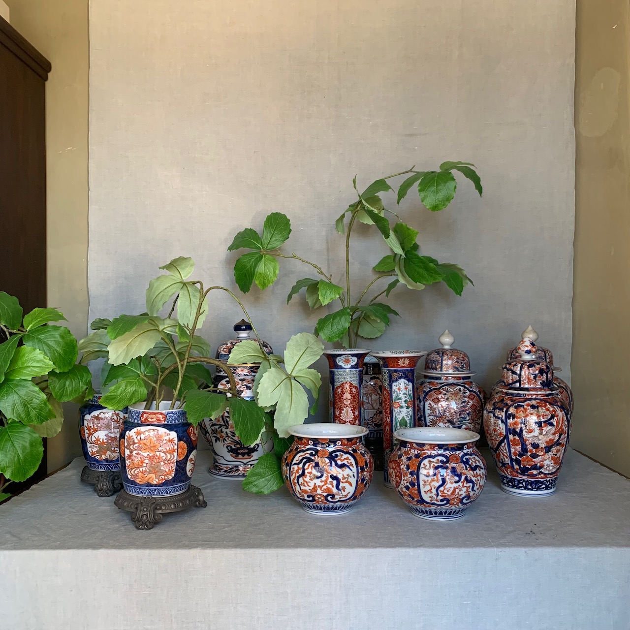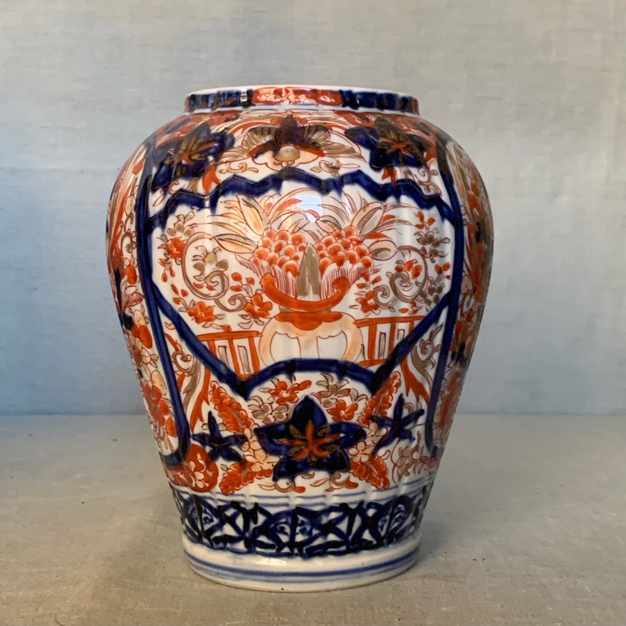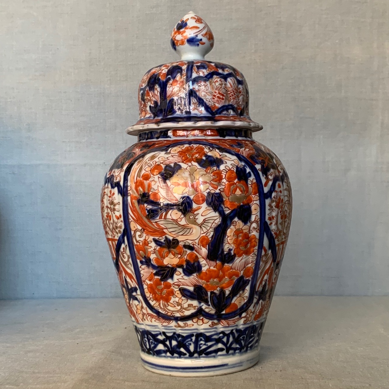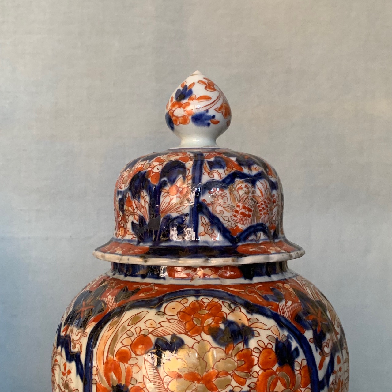 Potiche, vaso in porcellana policroma imari con coperchio e decori blu rosso, del tardo periodo Edo. Giappone, sec. XIX