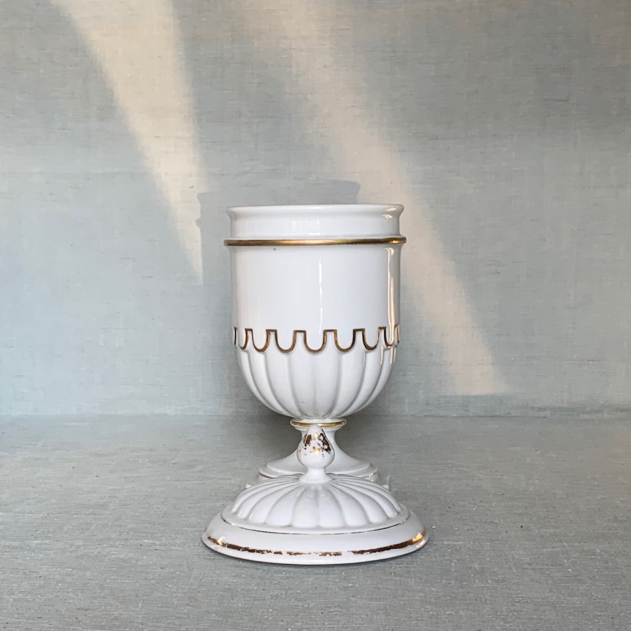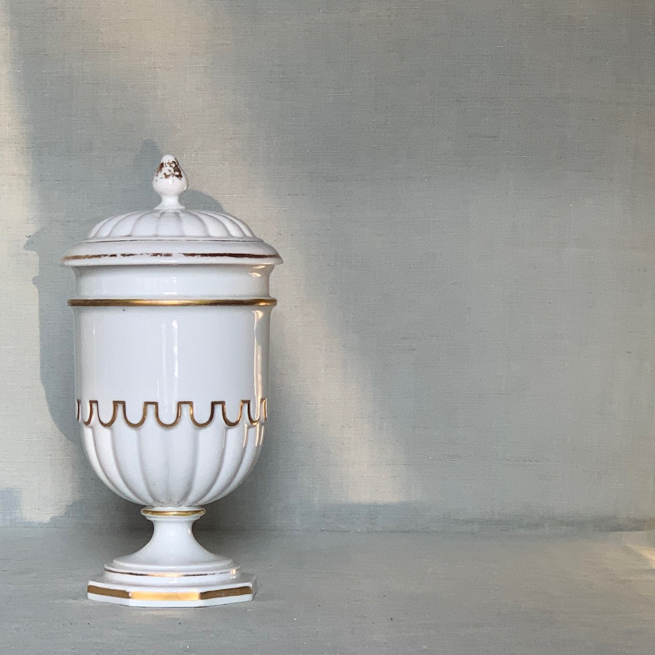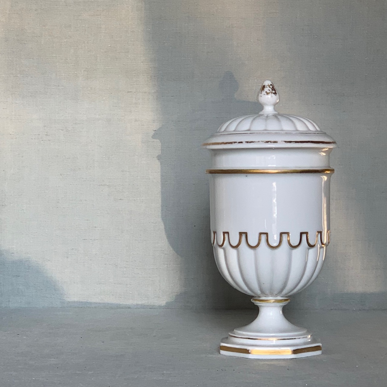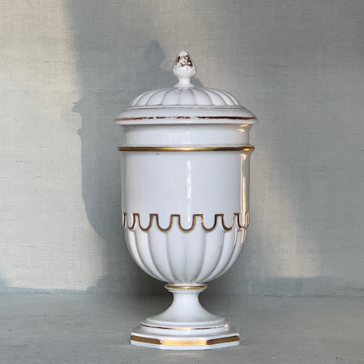 Potiche farmacia in porcellana smaltata bianca con bordo lumeggiato oro. Italia, sec. XX