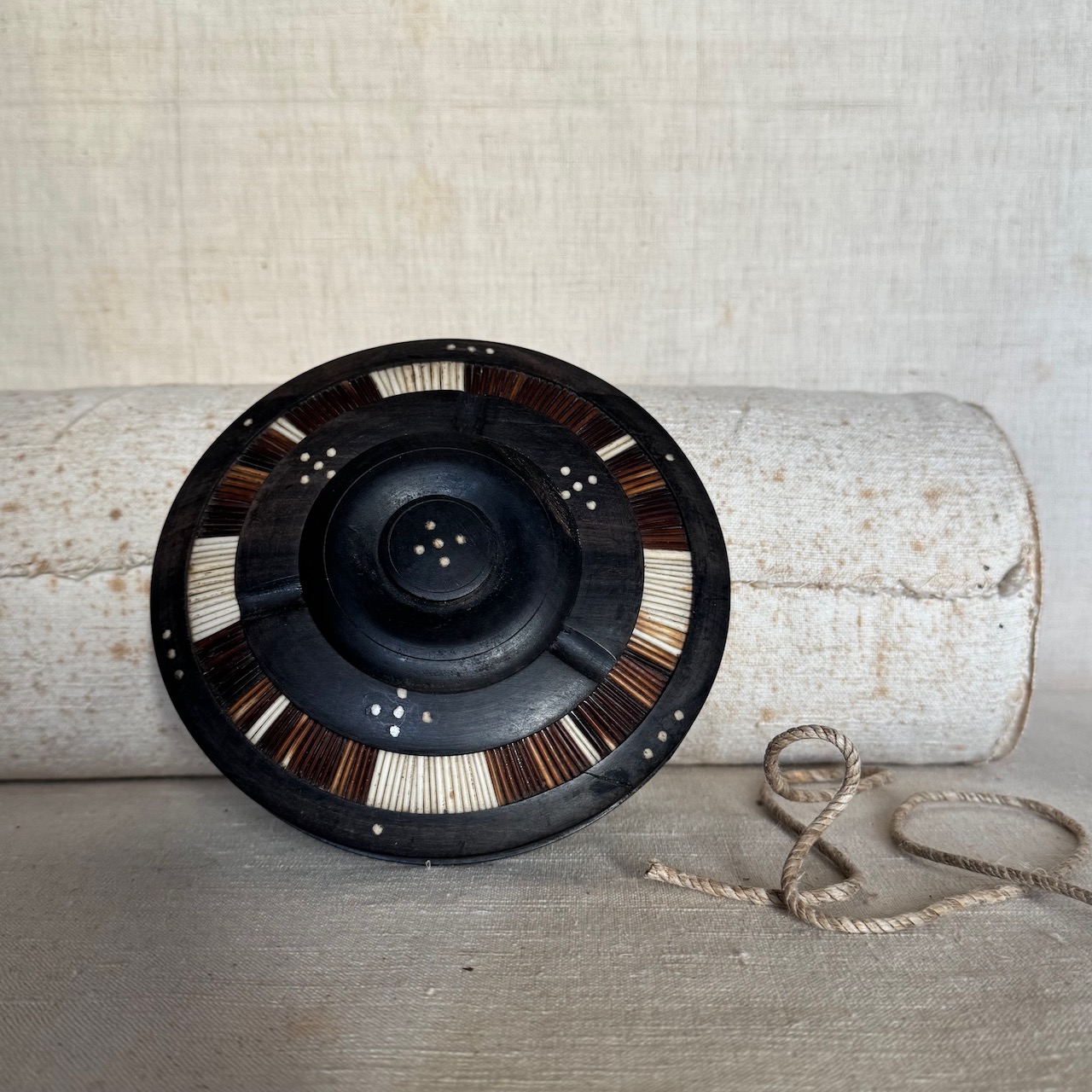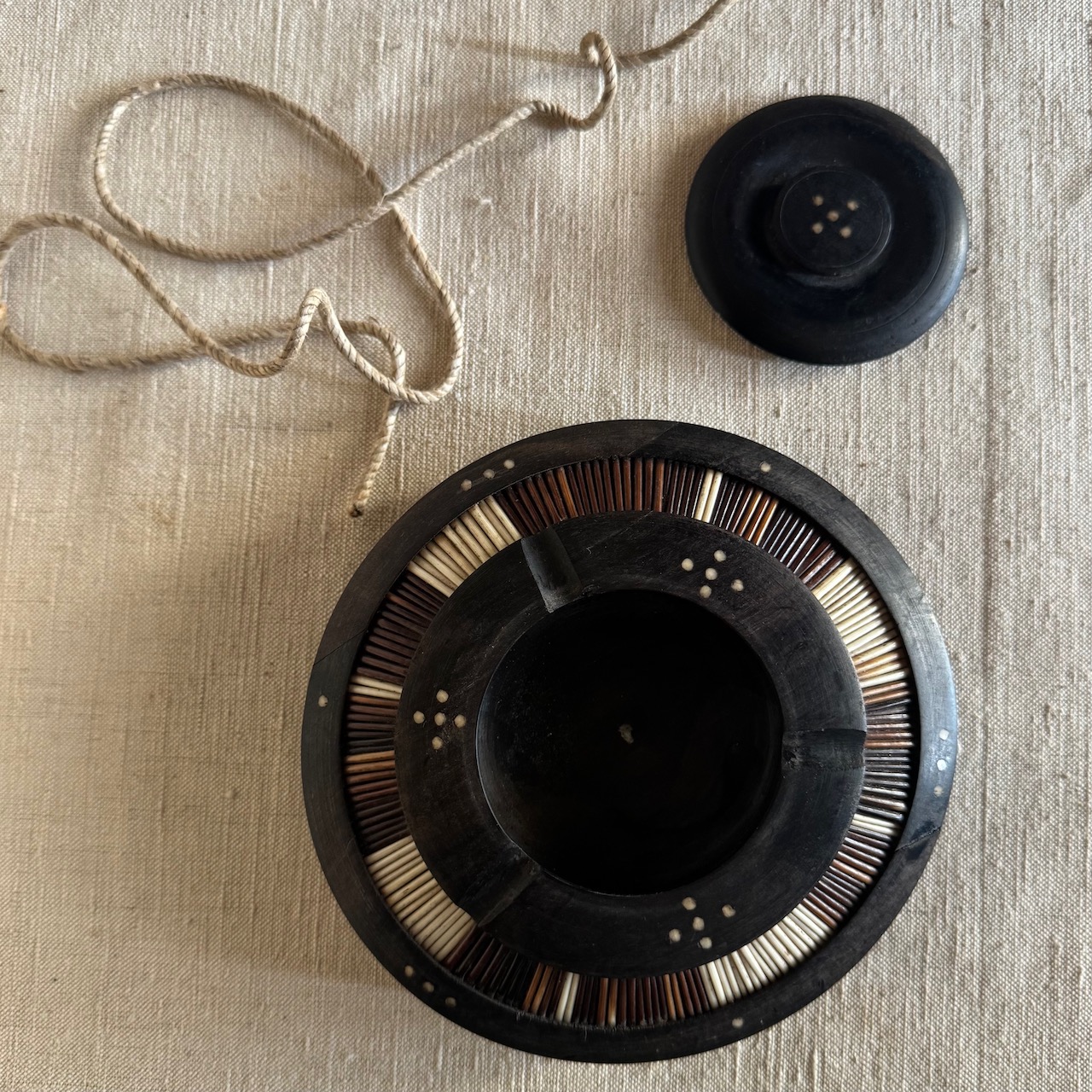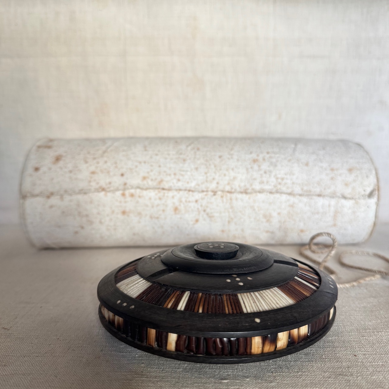 Potiche tonda con coperchio in ebano con inclusioni in avorio e stecche di porcospino. Inghilterra, inizio sec. XX