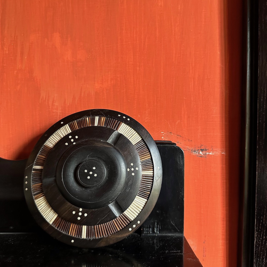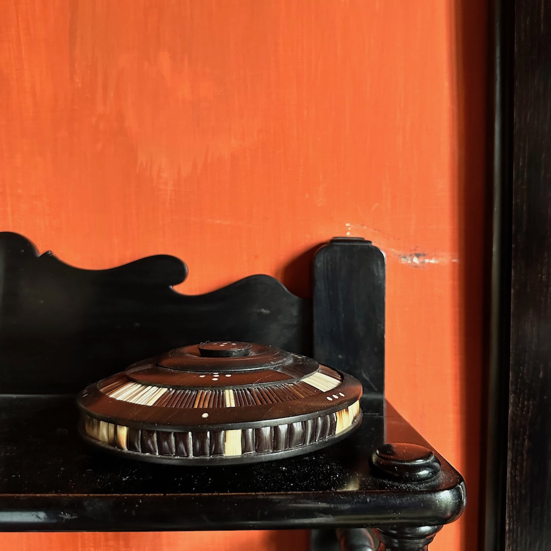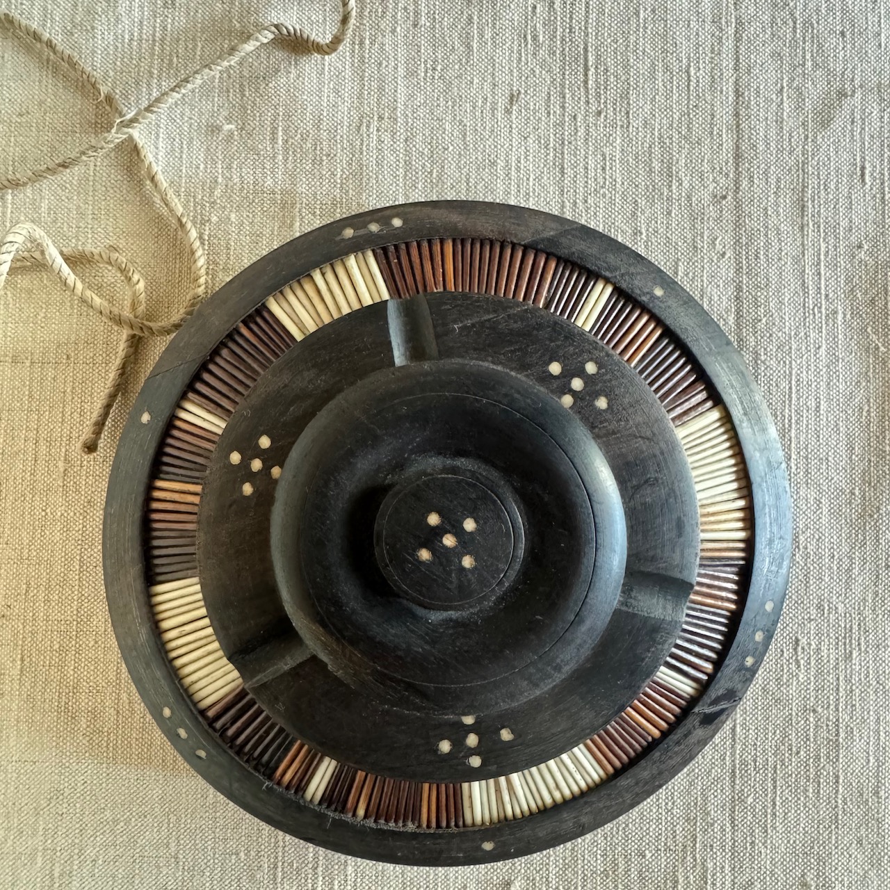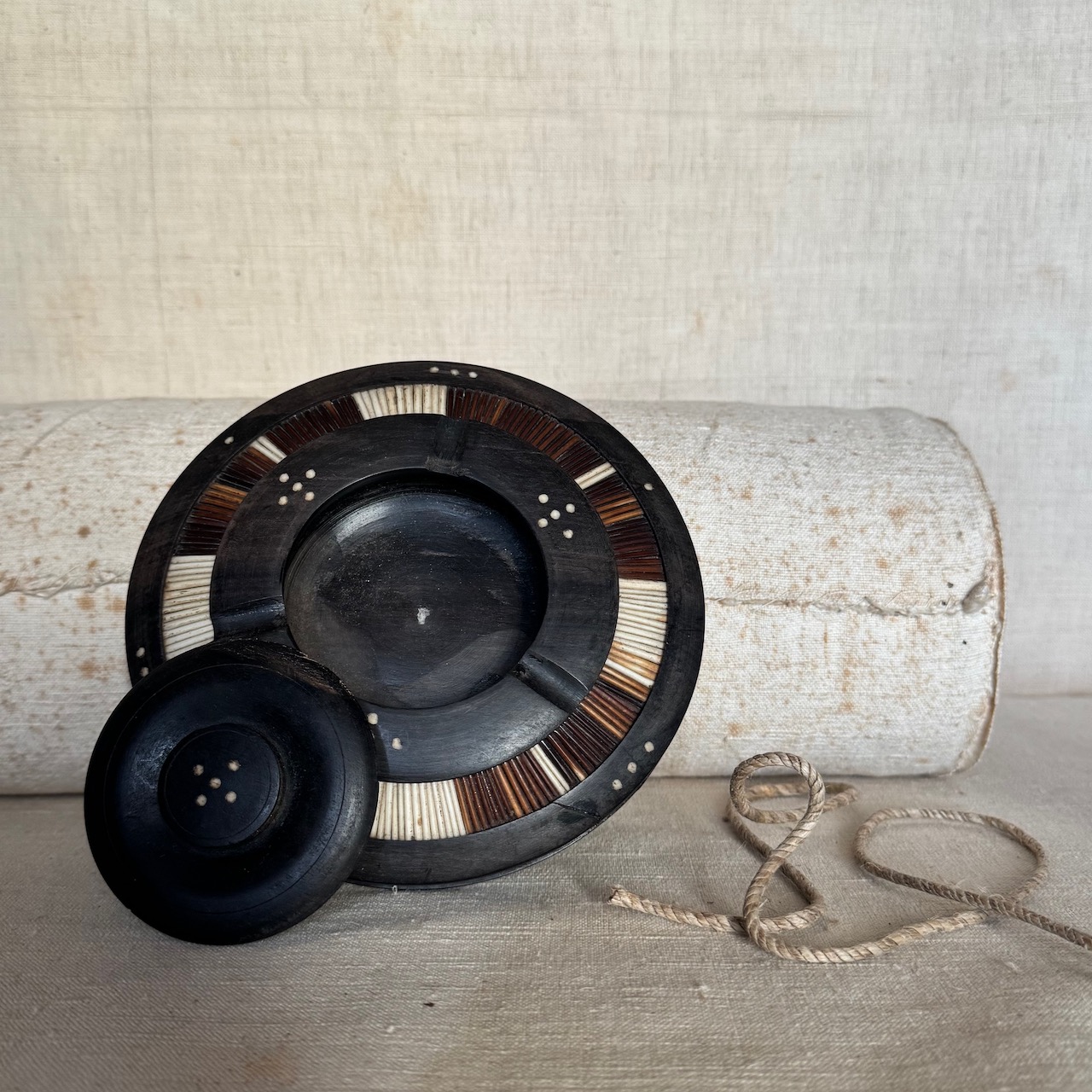 Potiche tonda con coperchio in ebano con inclusioni in avorio e stecche di porcospino. Inghilterra, inizio sec. XX