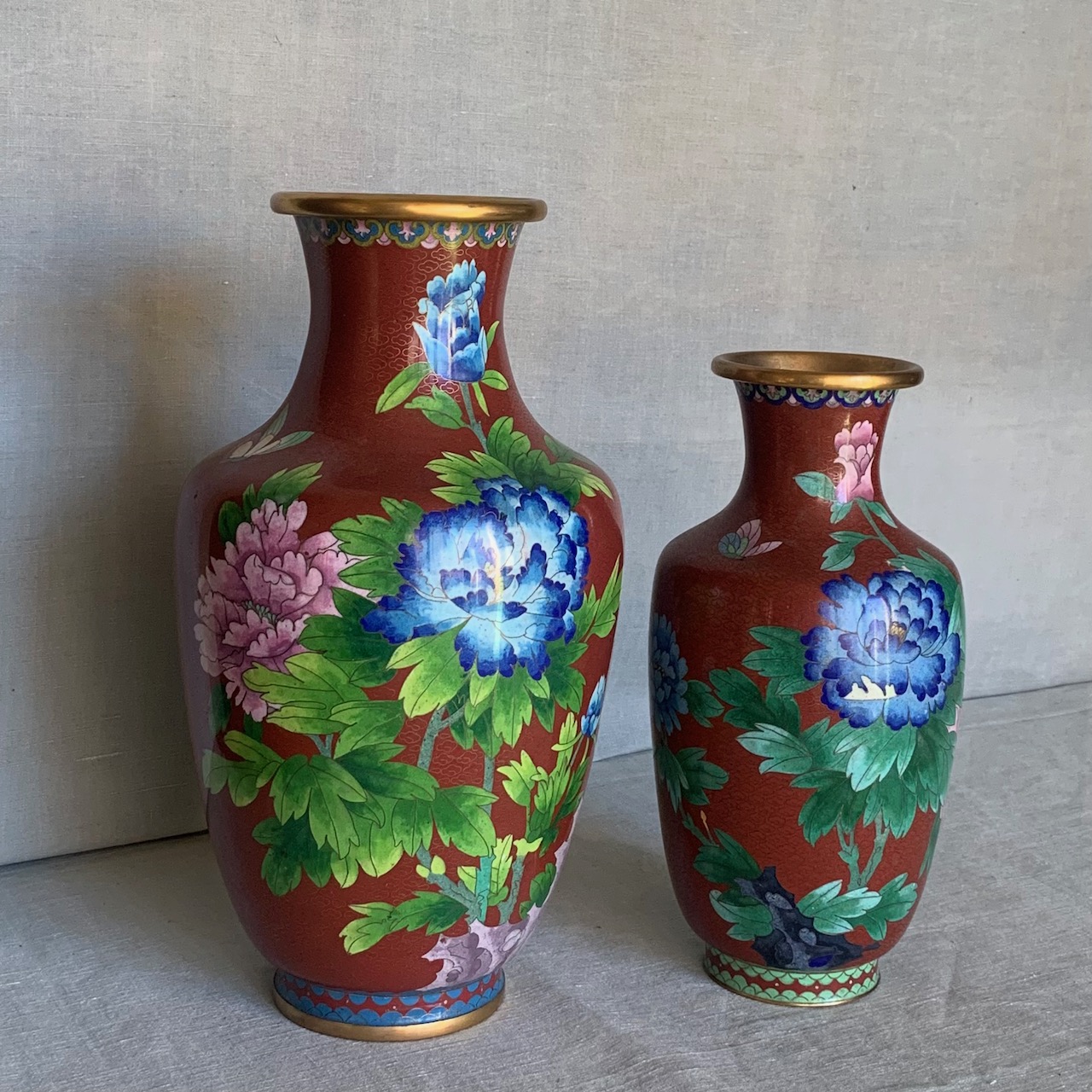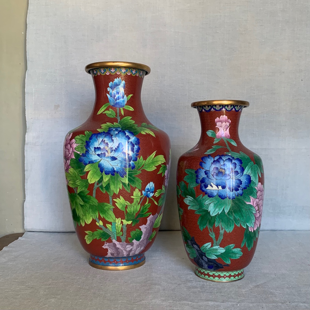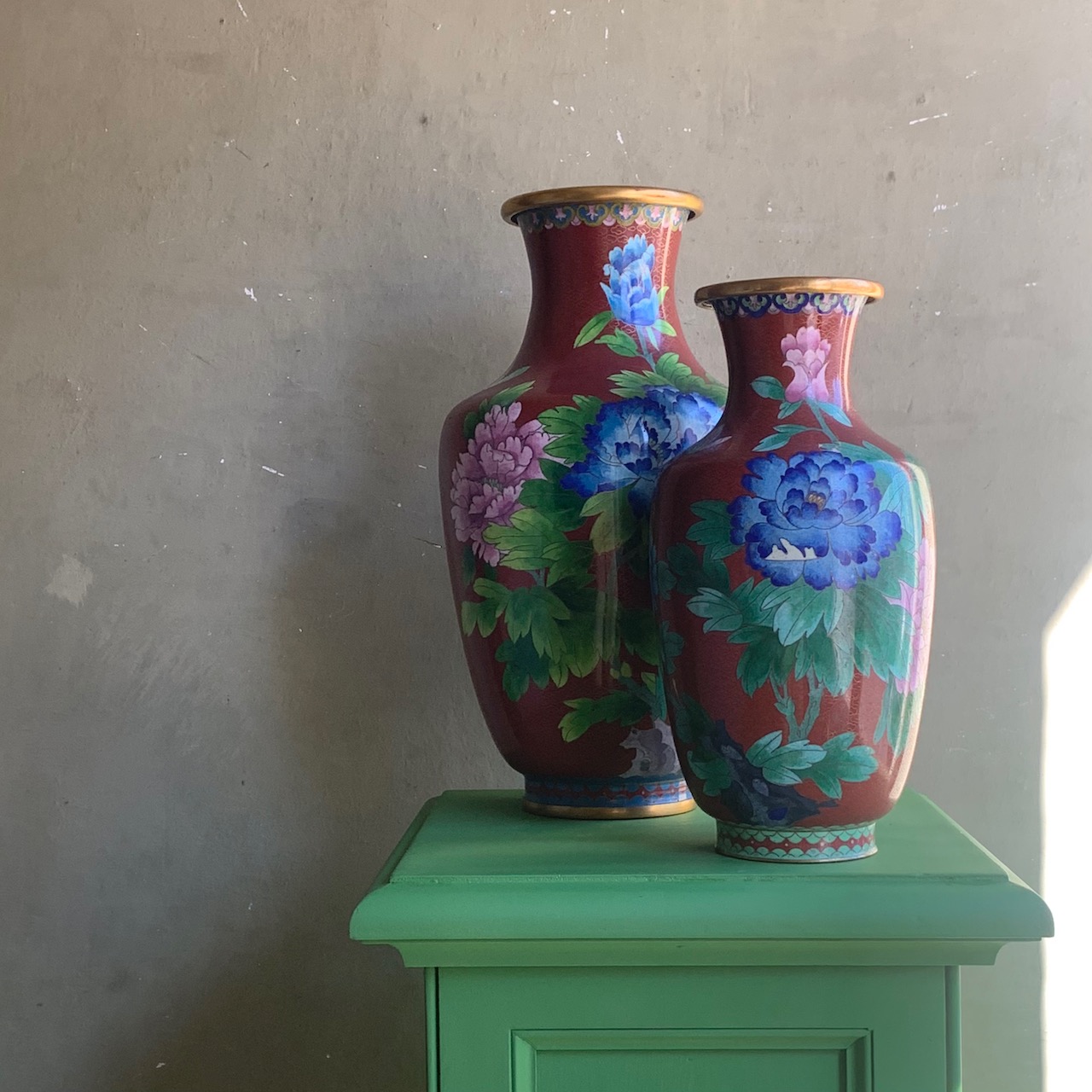 Due vasi a balaustro, smalto su bronzo, decorazione floreale su fondo amaranto. Cina, sec. XX