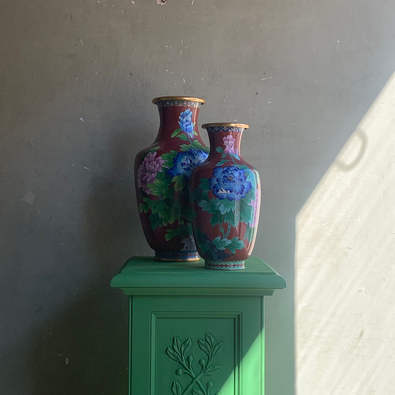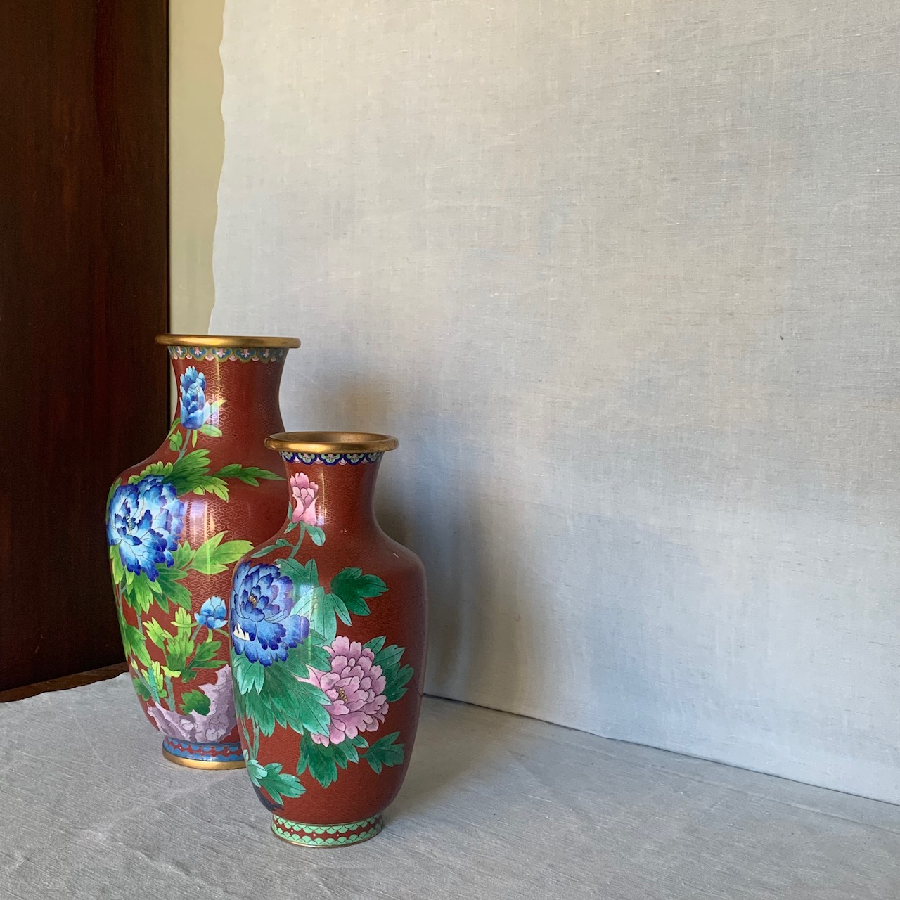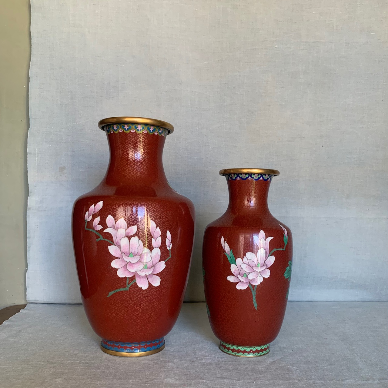 Due vasi a balaustro, smalto su bronzo, decorazione floreale su fondo amaranto. Cina, sec. XX