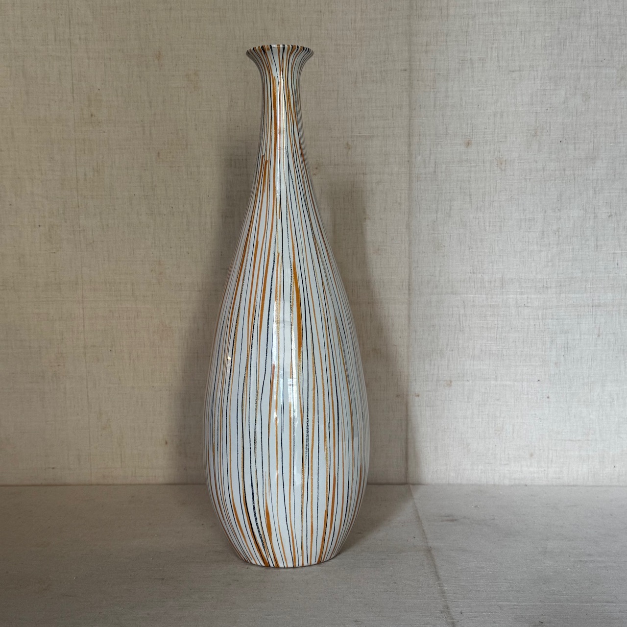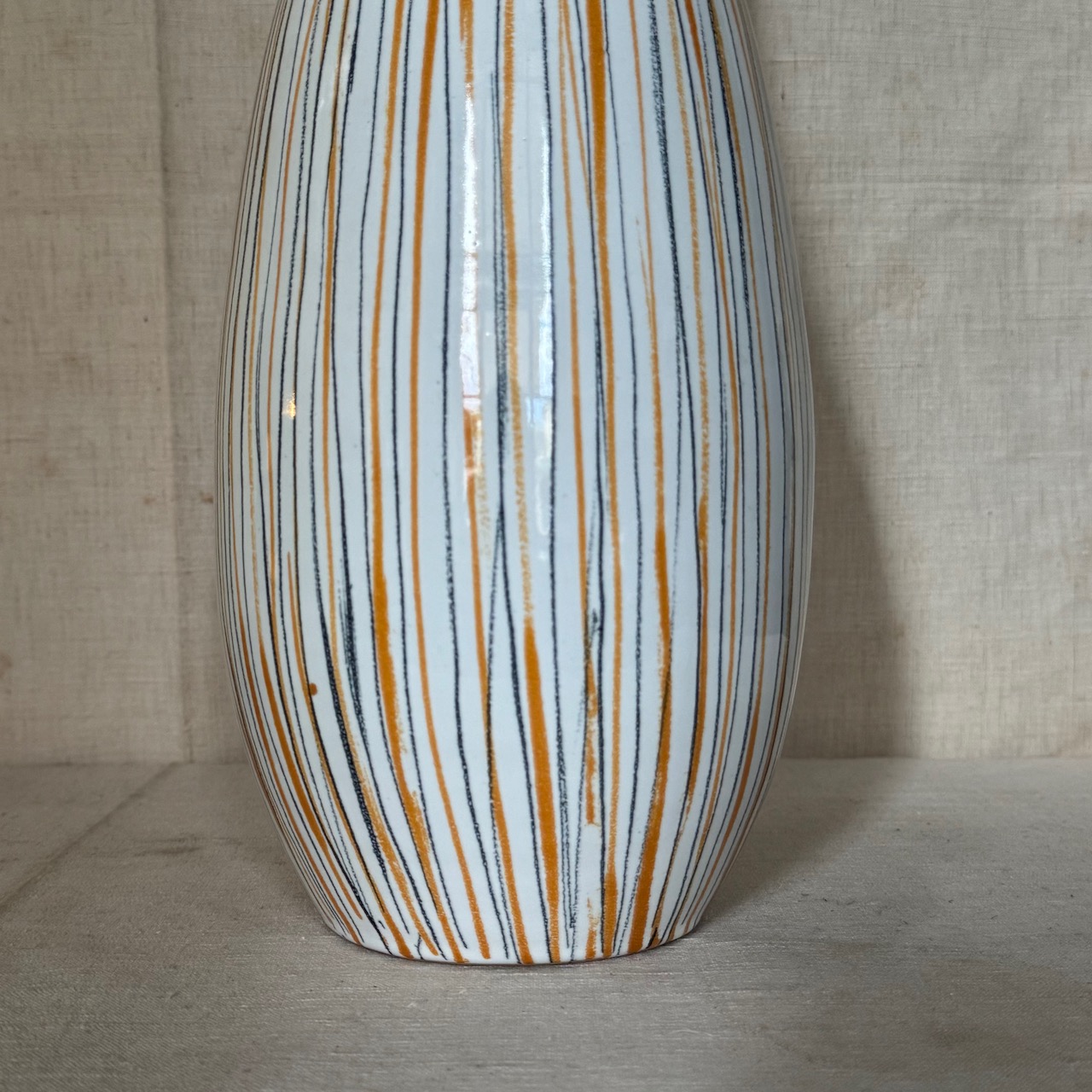 Vaso a tromba in ceramica di Sesto Fiorentino, decoro grafico arancio e blu su fondo latte. Italia, sec. XX