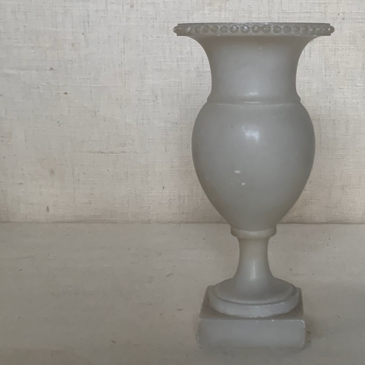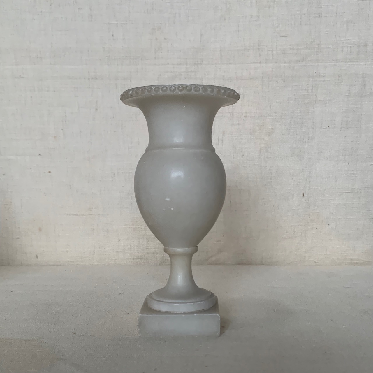 Piccolo vaso a balaustro su base quadrata, profilo perlinato in alabastro. Volterra, sec. XIX