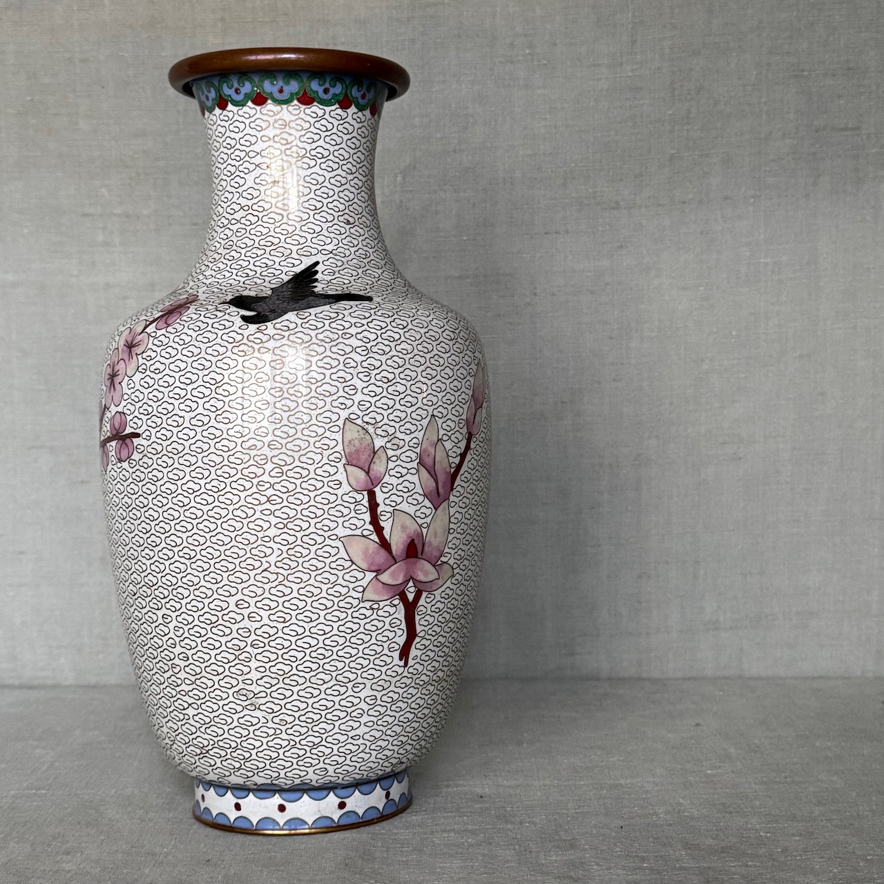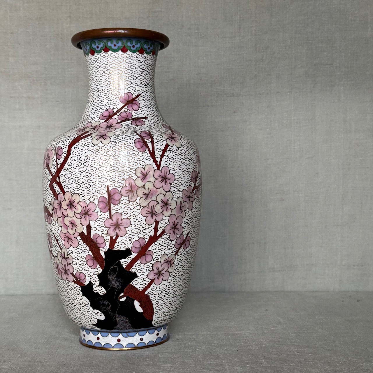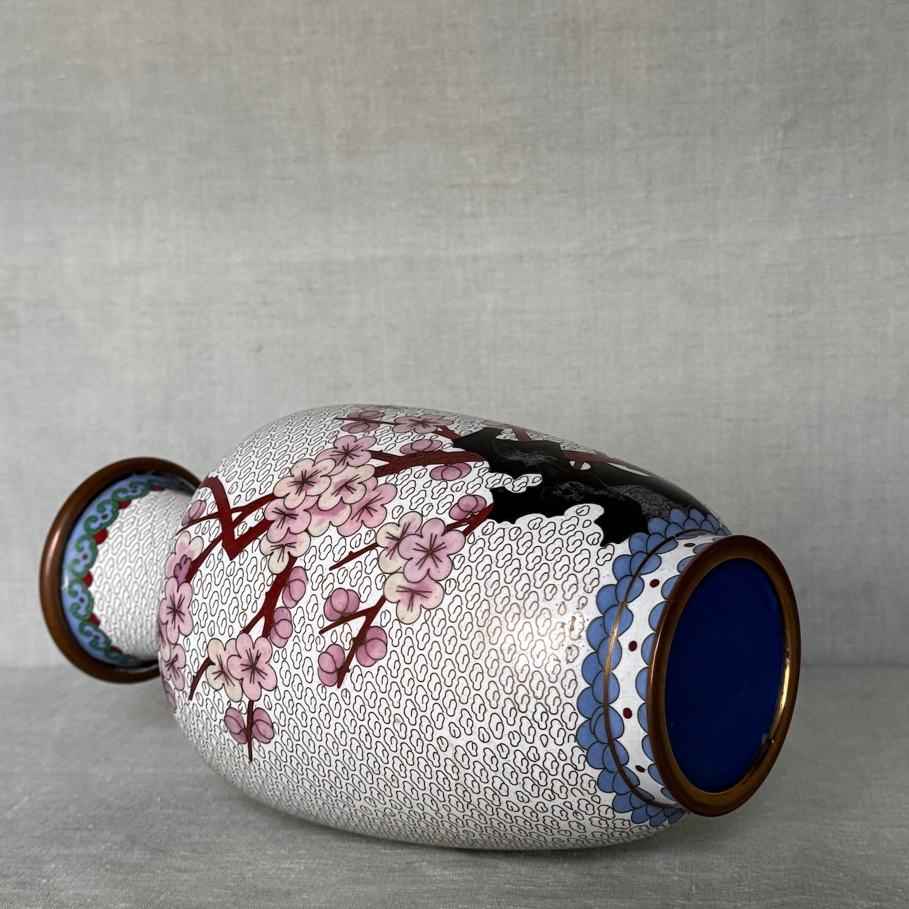 Vaso cloisonné a fondo chiaro, con motivo decorativo a fiori di ciliegio. Cina, sec. XIX