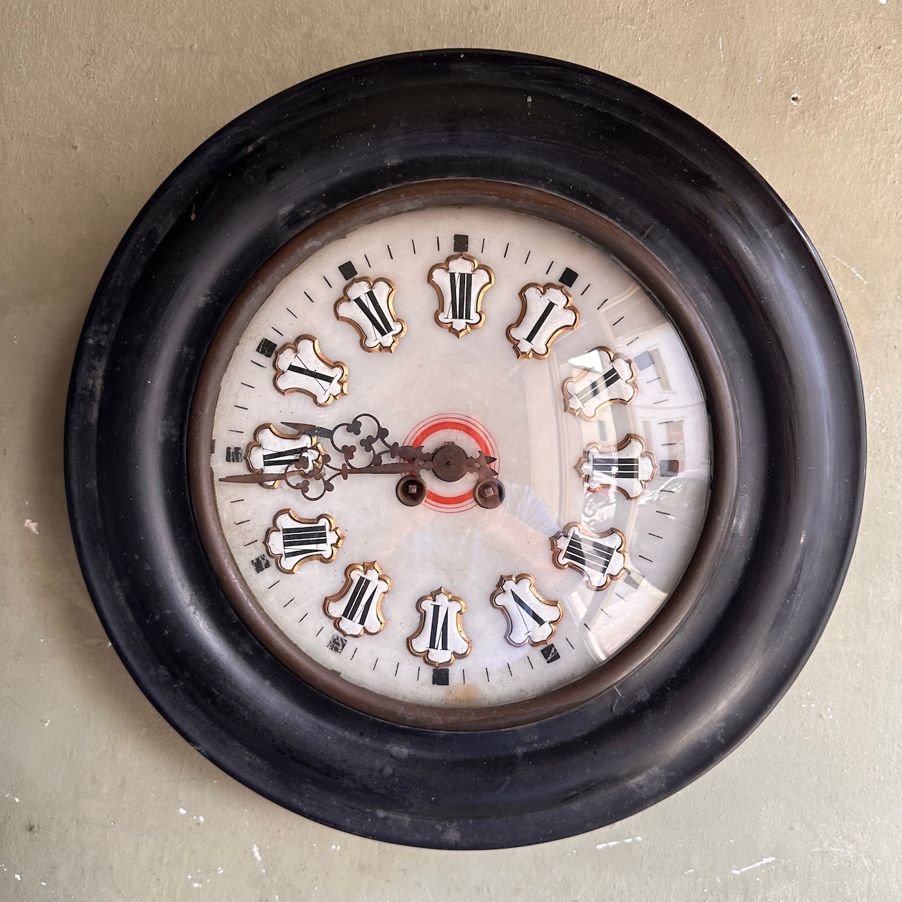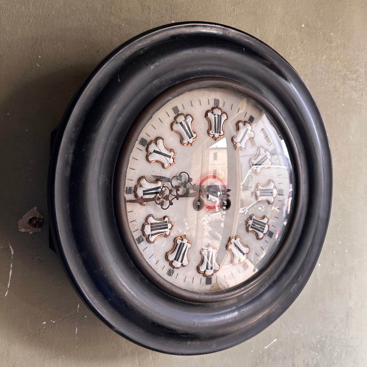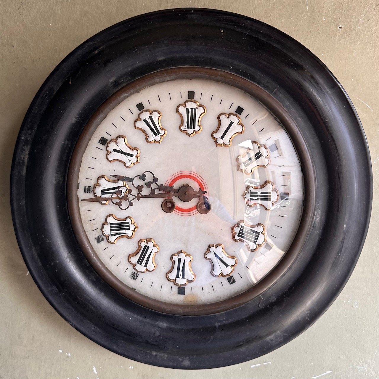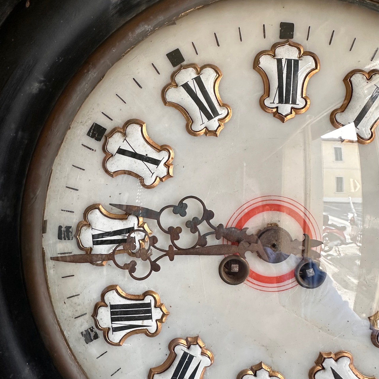 Orologio Occhio di bue a pendolo con numeri romani in smalto su quadrante in marmo bianco di Carrara, cornice ebanizzata. Italia, fine sec. XIX