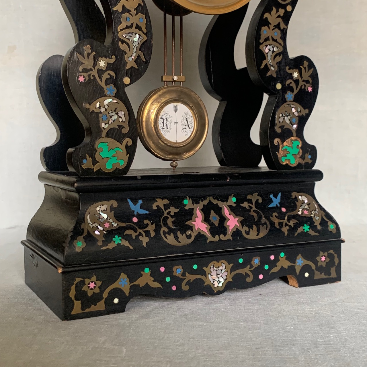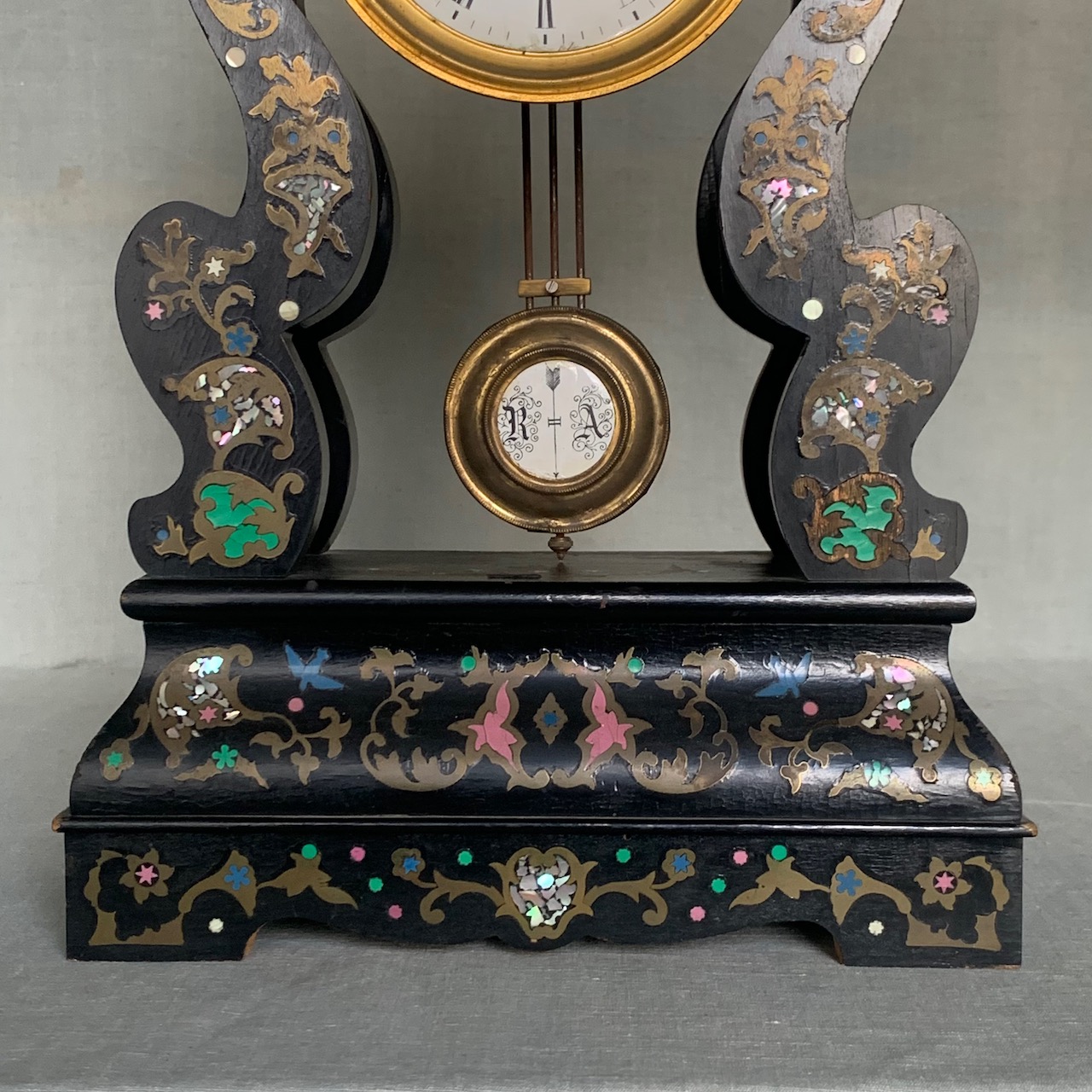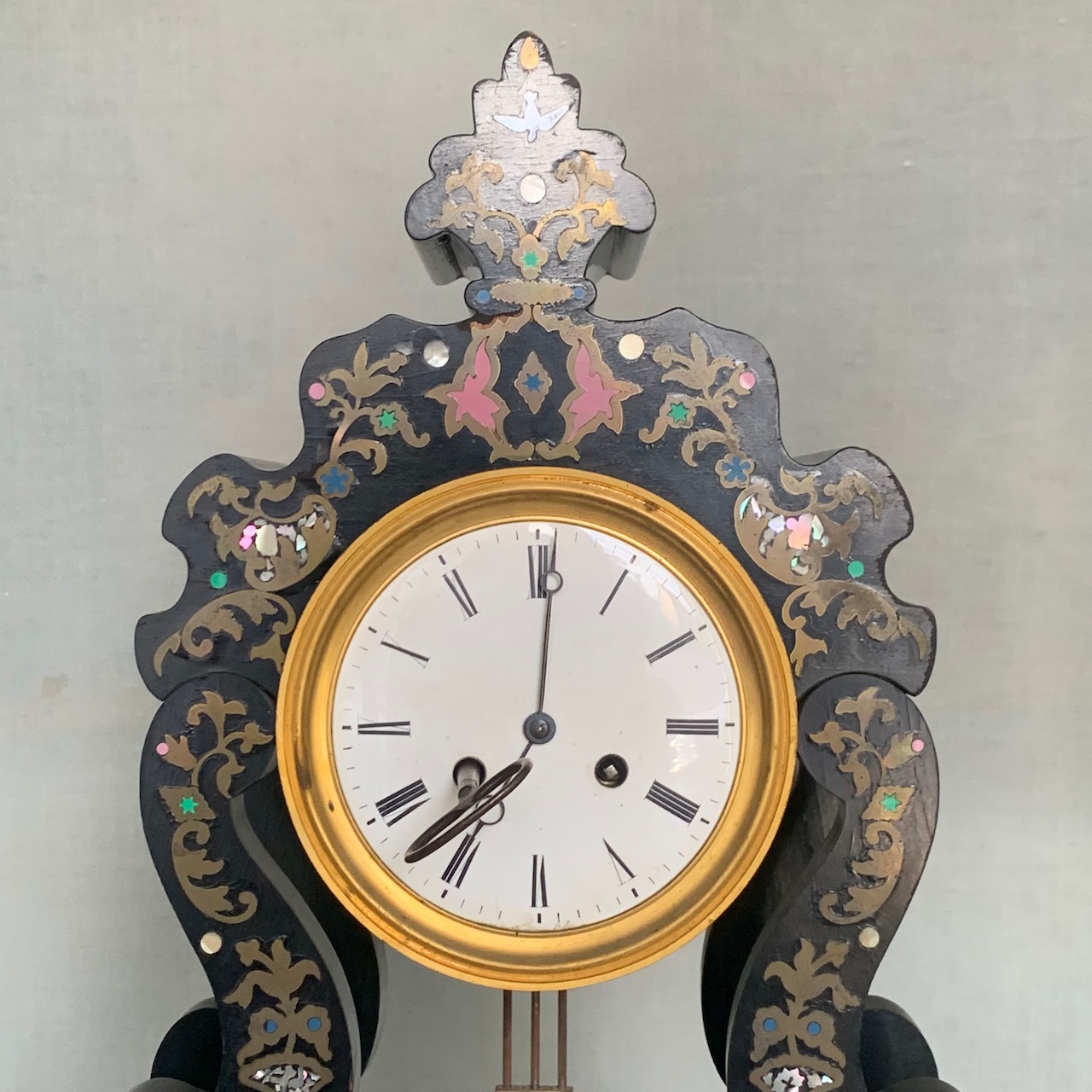Orologio a pendolo, quadrante a smalto con numeri romani, cassa in legno ebano con inclusioni a intarsio in smalto a colore, bronzo e madreperla. Francia, sec. XIX