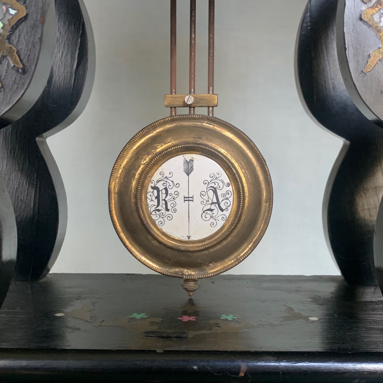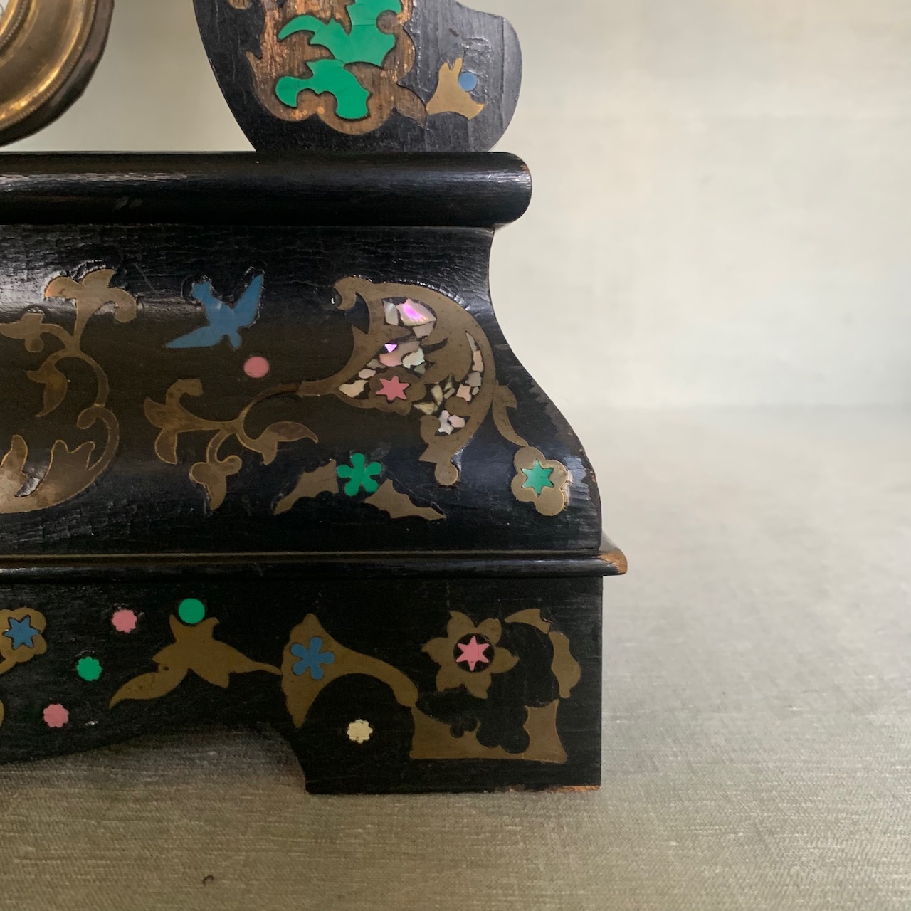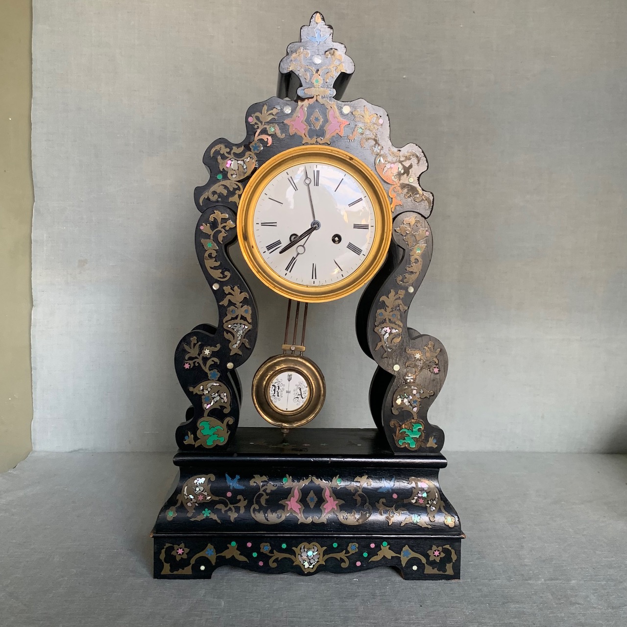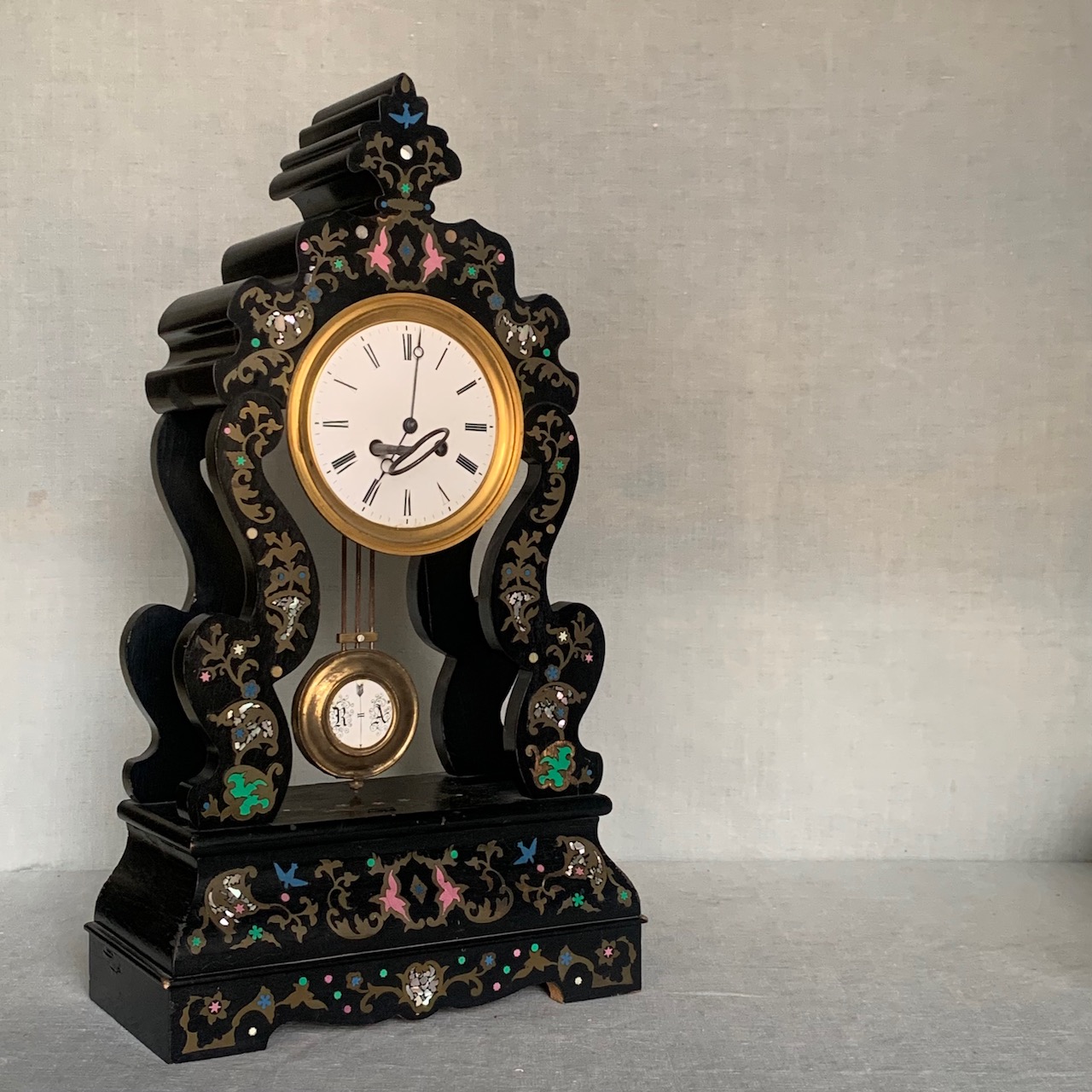 Orologio a pendolo, quadrante a smalto con numeri romani, cassa in legno ebano con inclusioni a intarsio in smalto a colore, bronzo e madreperla. Francia, sec. XIX