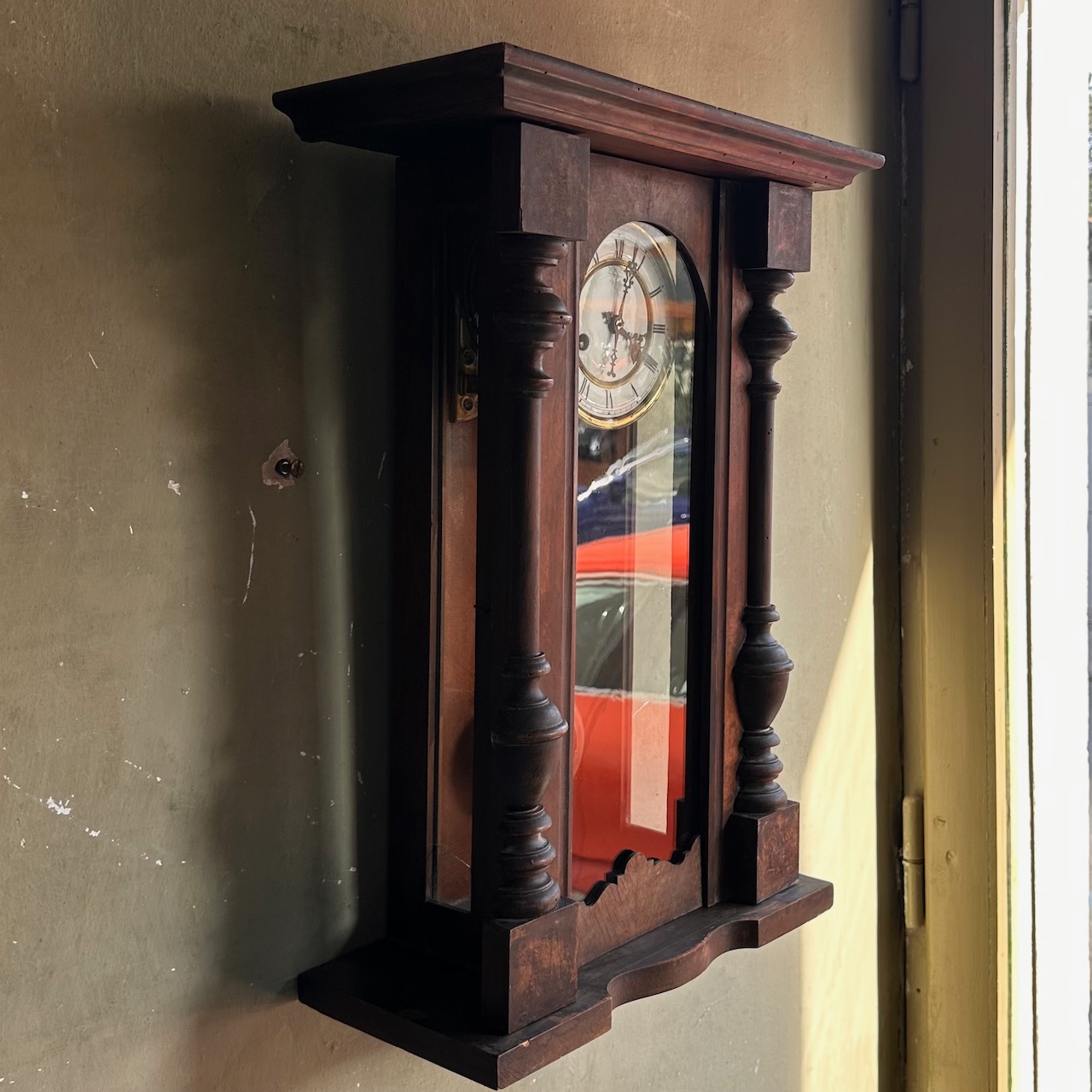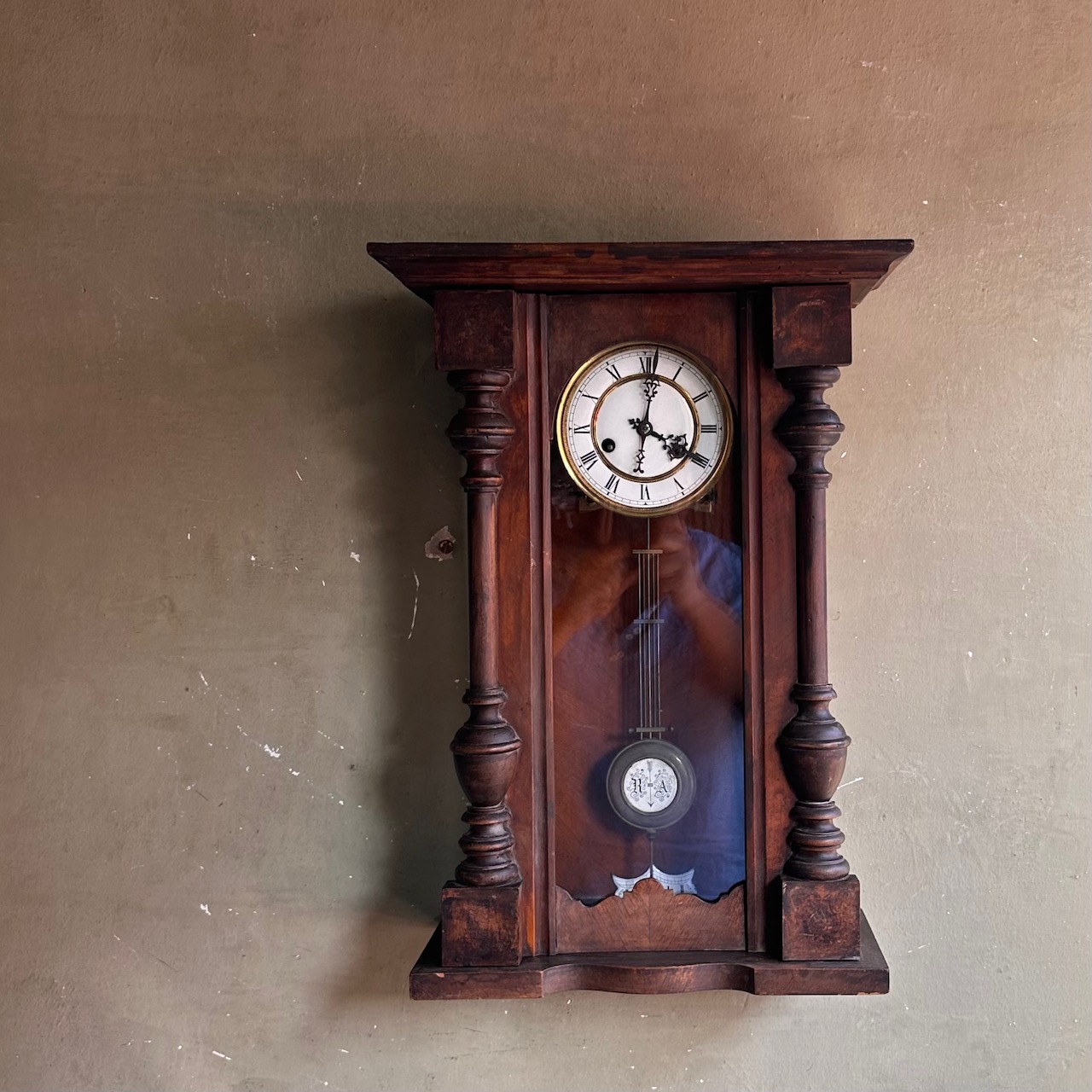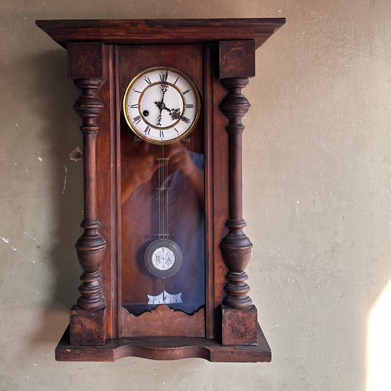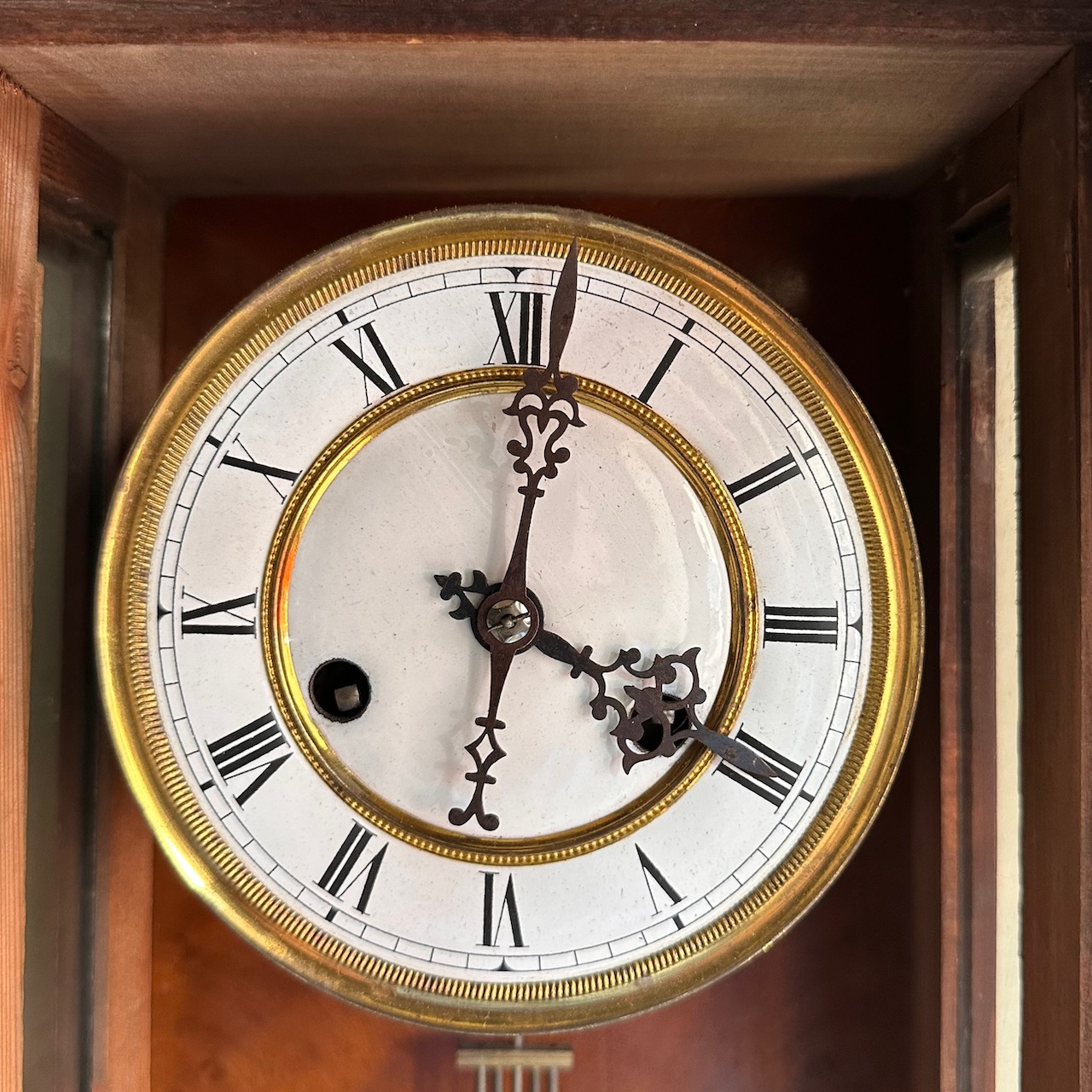 Orologio a pendolo in noce a patina bruna, sostegni laterali a mezze colonne tornite, quadrante con numeri romani, pendolo in lamina di bronzo e disco centrale in ceramica smaltata bianca. Germania, sec. XX
