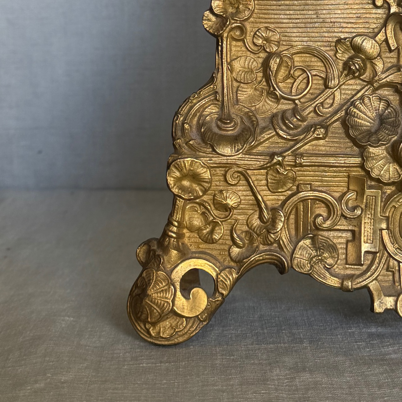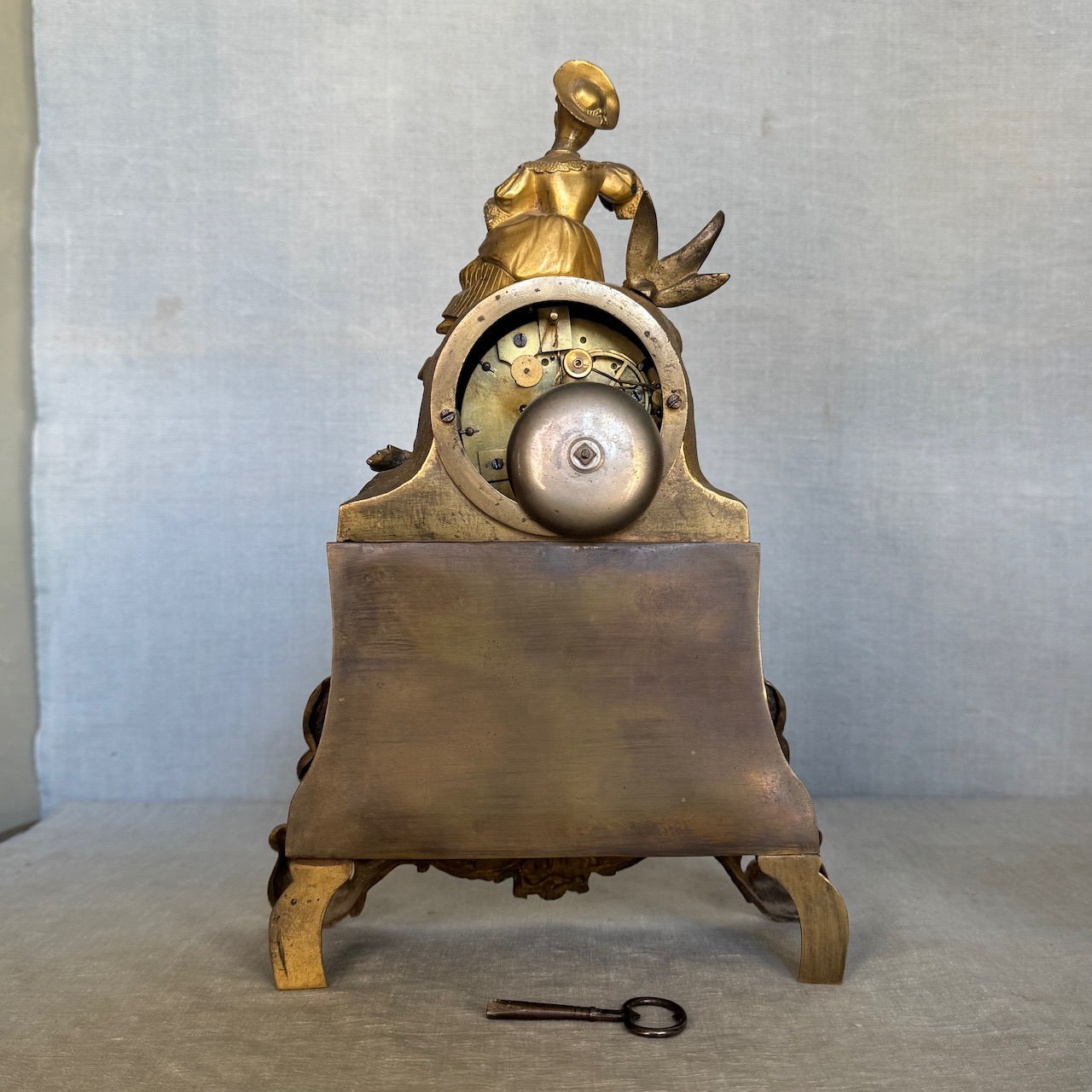 Orologio da tavolo in bronzo dorato scolpito, figura femminile nella parte superiore, quadrante in maiolica bianca con numeri romani. Italia, sec. XX