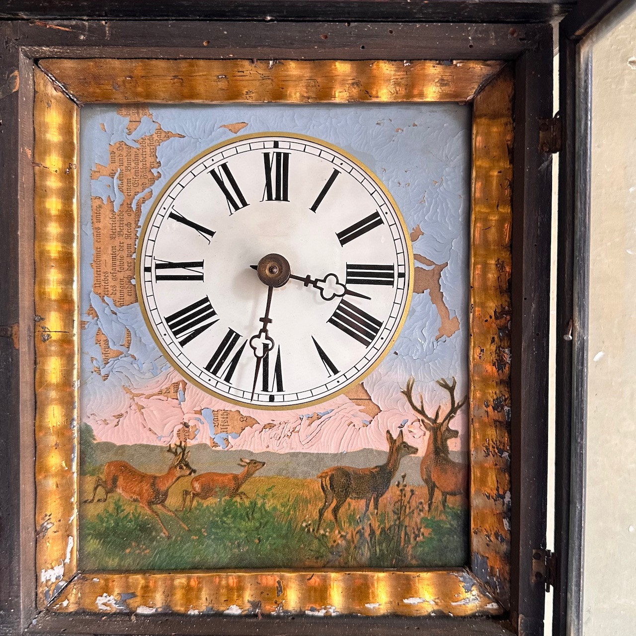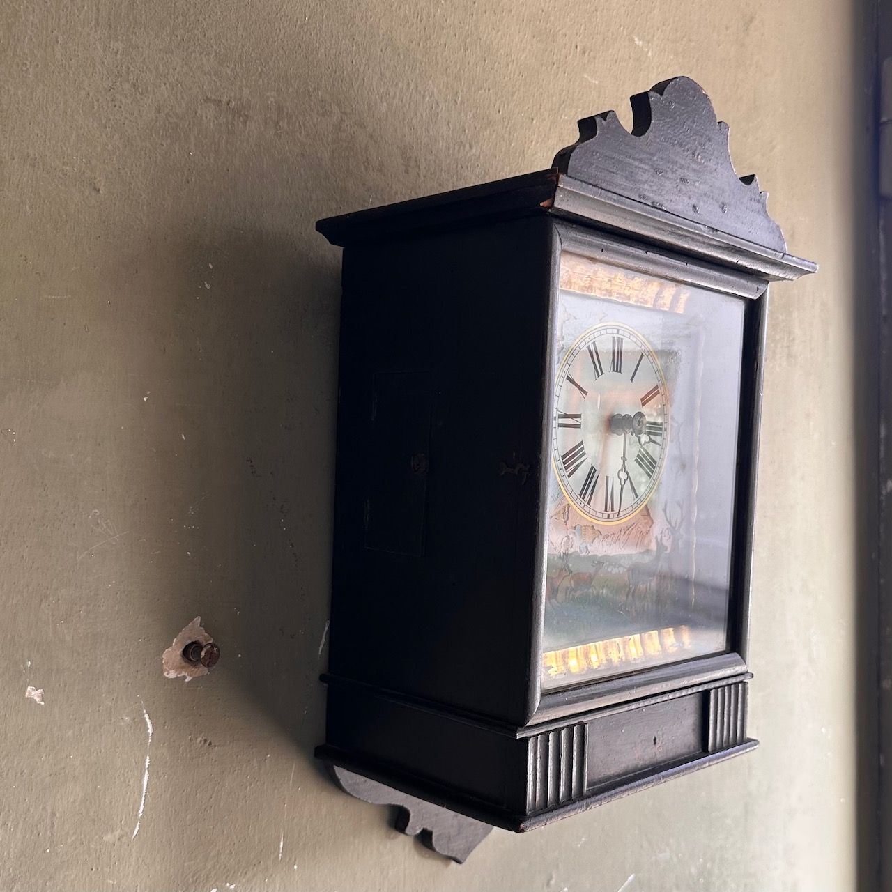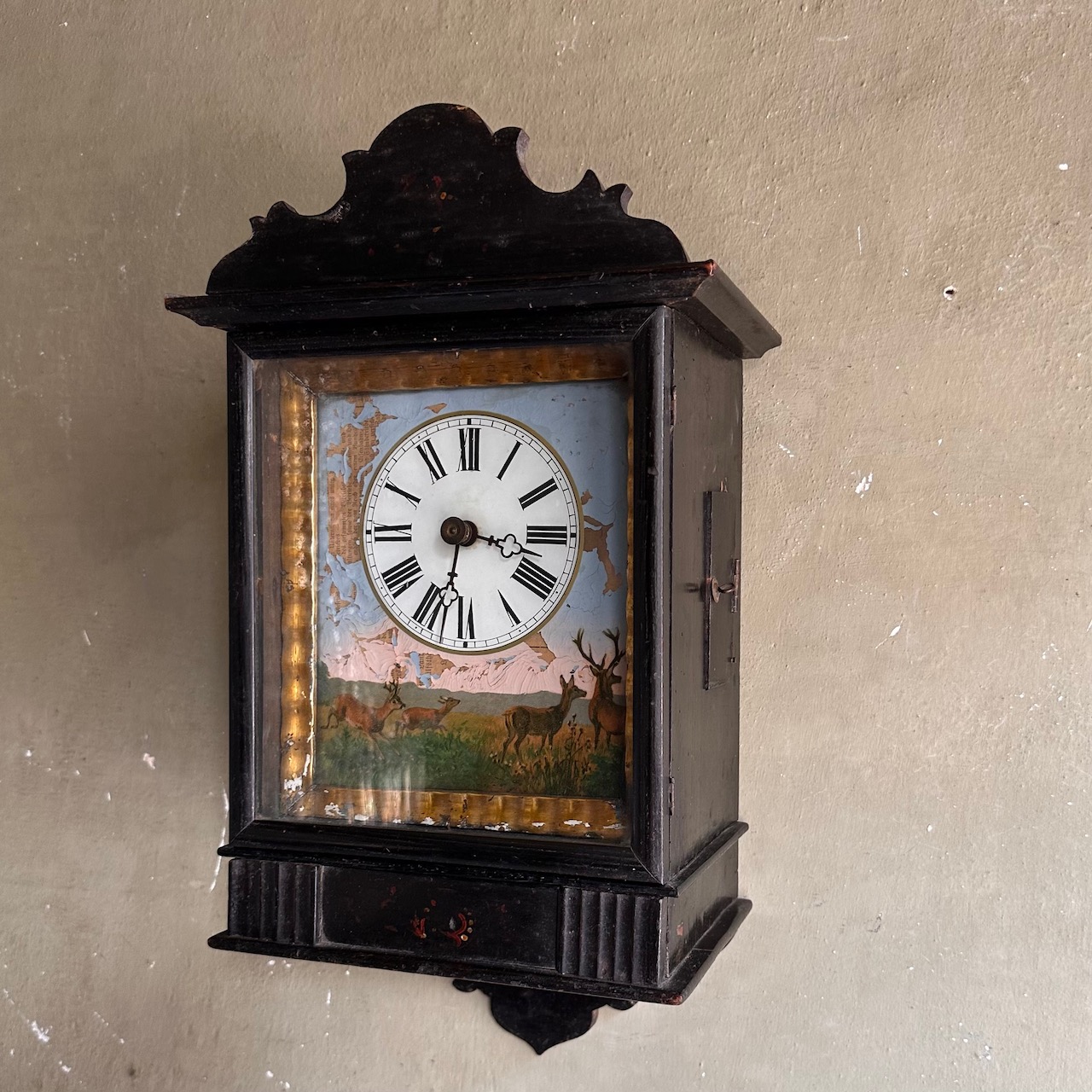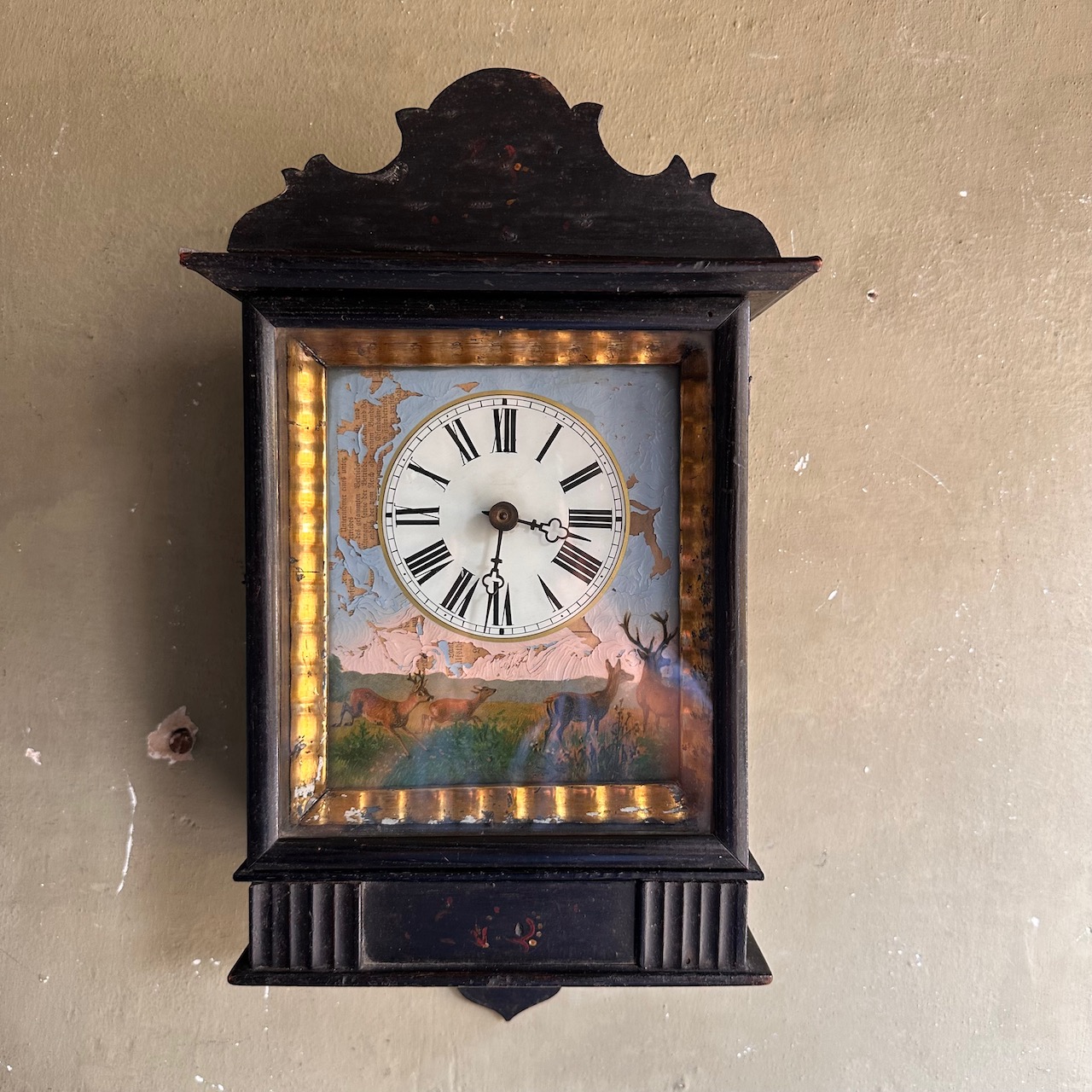 Orologio pensile in legno ebanizzato decorato con cervi in cornice dorata