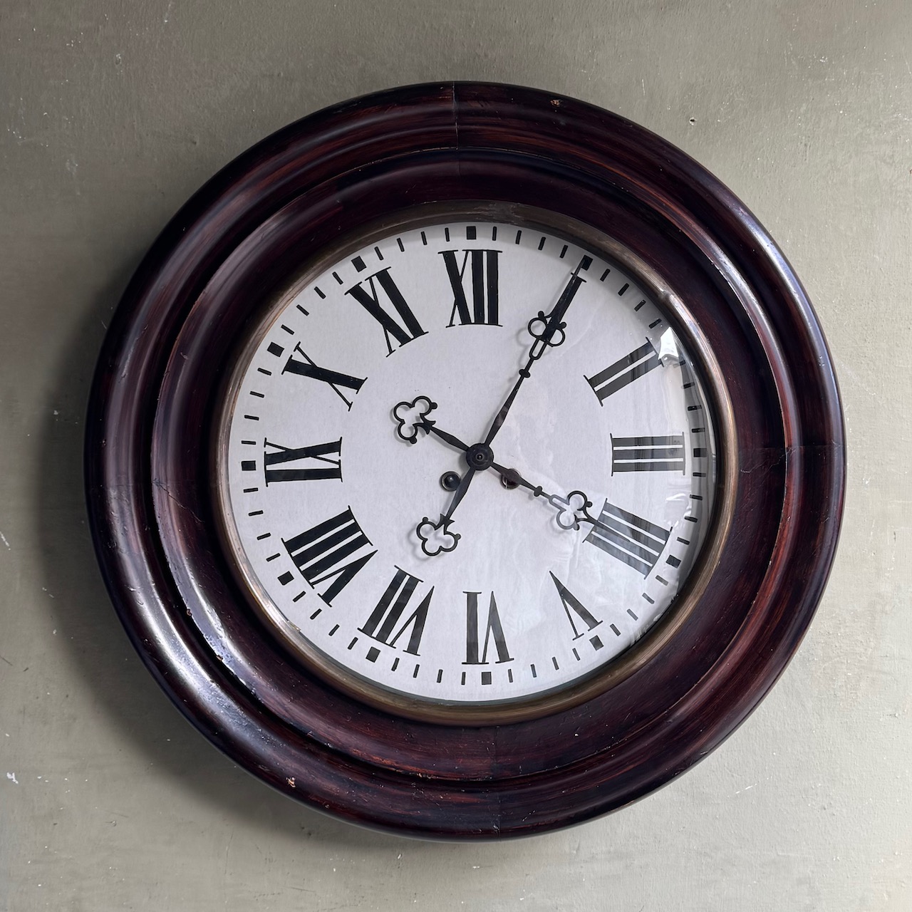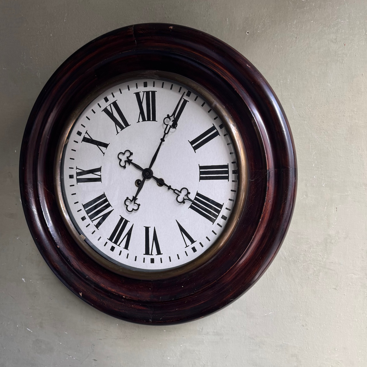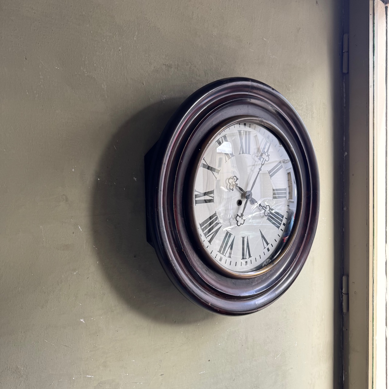 Orologio da parete occhio di bue cornice in legno di noce, quadrante e numeri in metallo smaltato, Stazione Maria Antonia. Firenze, metà sec. XIX