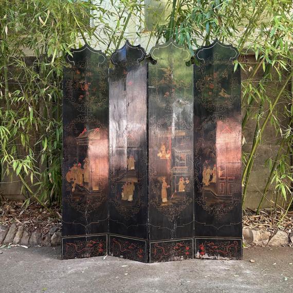 Paravento Cina in Legno Laccato Nero a Chinoiserie