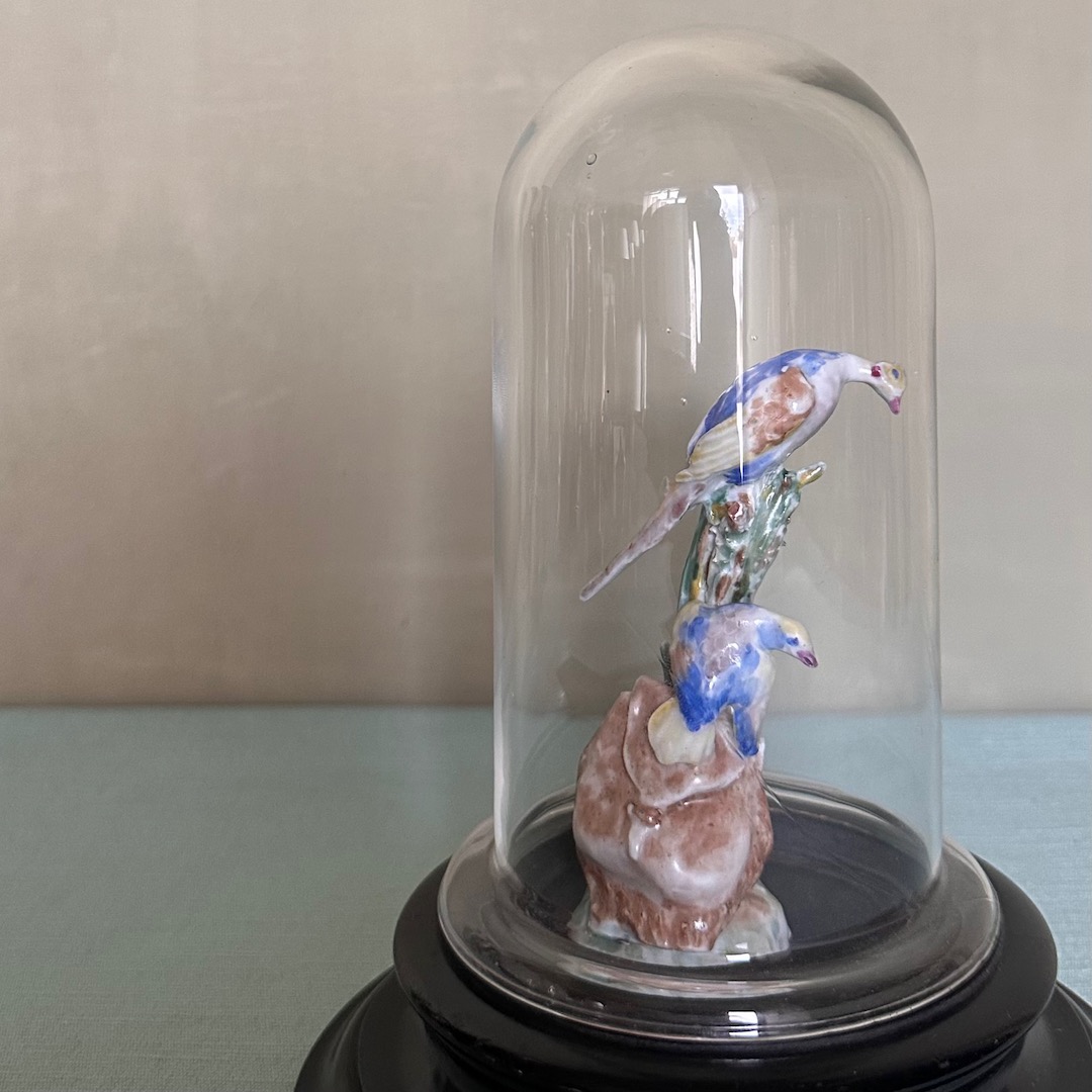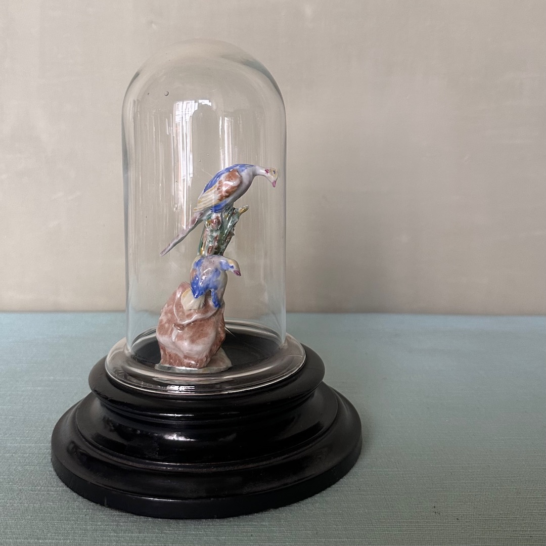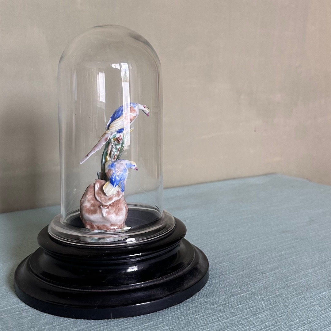 Gruppo scultoreo Fagiani in porcellana sotto piccola campana in vetro soffiato su base ebanizata. Italia, sec. XIX