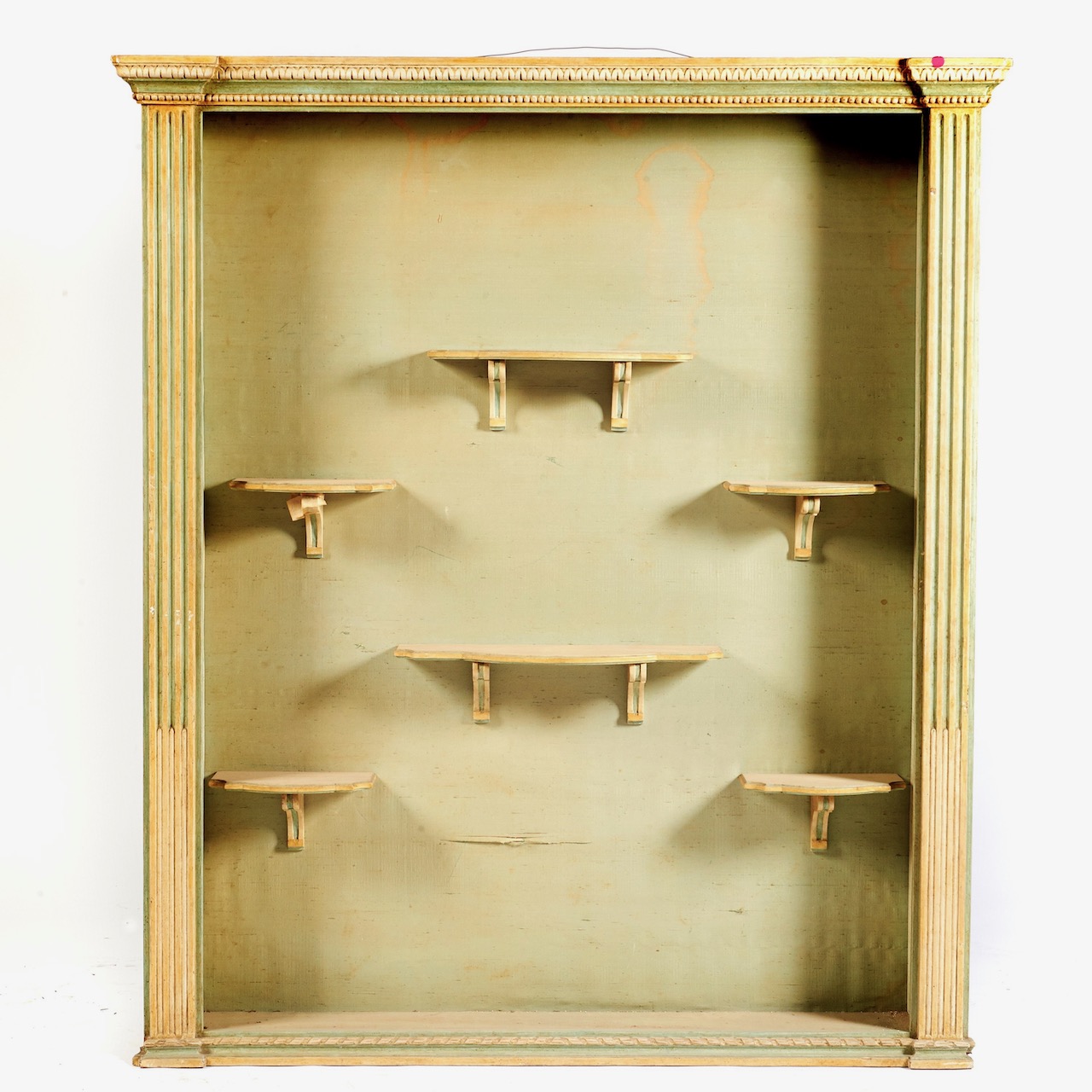 Teca da incastro in legno laccato verde e oro, cinque ripiani, fondo rivestito in stoffa. Italia, sec. XX
