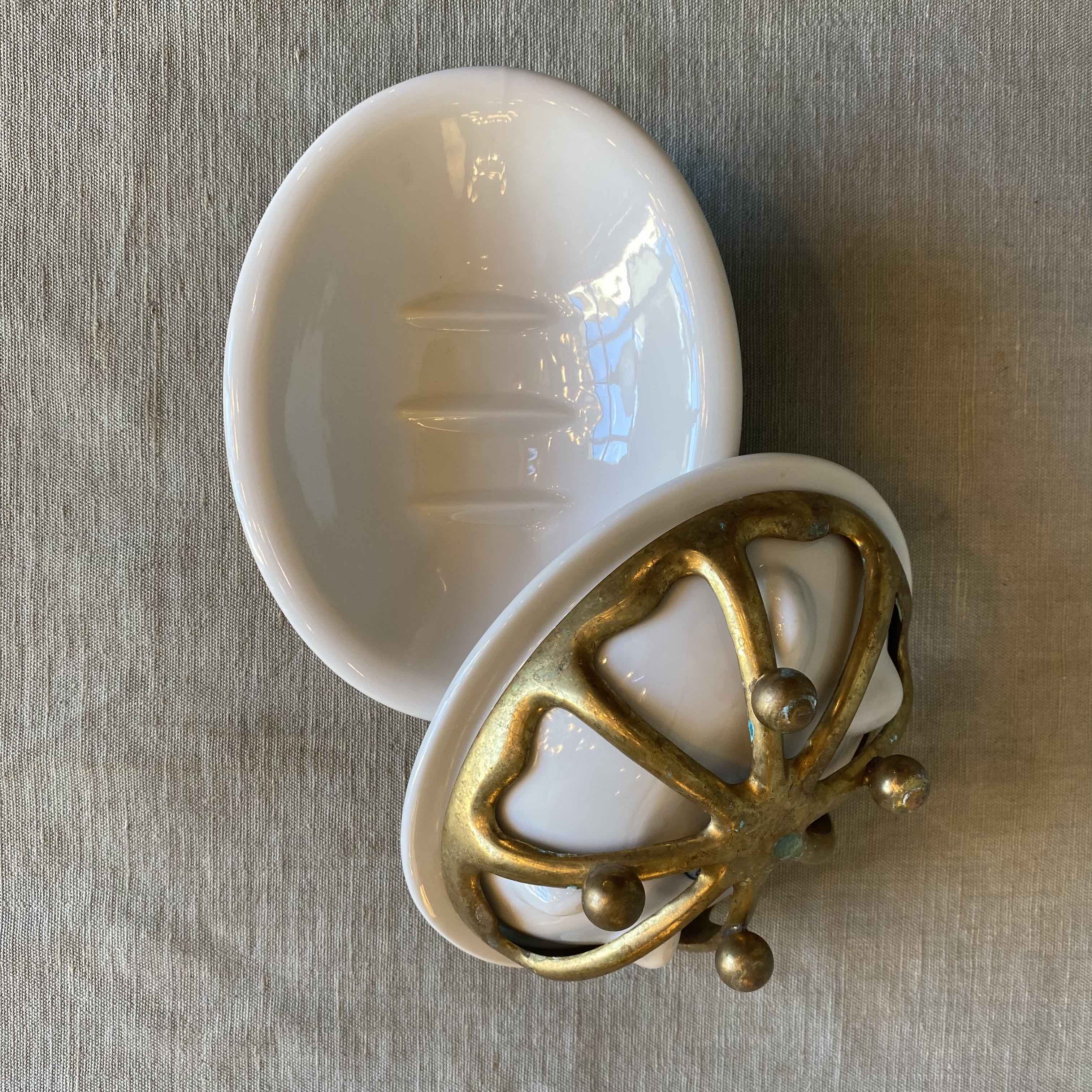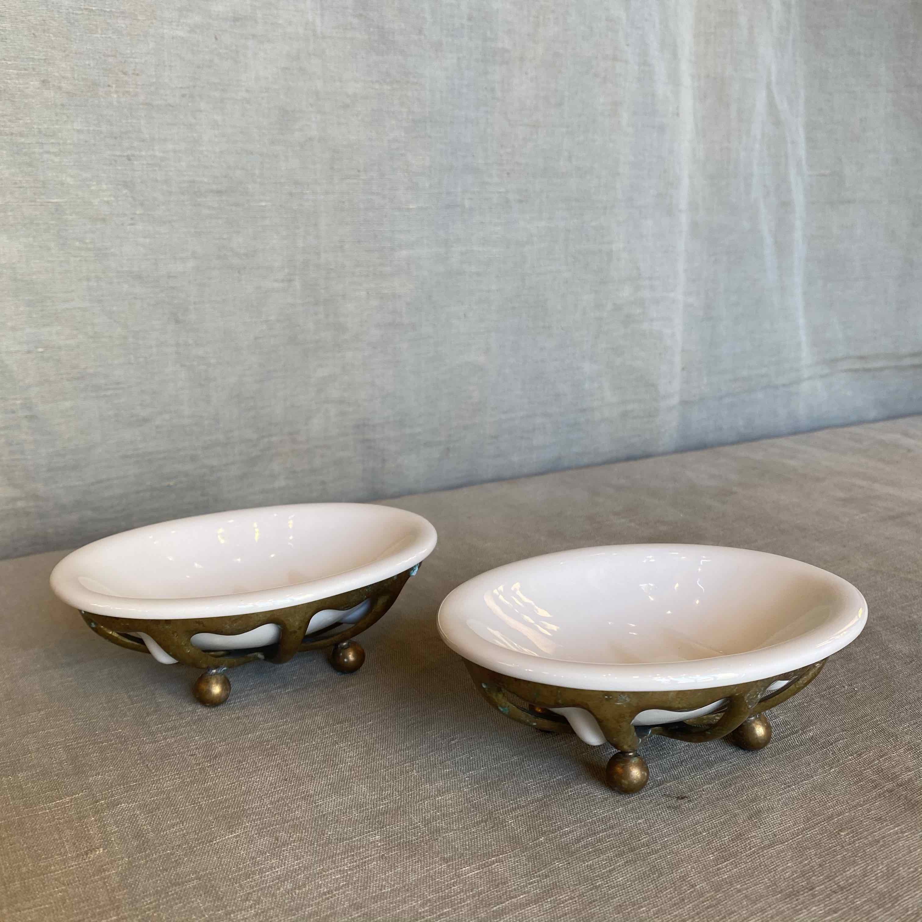 Coppia Portasapone da piano in bronzo patinato con vaschetta in Porcellana bianca. Italia, sec. XX