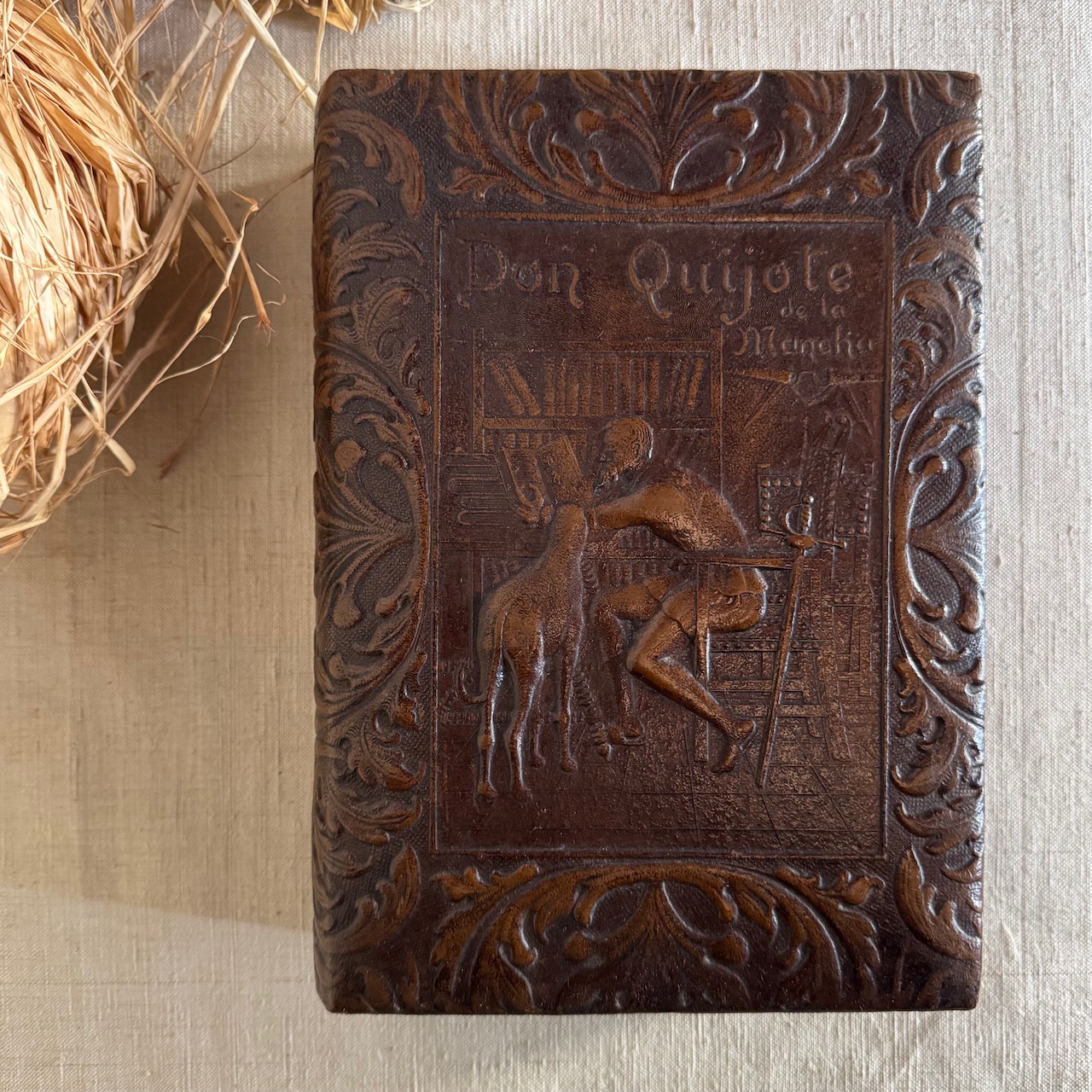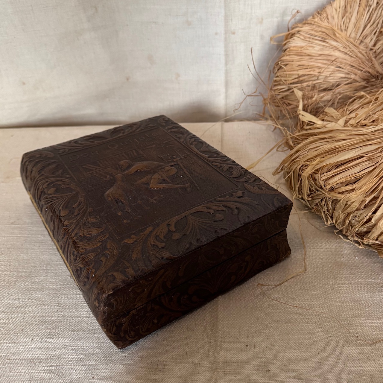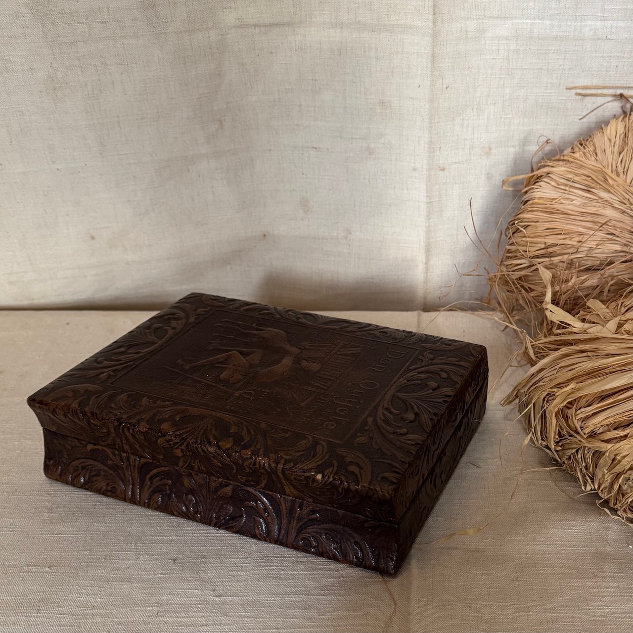 Libro Cofanetto porta sigari in pelle con immagine di Don Chisciotte sulla copertina anteriore e decorazione a tralci di foglia d acanto in rilievo su costola e retro. Spagna, 1930 ca